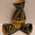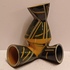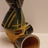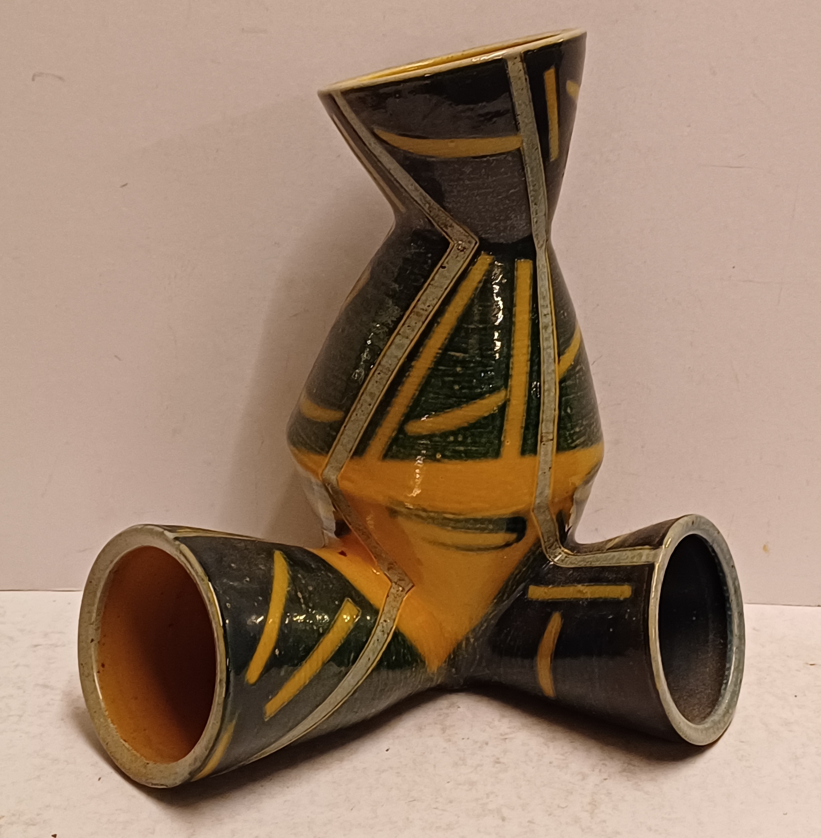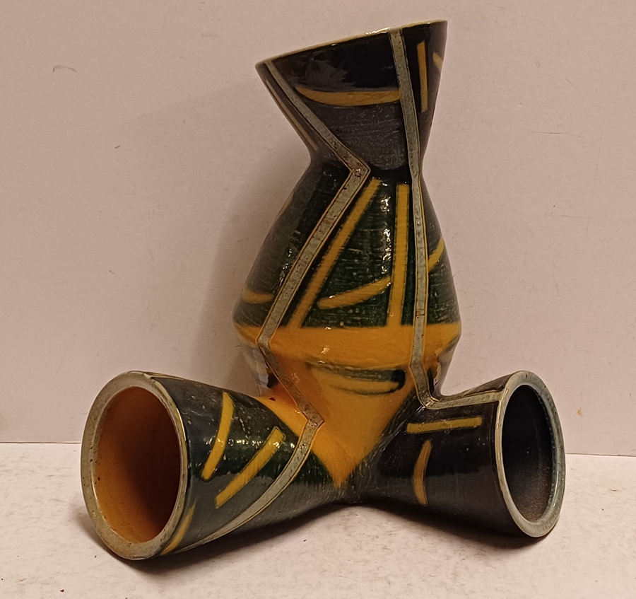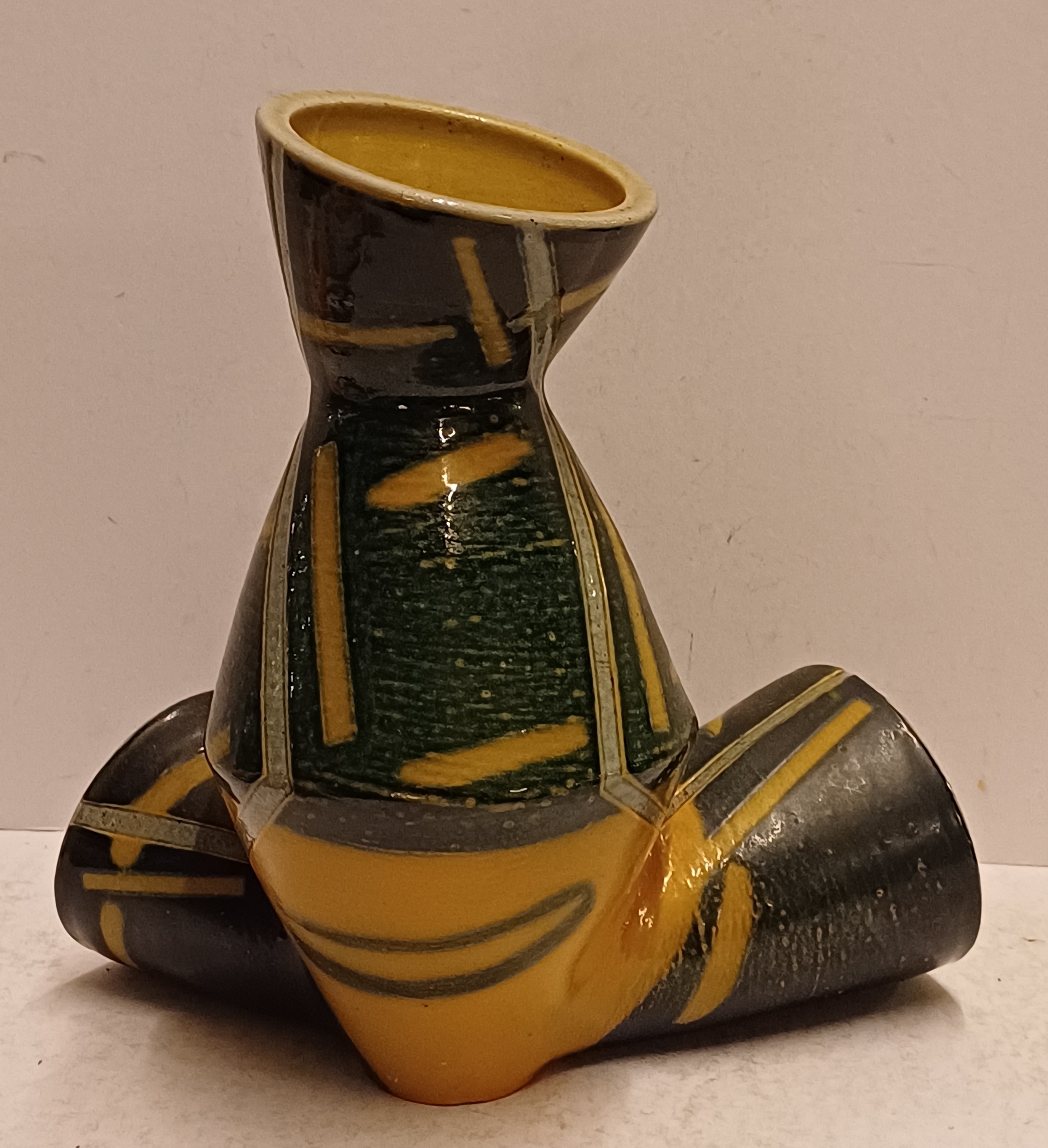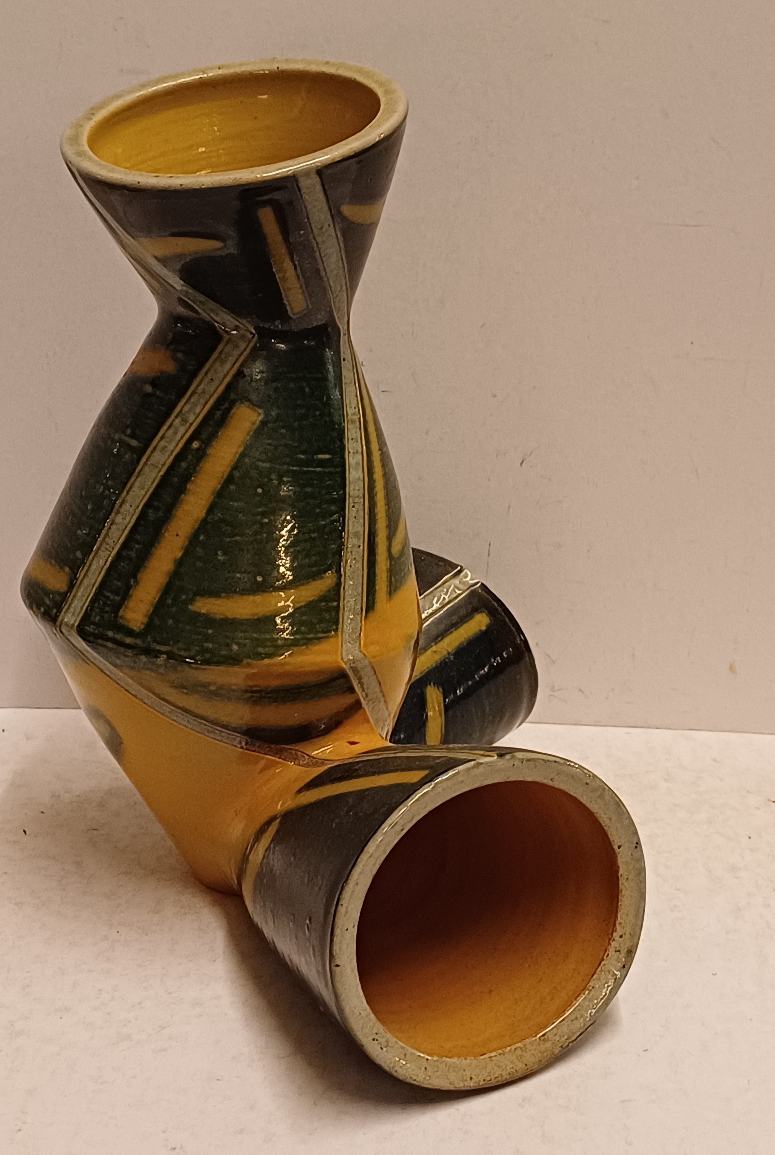 Steengoed Torso vaas met zoutglazuur, geometrisch decoratie in geel en grijs. Voluit gesigneerd en gedateerd '90.