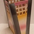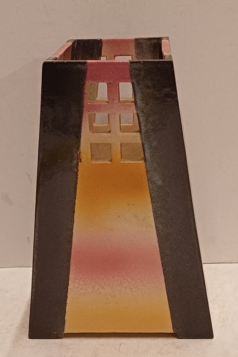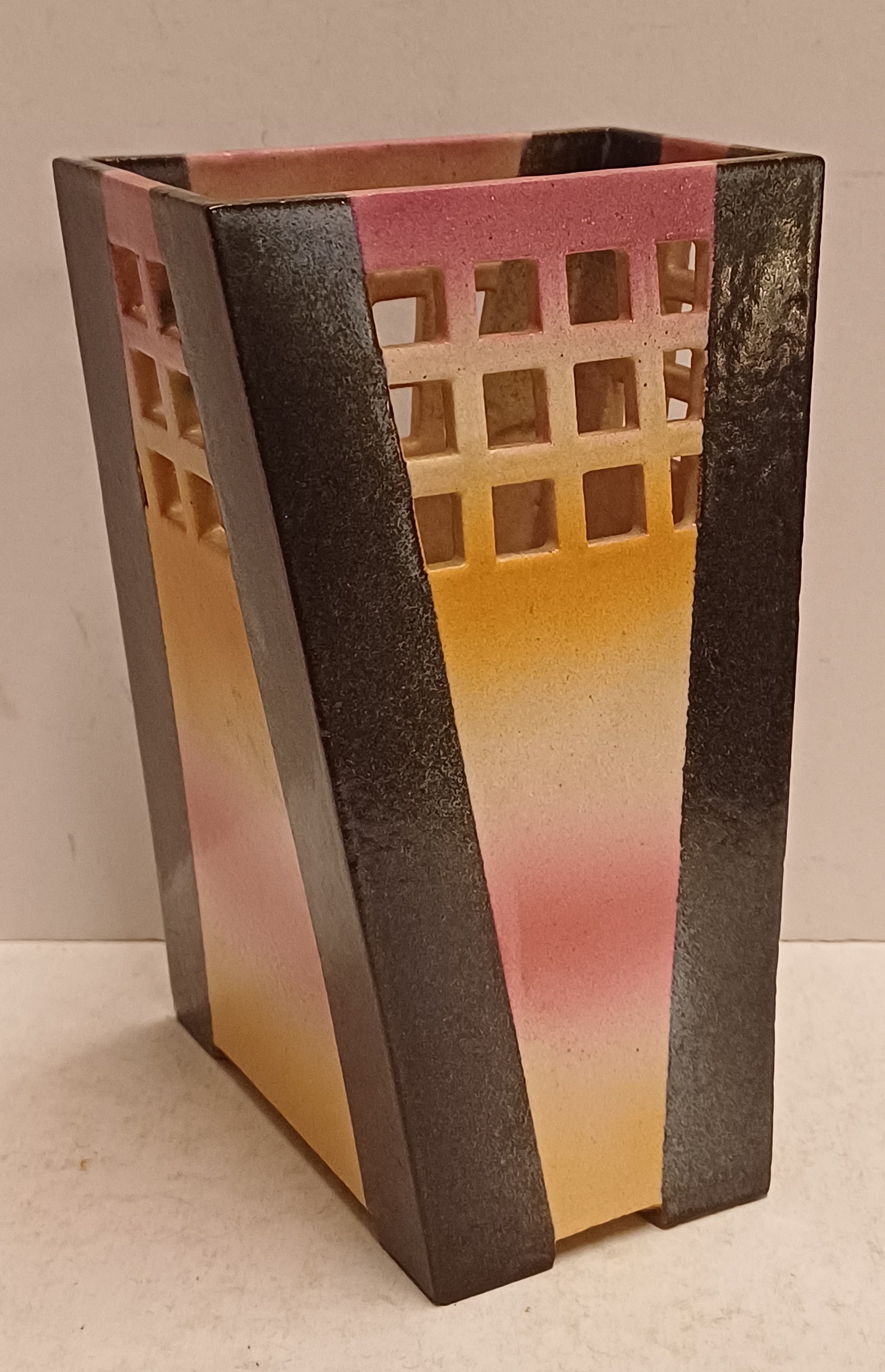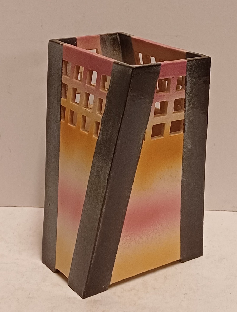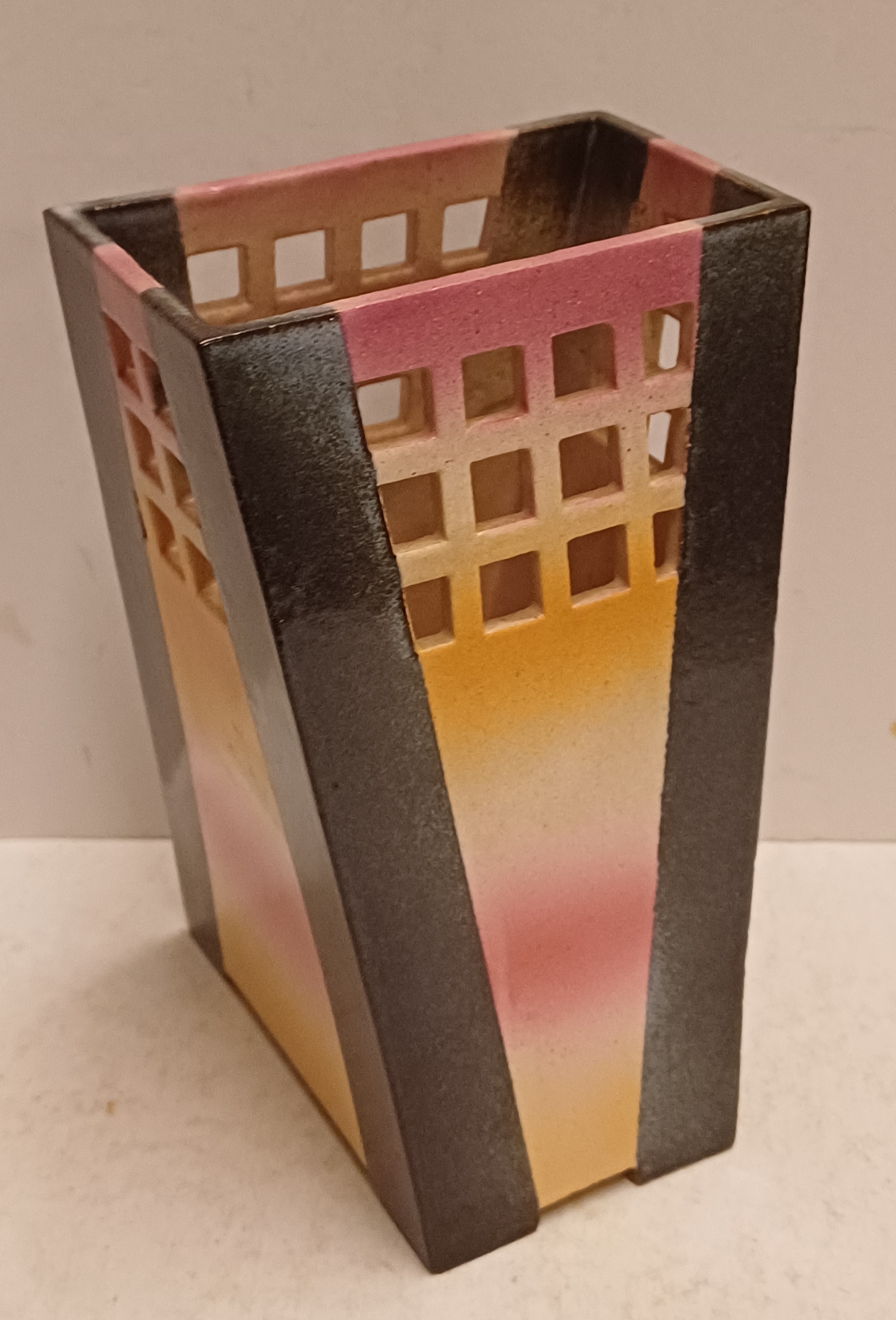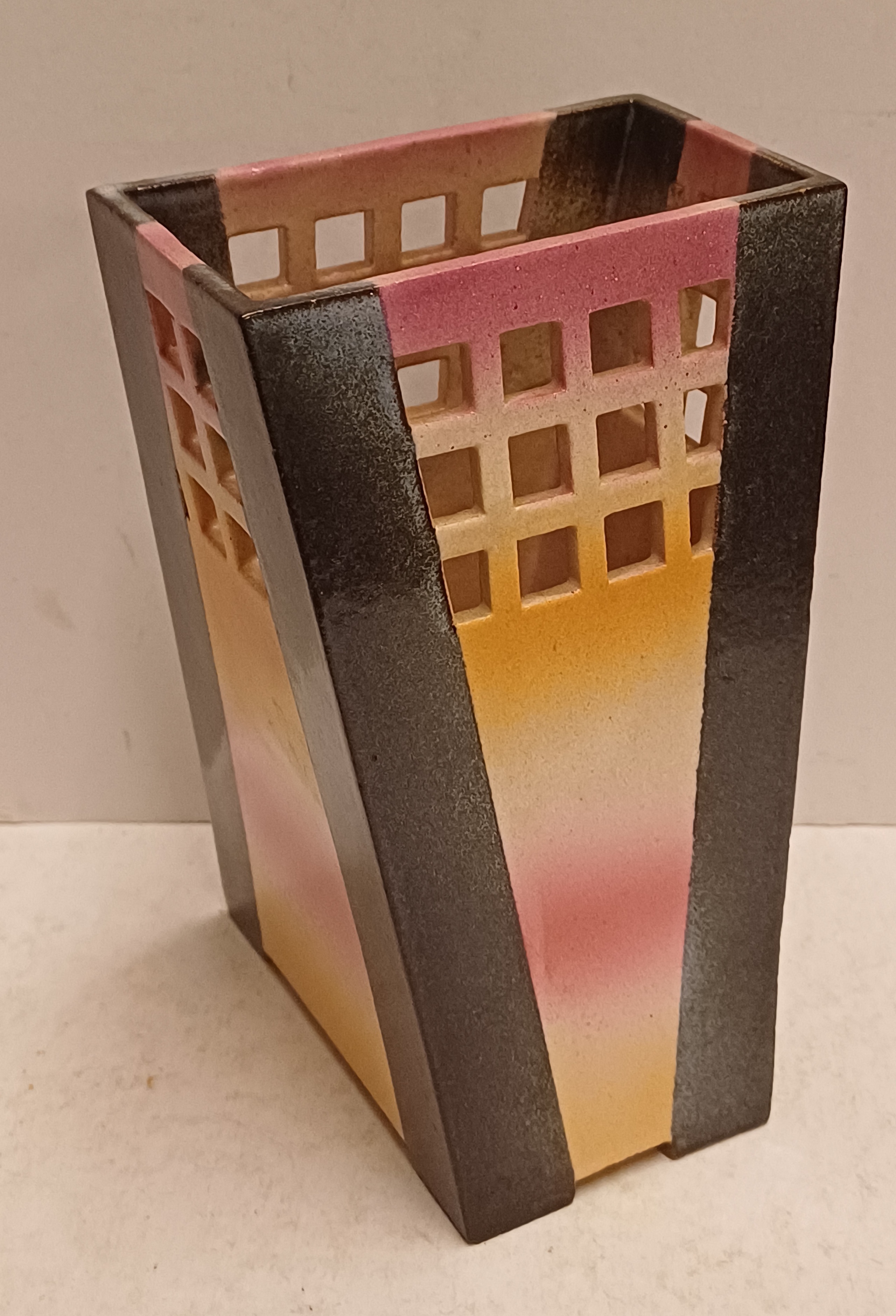 Earthenware vase with sprayed glaze and openwork lattice along the top edge. Bottom not signed.
