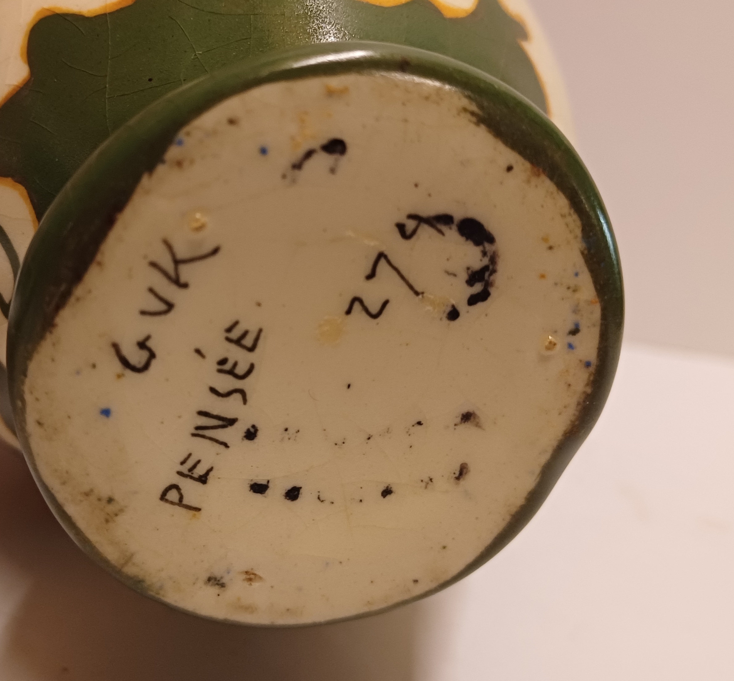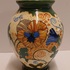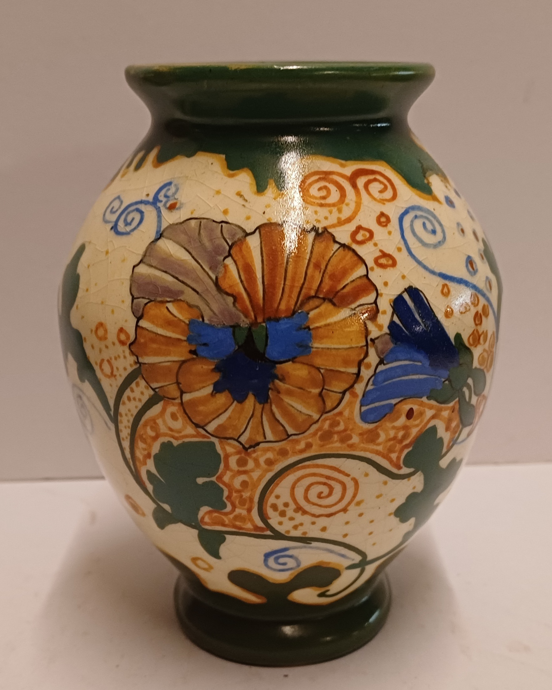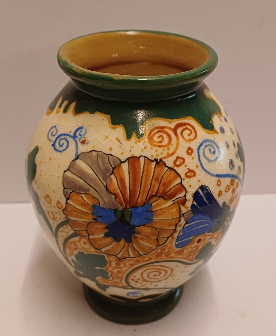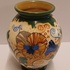 Faience vase with floral Pensee decor. Bottom with factory mark.