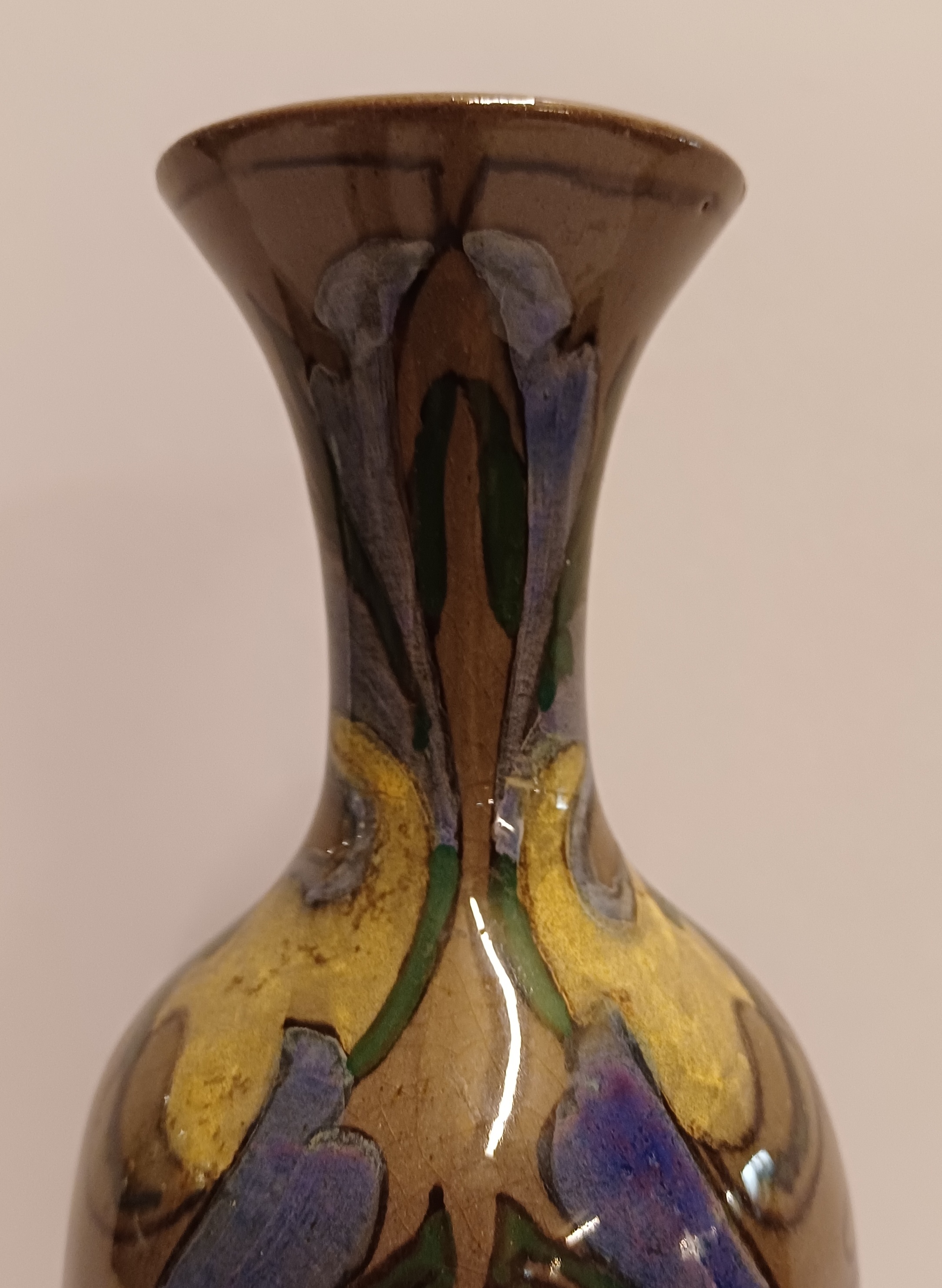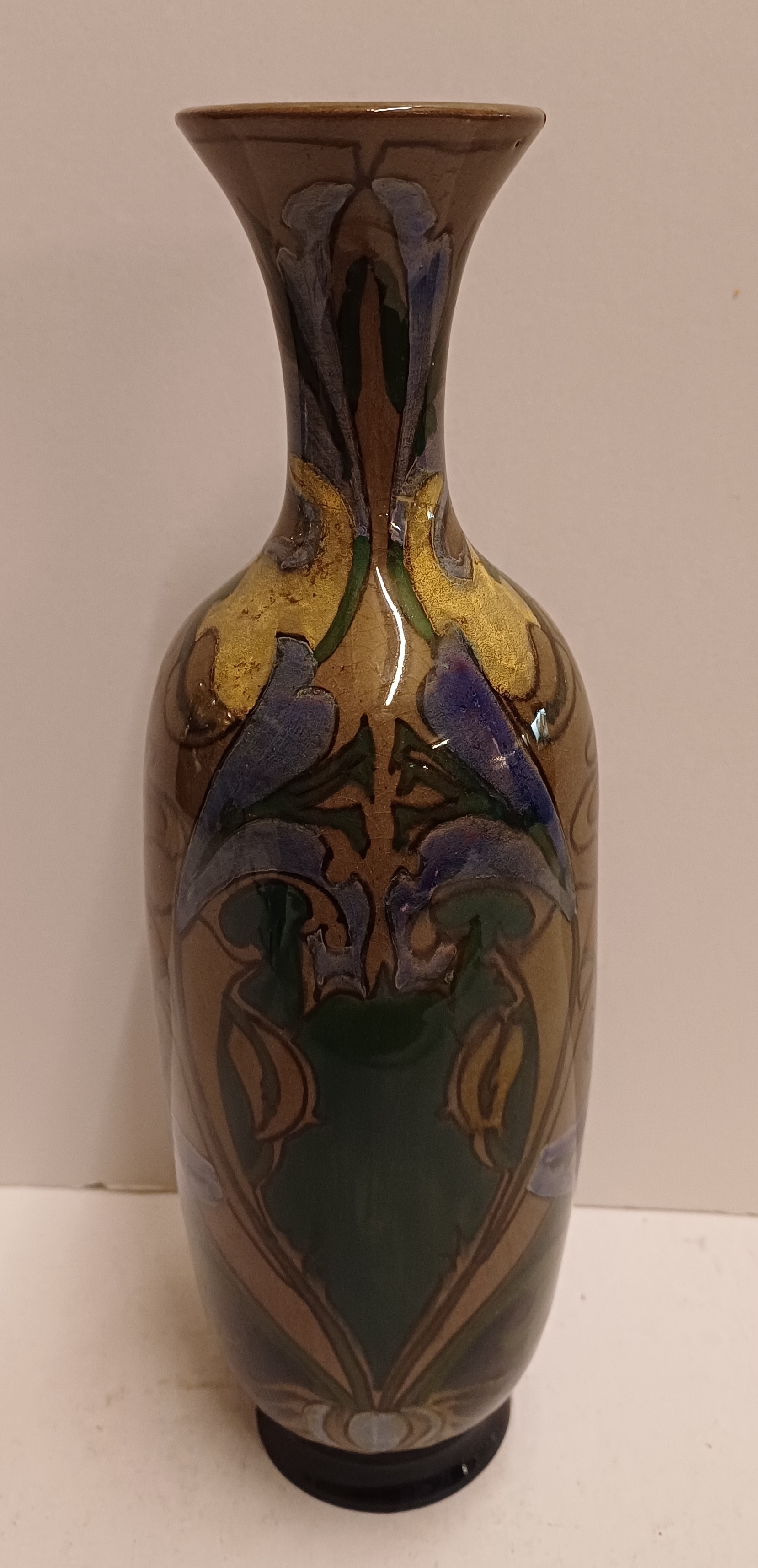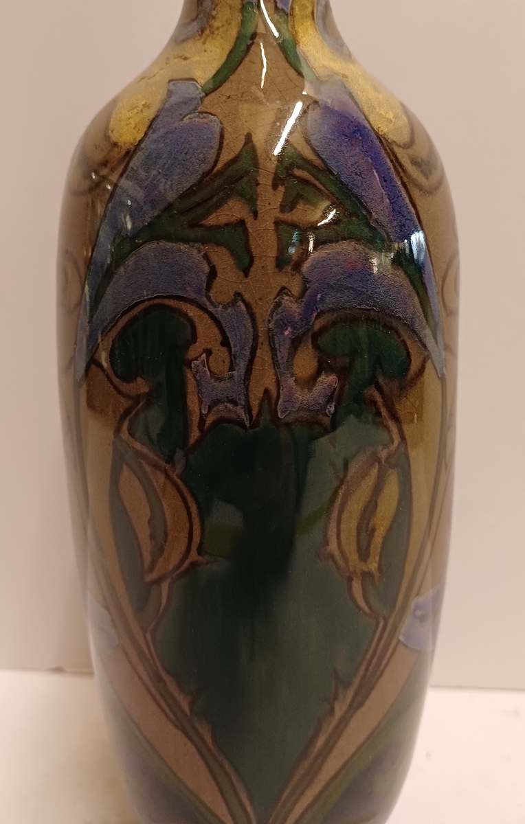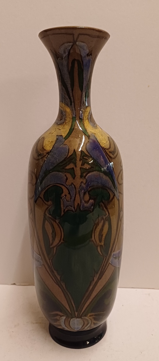 Early elongated vase with stylized floral decor on a brown background. Bottom with painted factory mark.