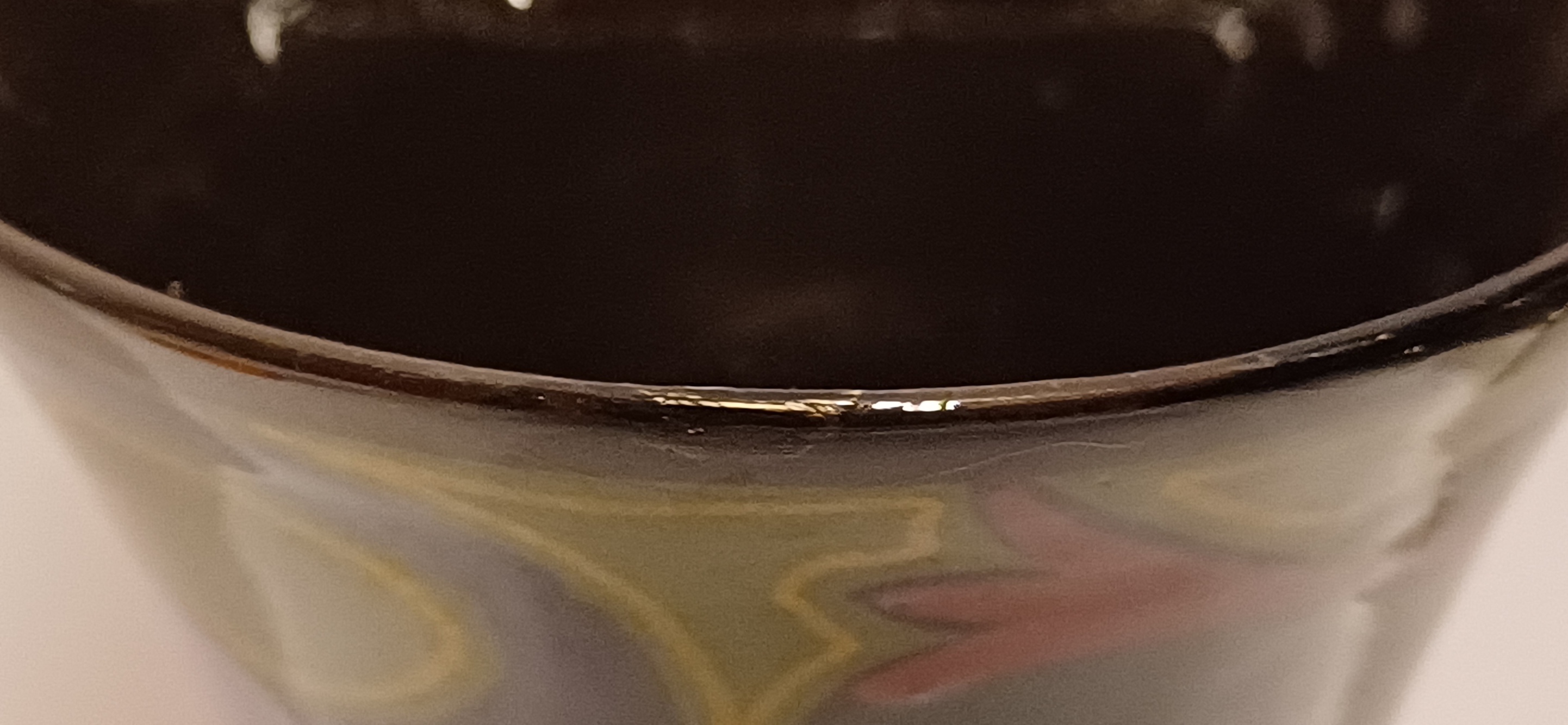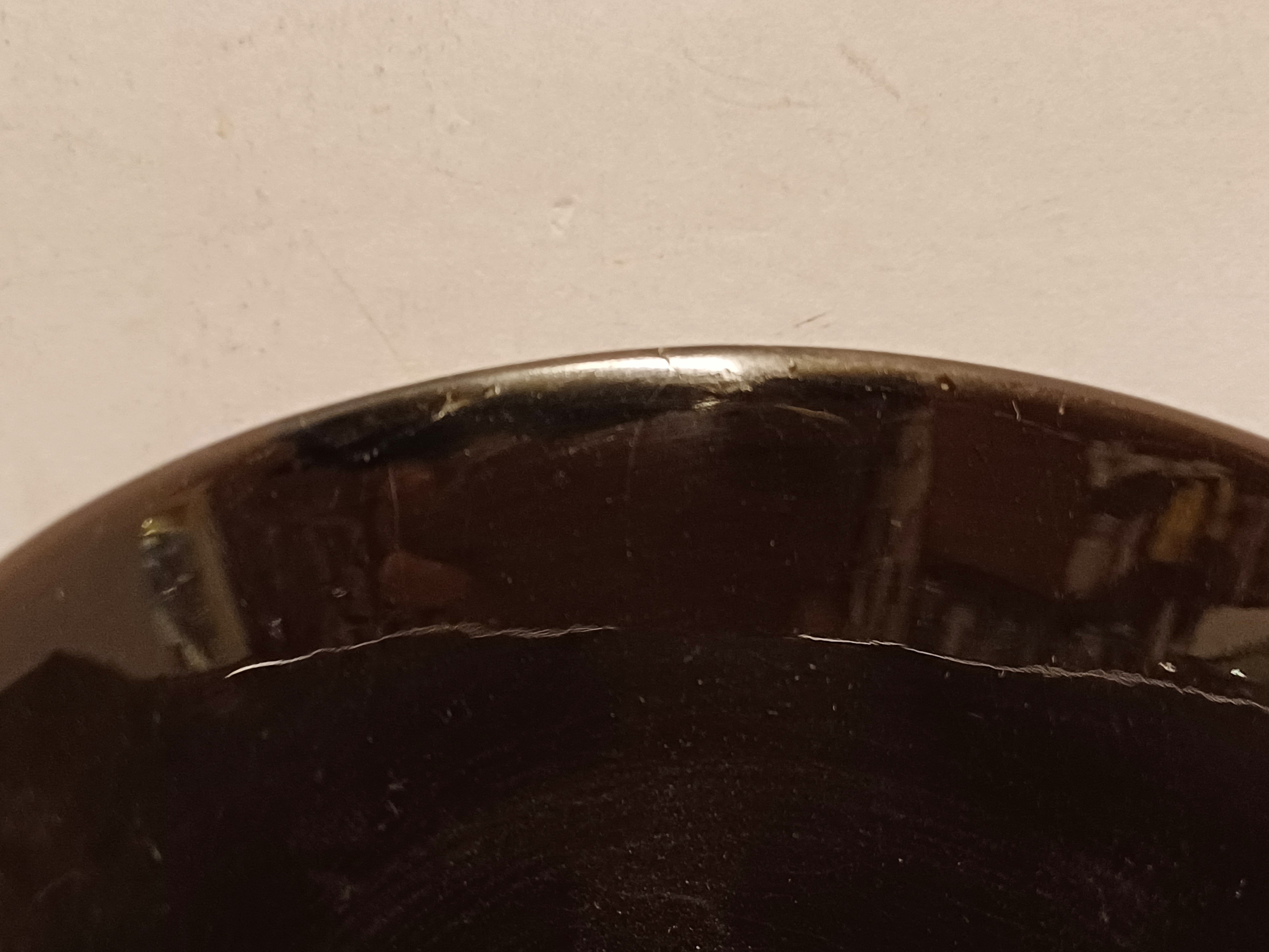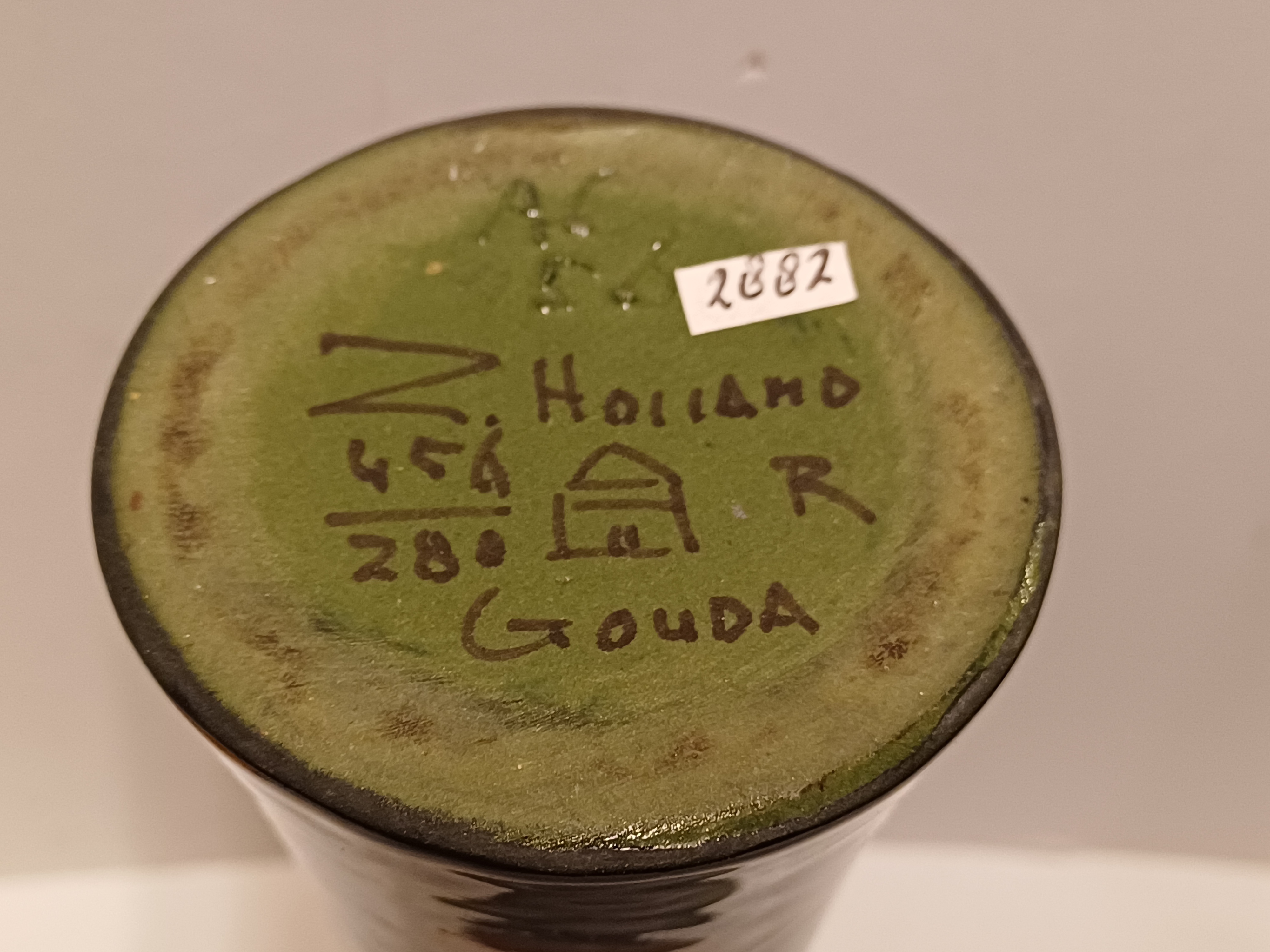 Aardewerken bekervaas met glansplatelen decor. Onderzijde met fabrieksmerk