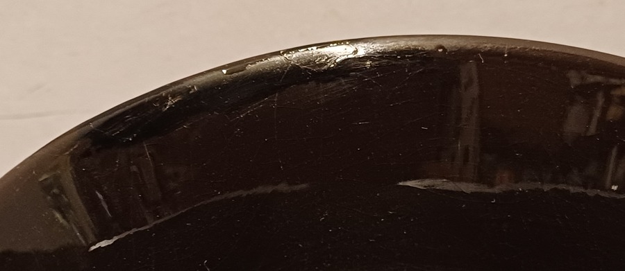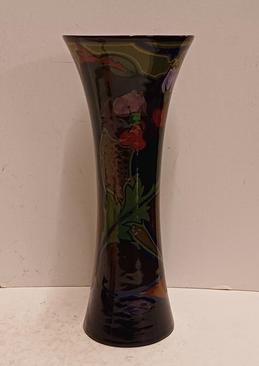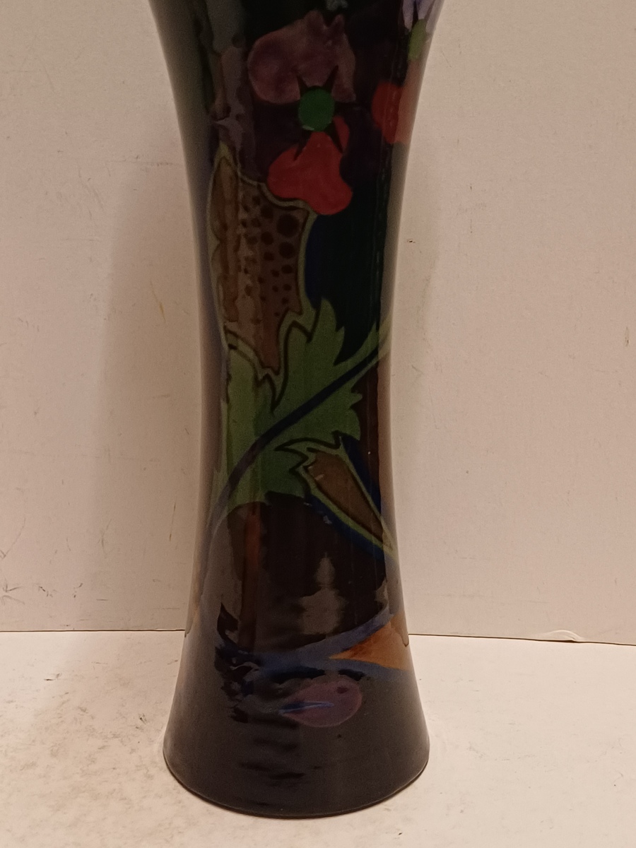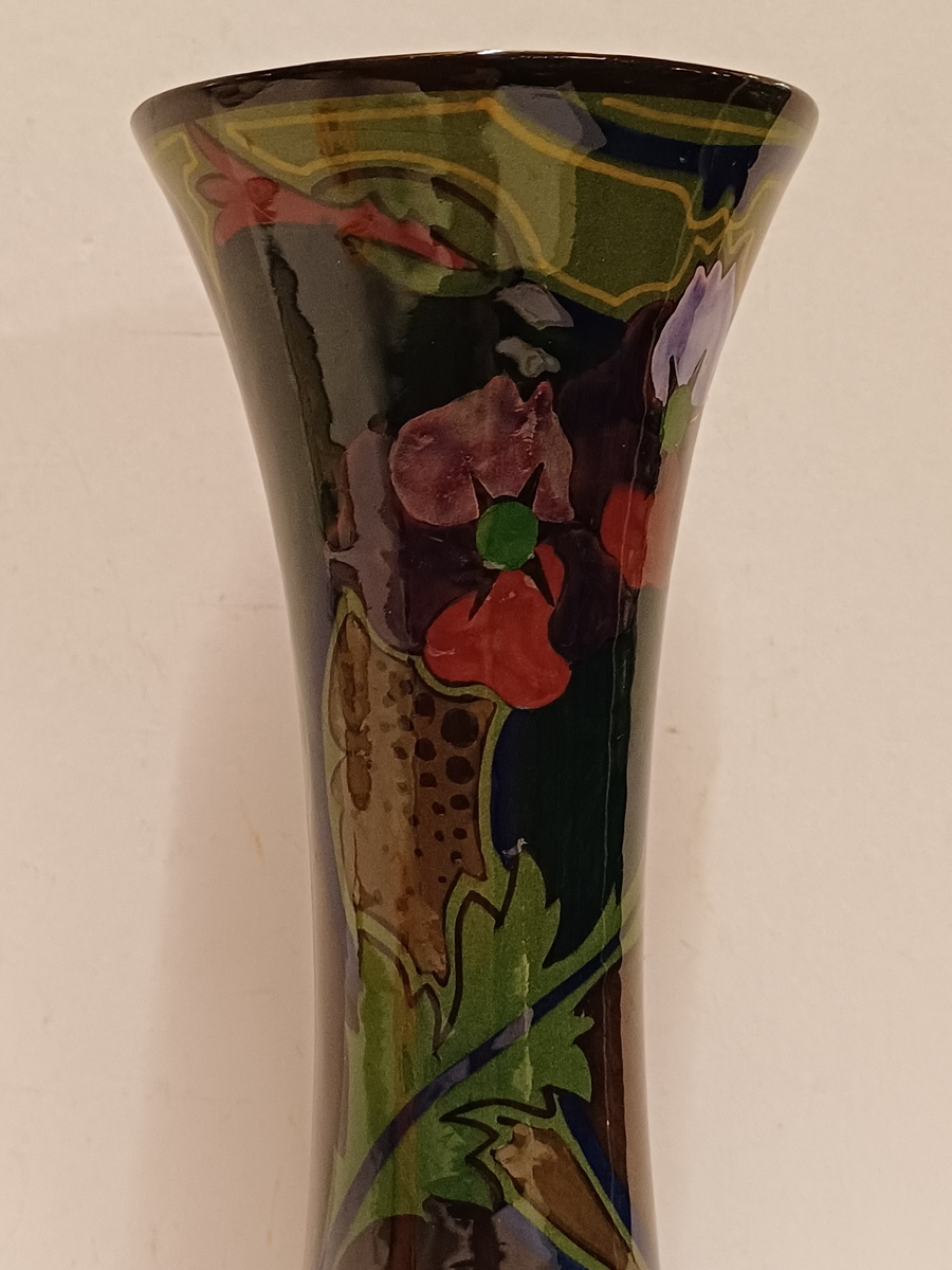 Aardewerken bekervaas met glansplatelen decor. Onderzijde met fabrieksmerk