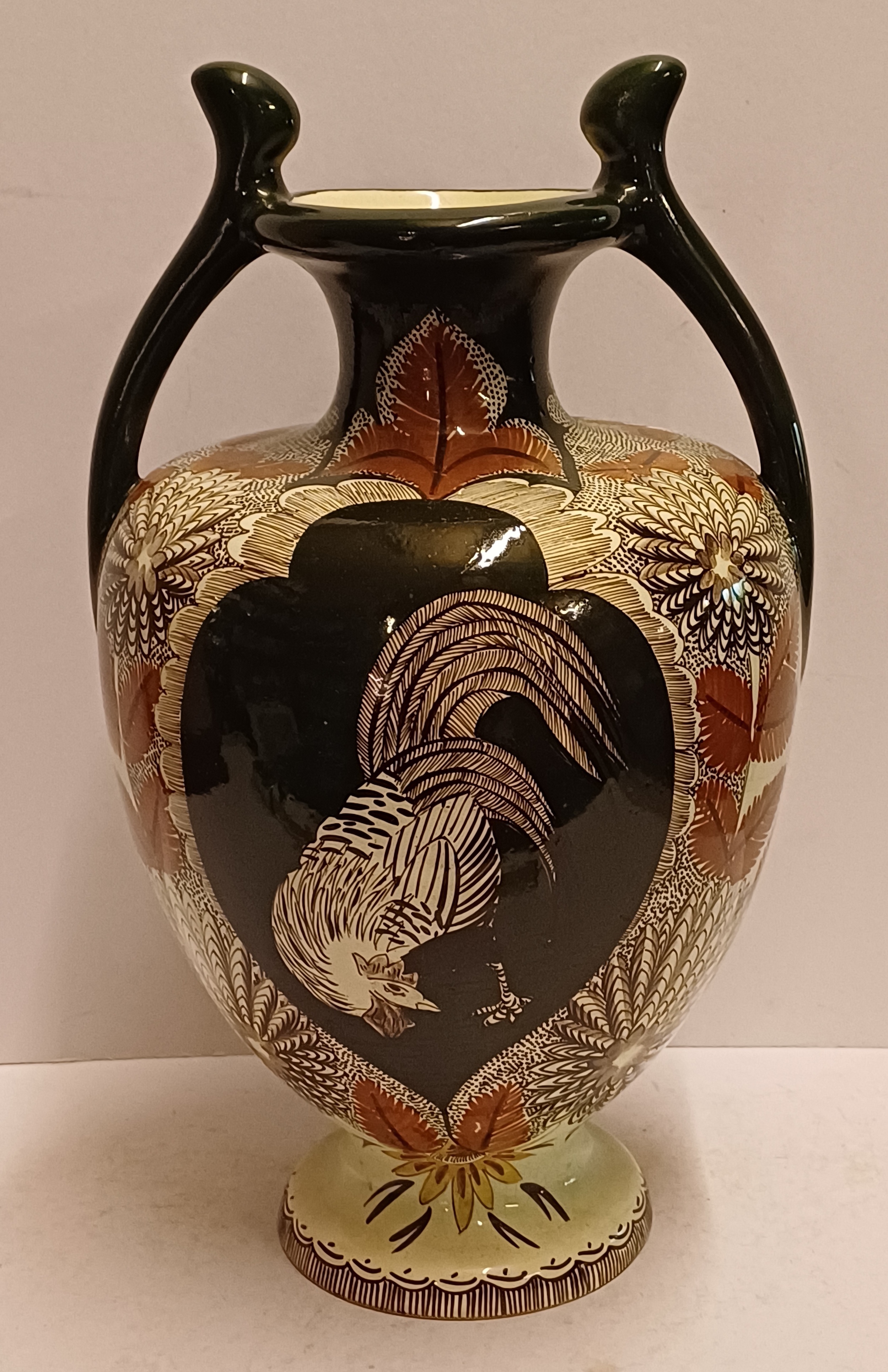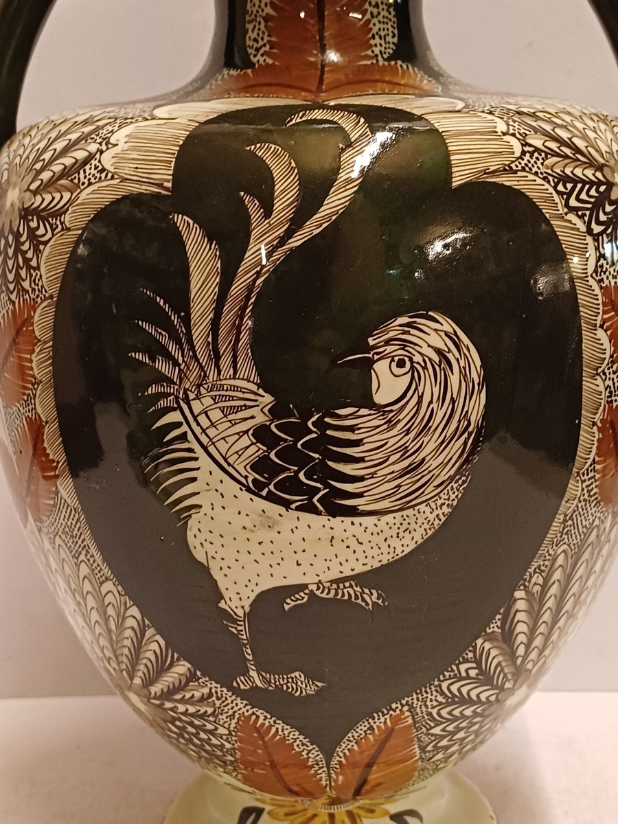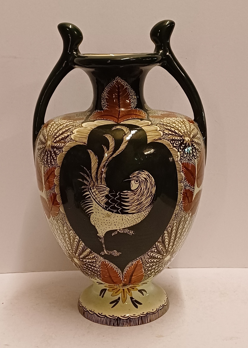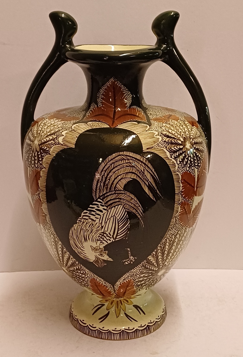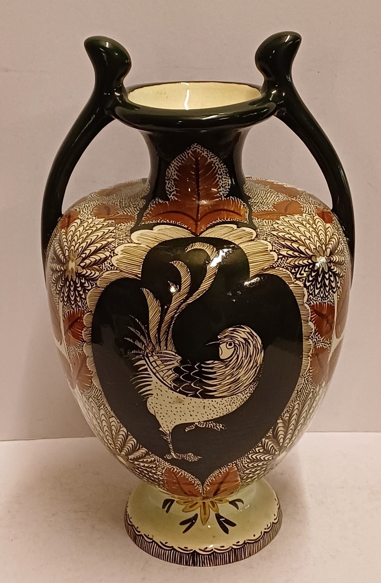 Early lustreware vase with hand-painted decor of a rooster on the front and a pheasant on the back. Bottom with painted brand mark.
