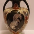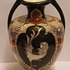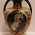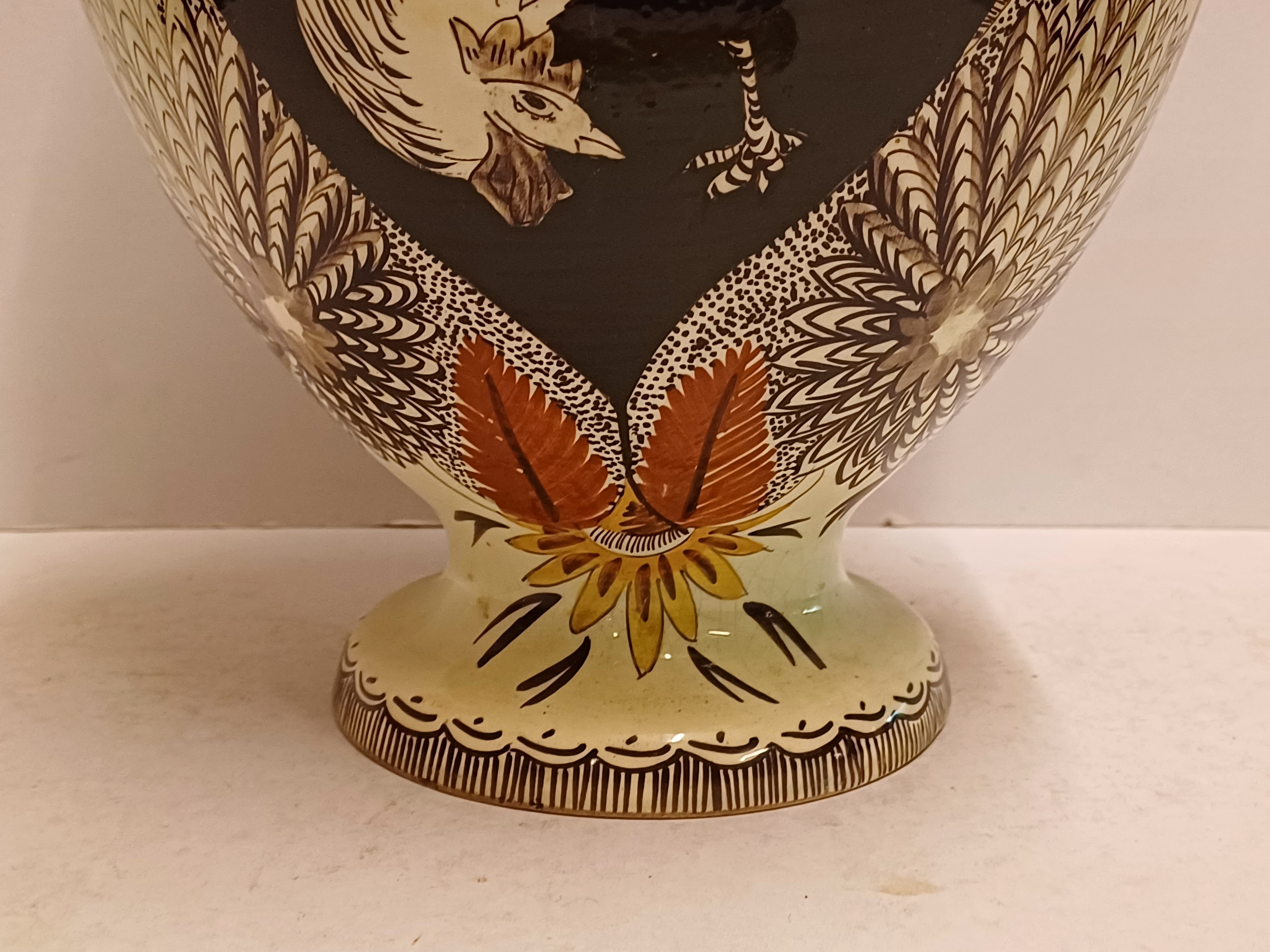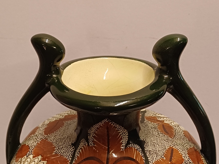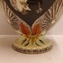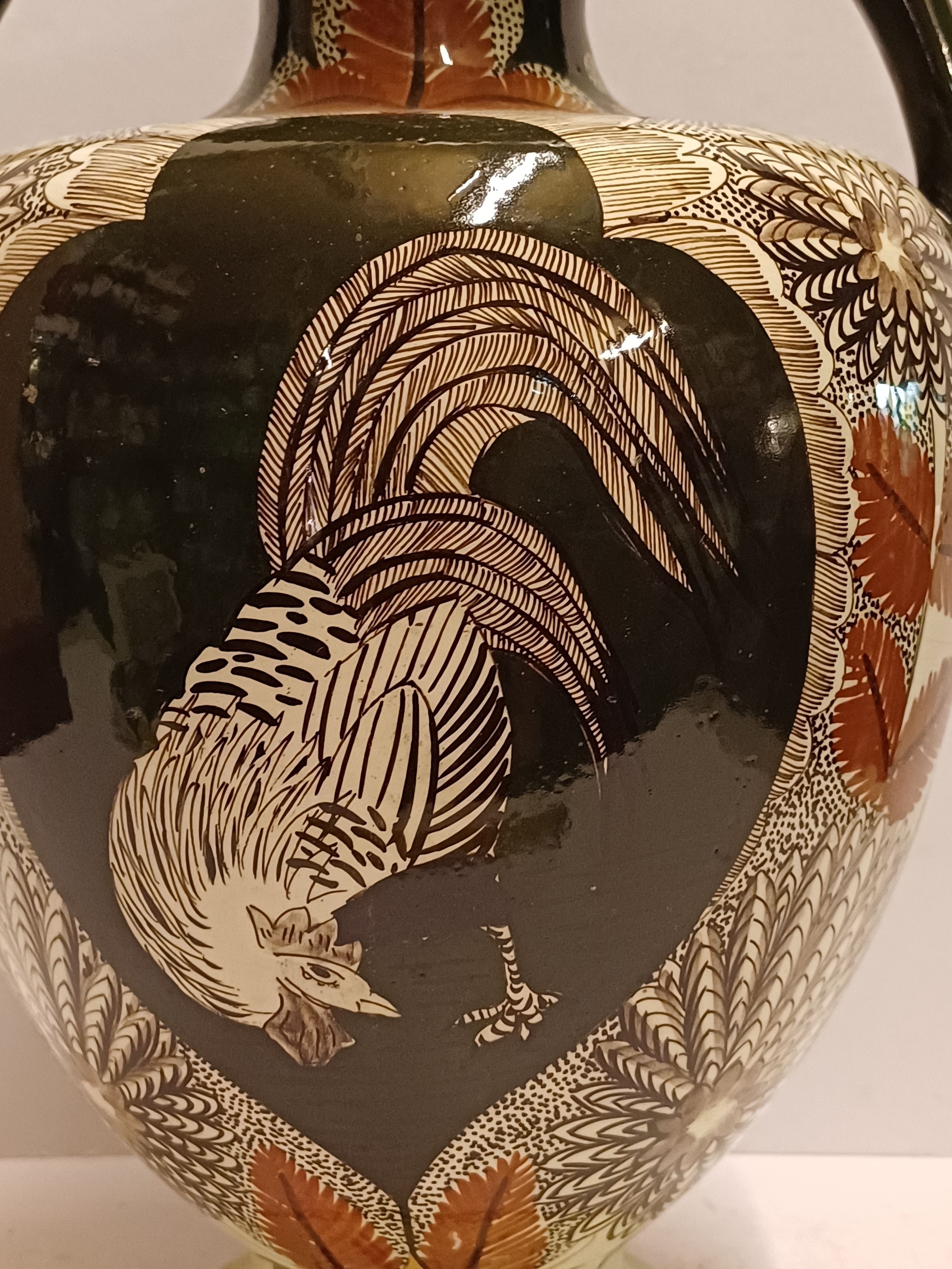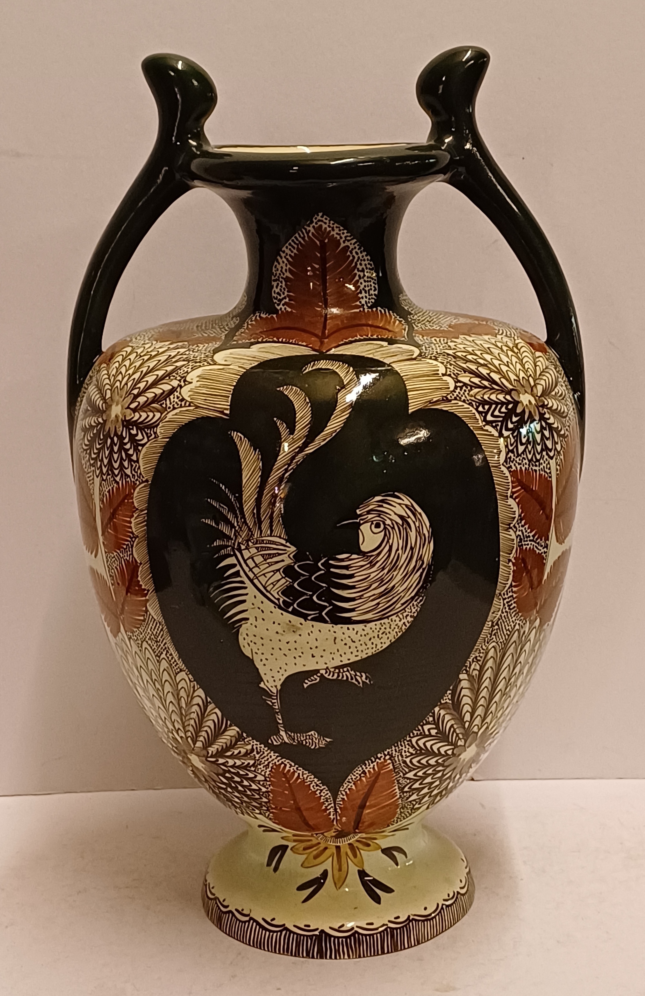 Early lustreware vase with hand-painted decor of a rooster on the front and a pheasant on the back. Bottom with painted brand mark.