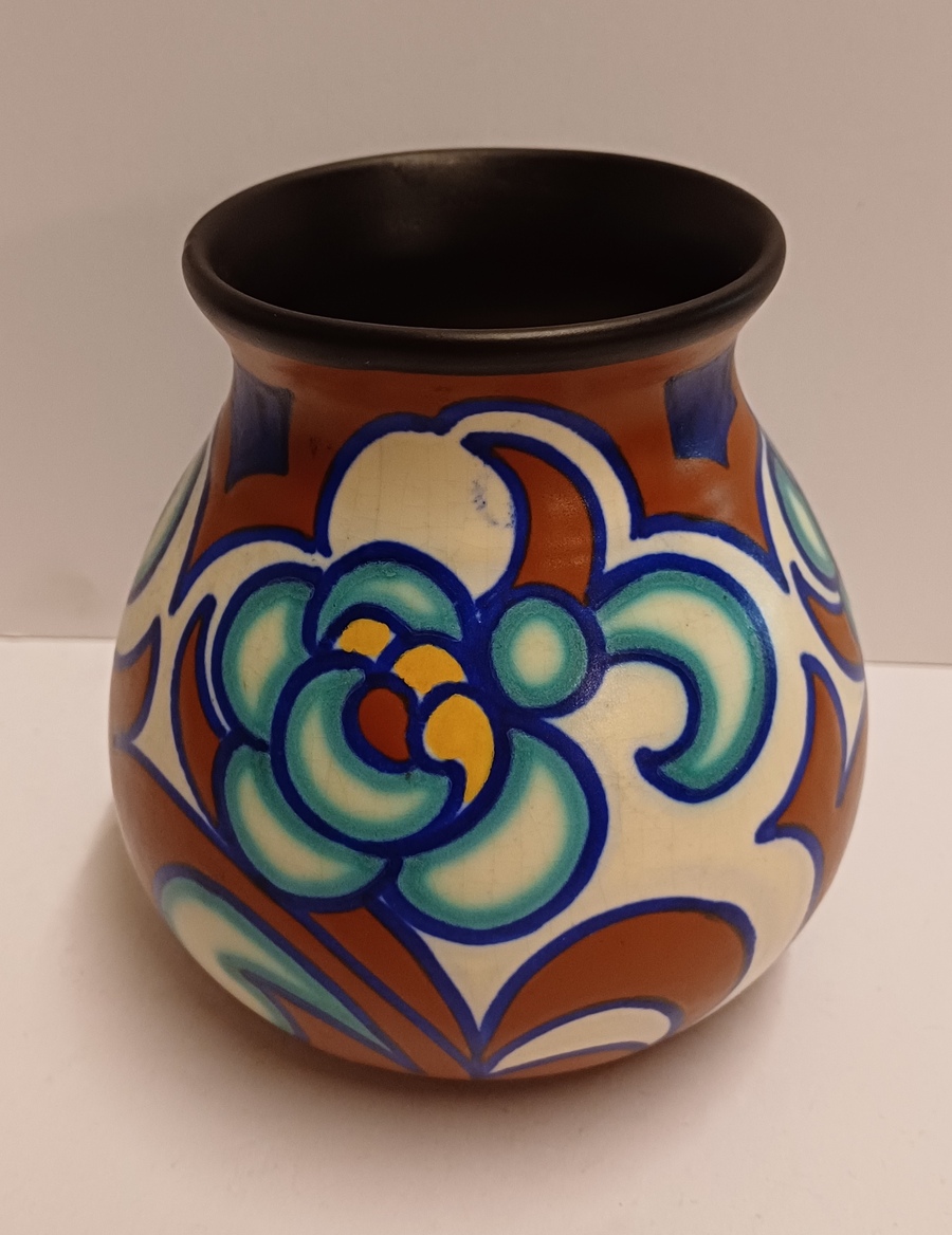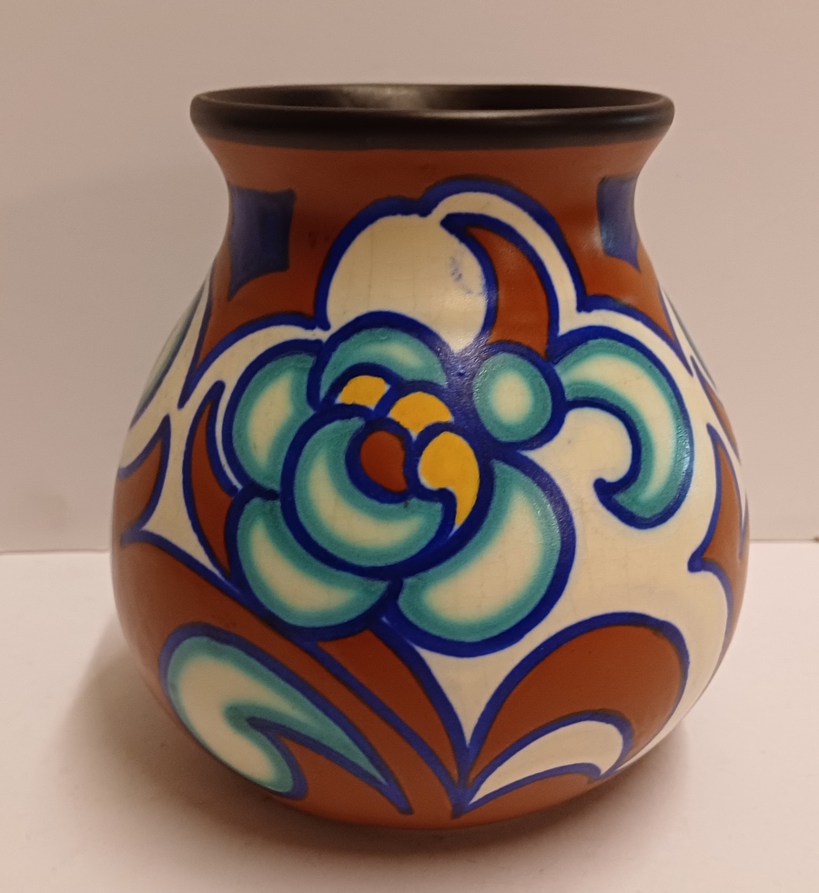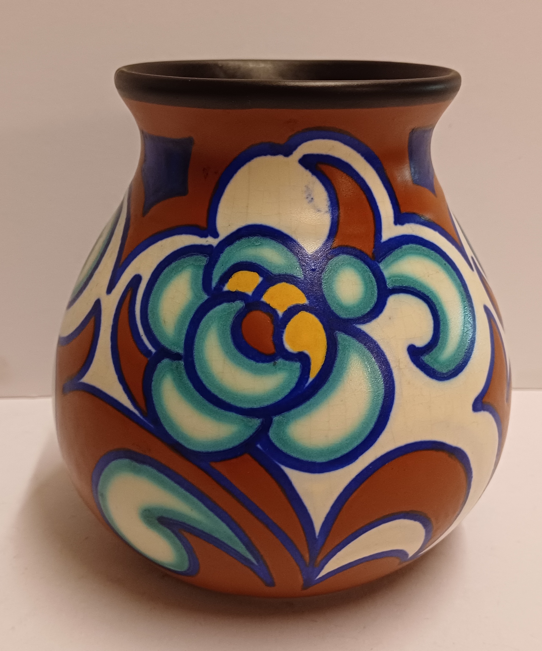 Faience vase with stylized floral decor. Bottom with factory mark.