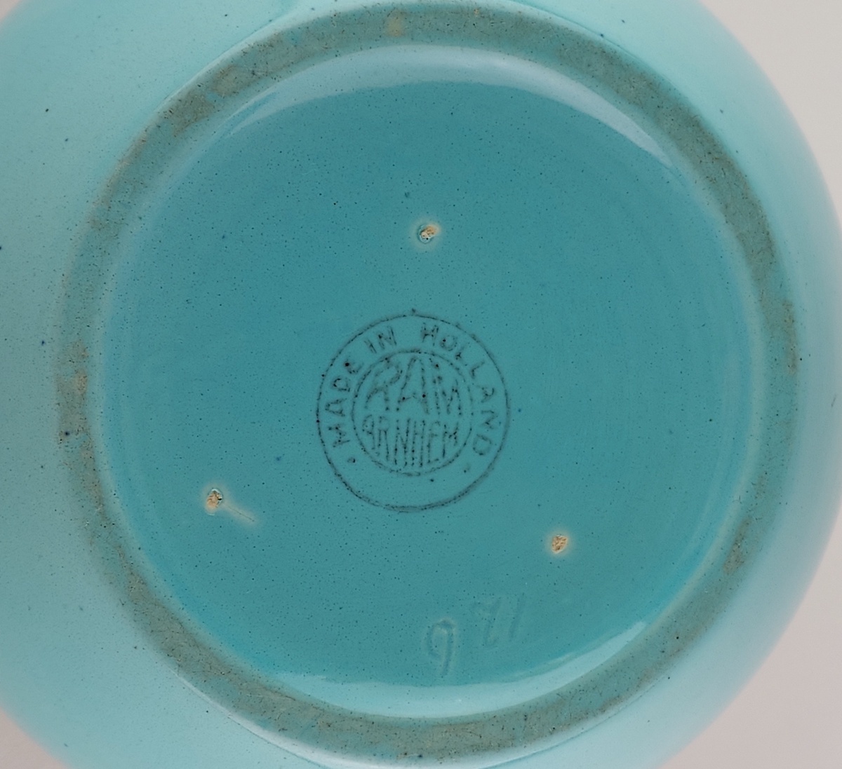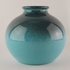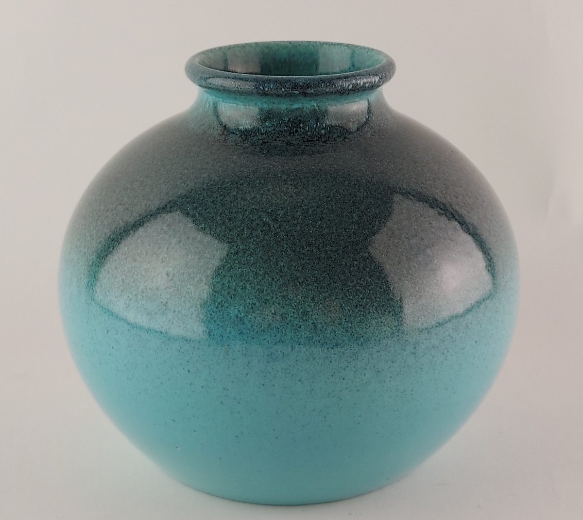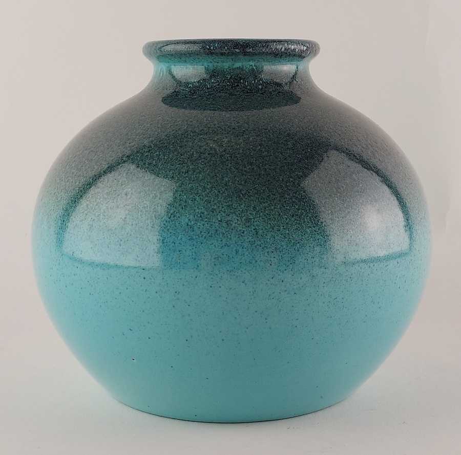 Globular vase with sprayed gray speckles on a blue background. Bottom with factory stamp.