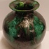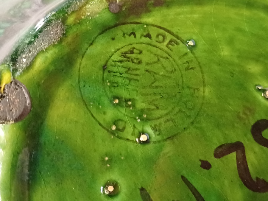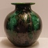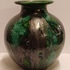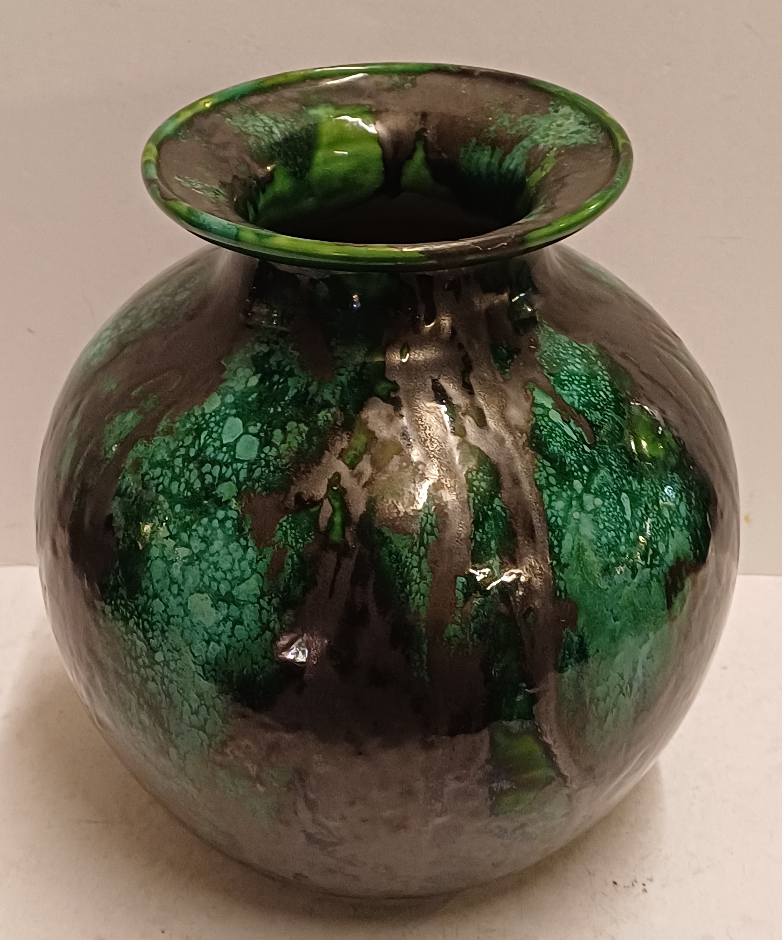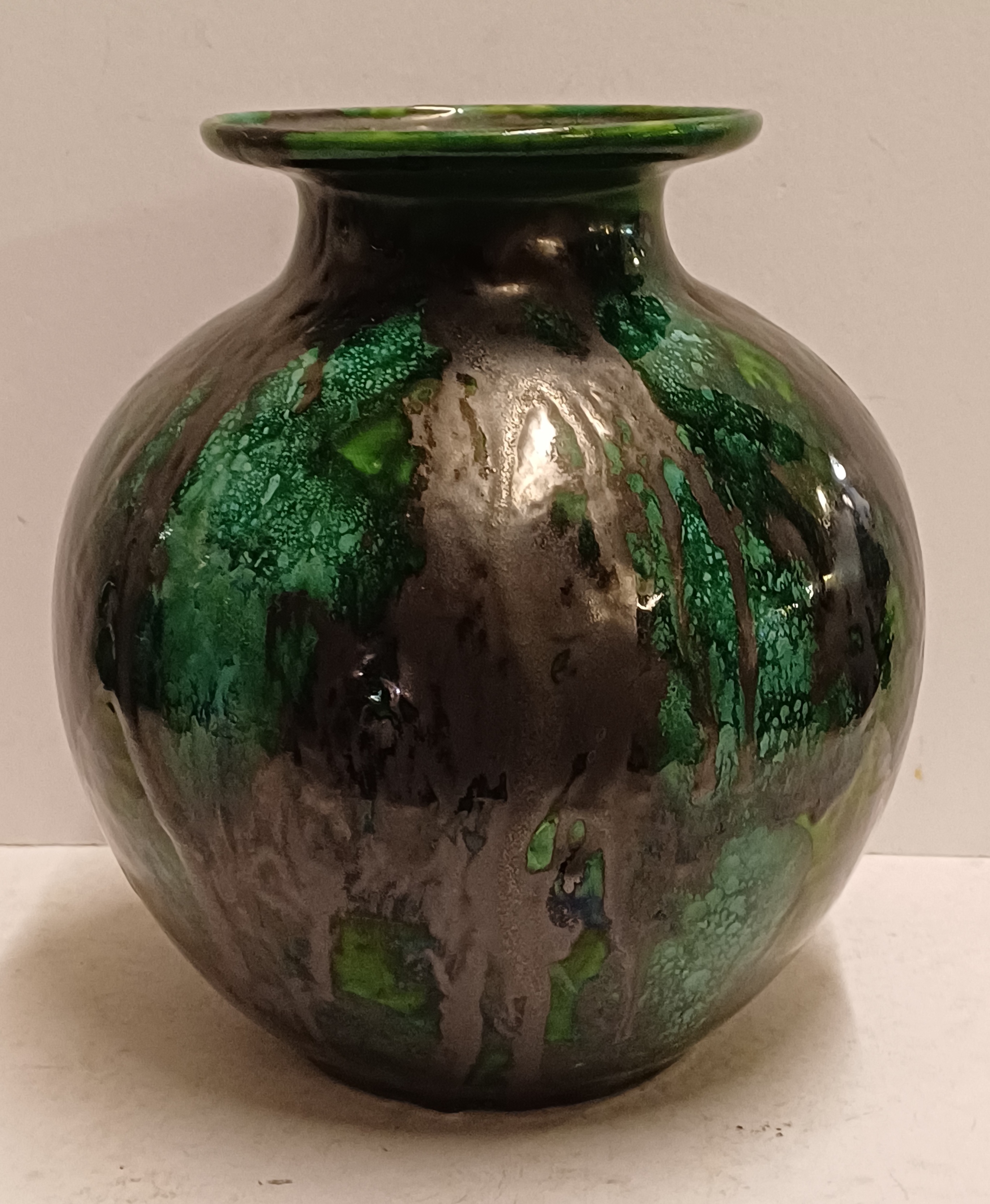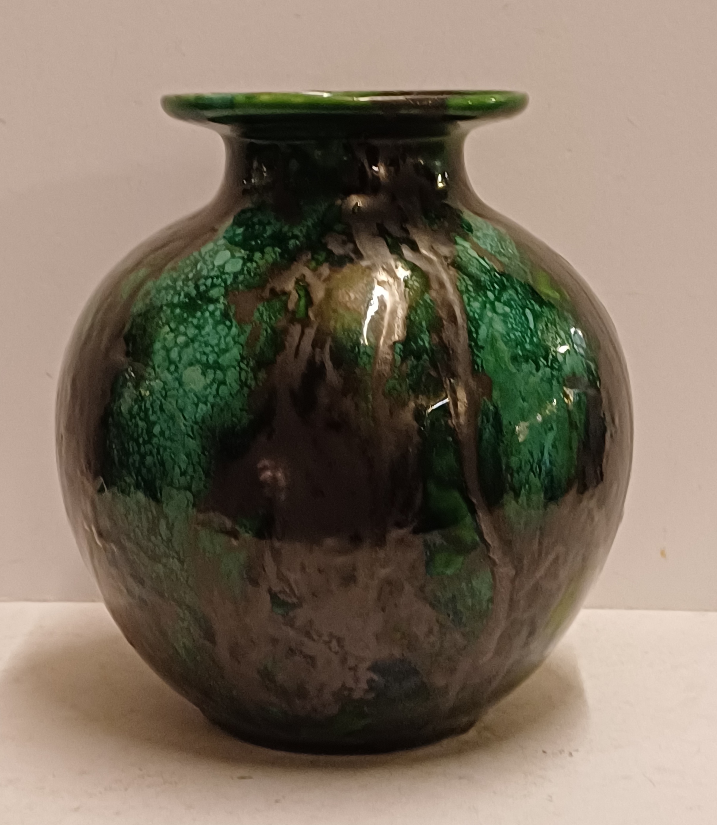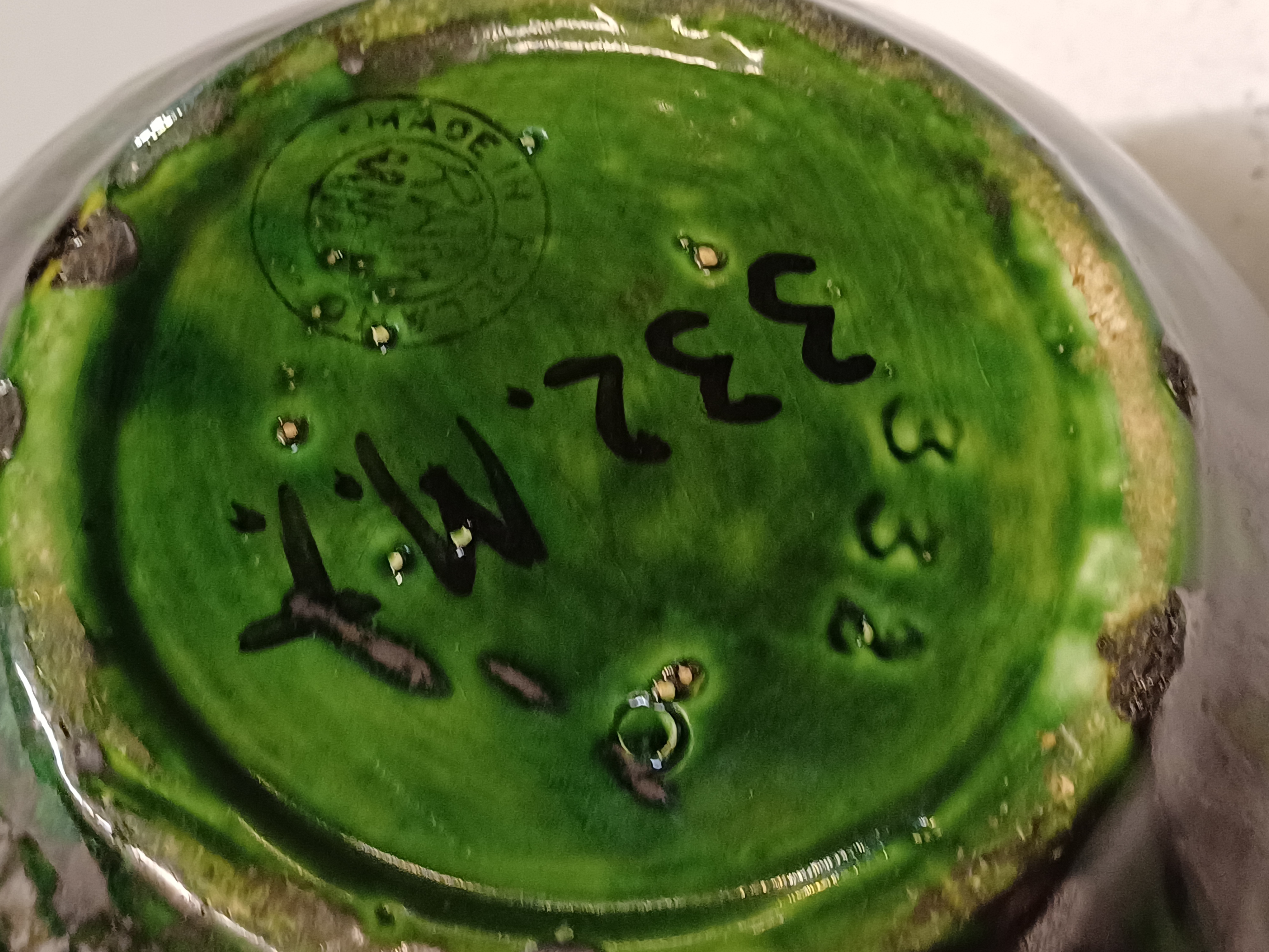 Large bulbous vase with green-black glaze. Underside with stamped brand mark.