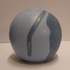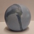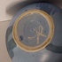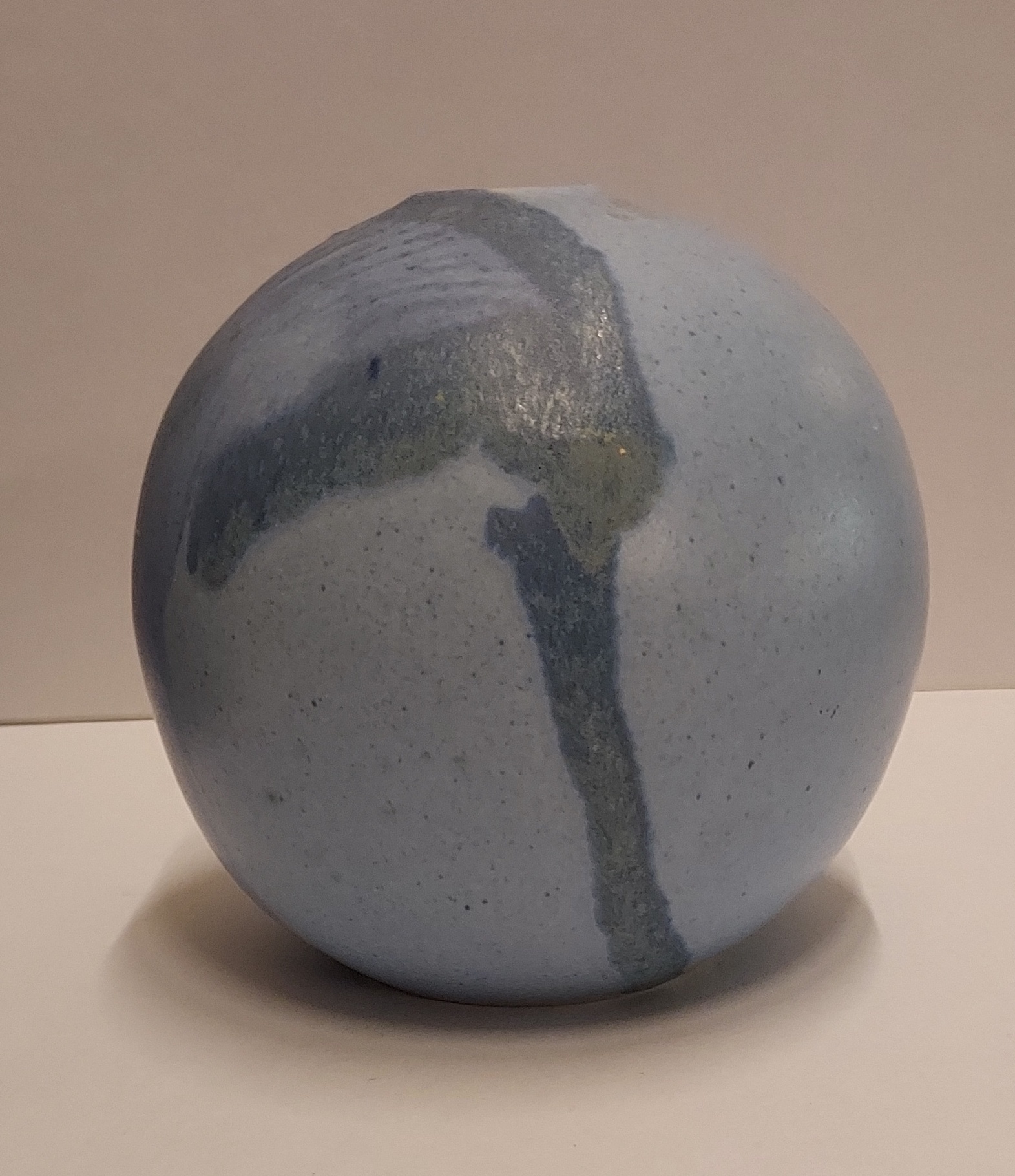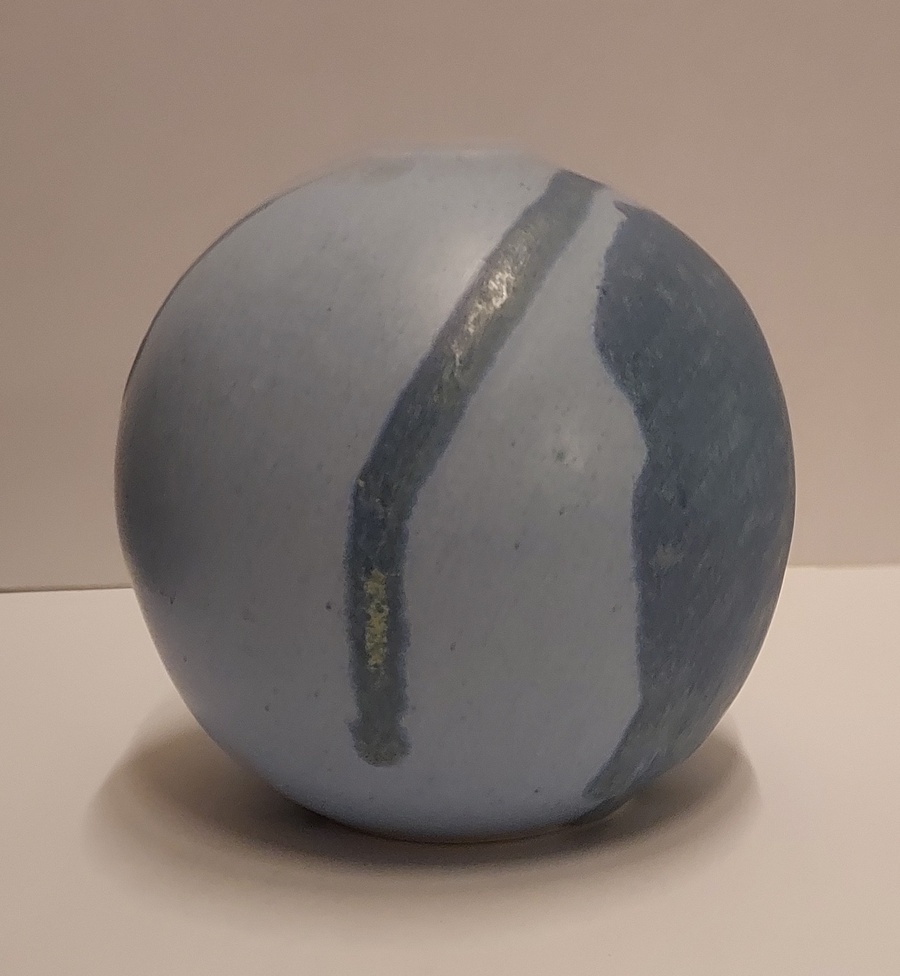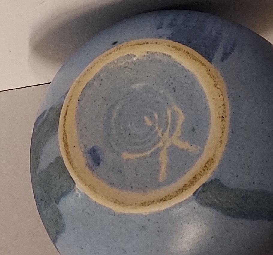 Round vase with blue glaze and green accents. Bottom with monogram.