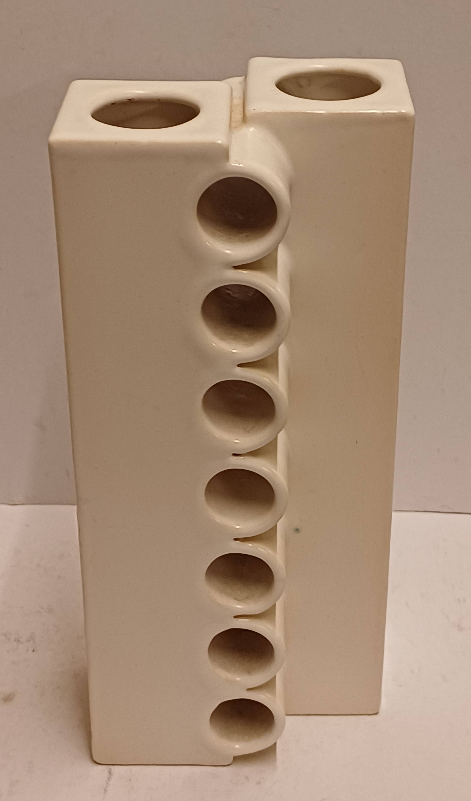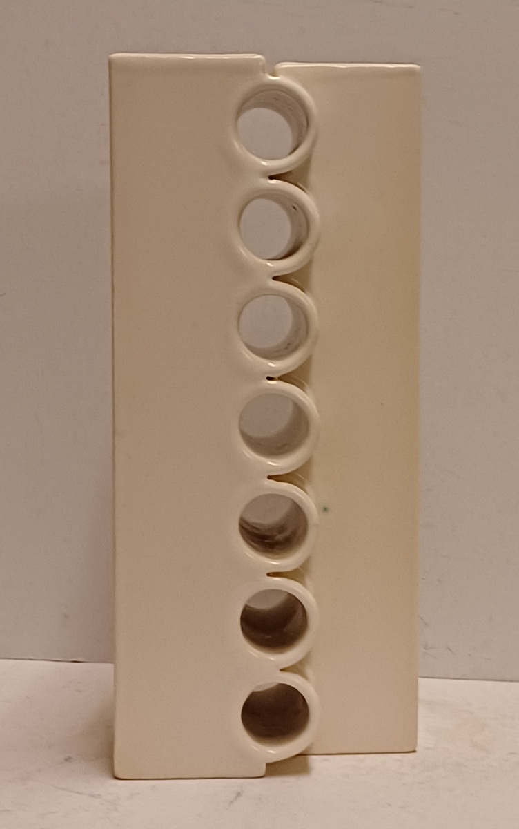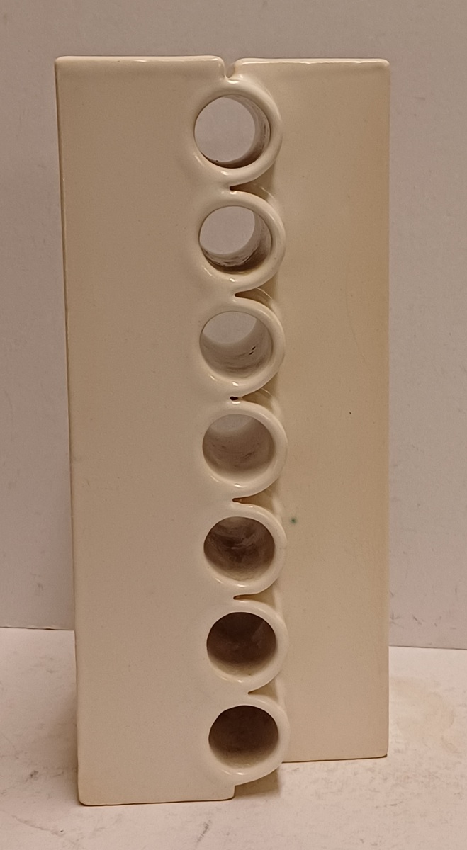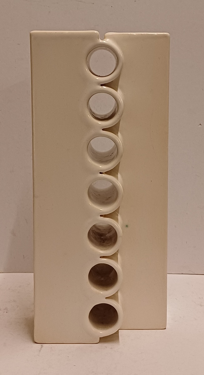 Modernistische dubbele vaas aaneengesloten met een open verticale rij ringen, met witte glazuur. Onderzijde met kunstenaars signatuur en datering '71.