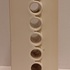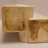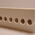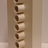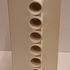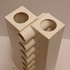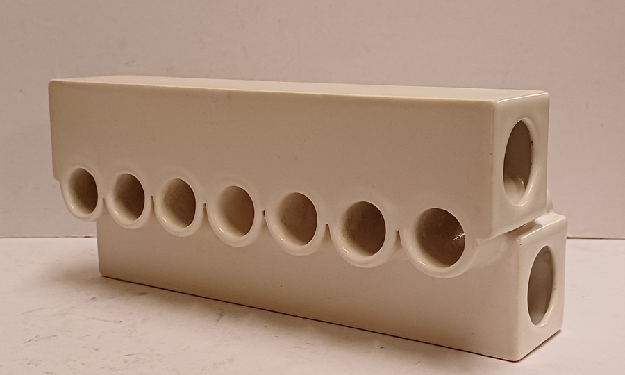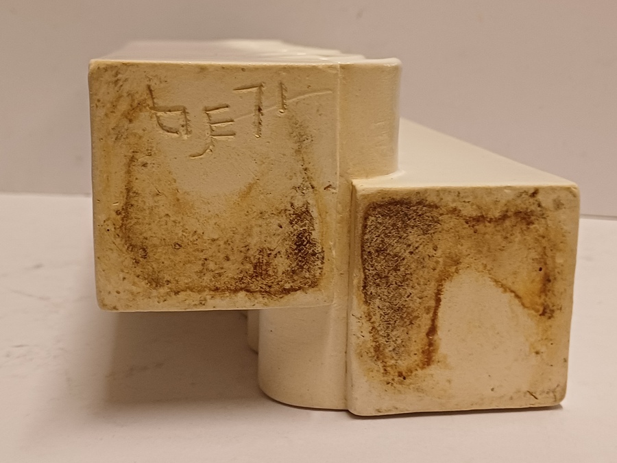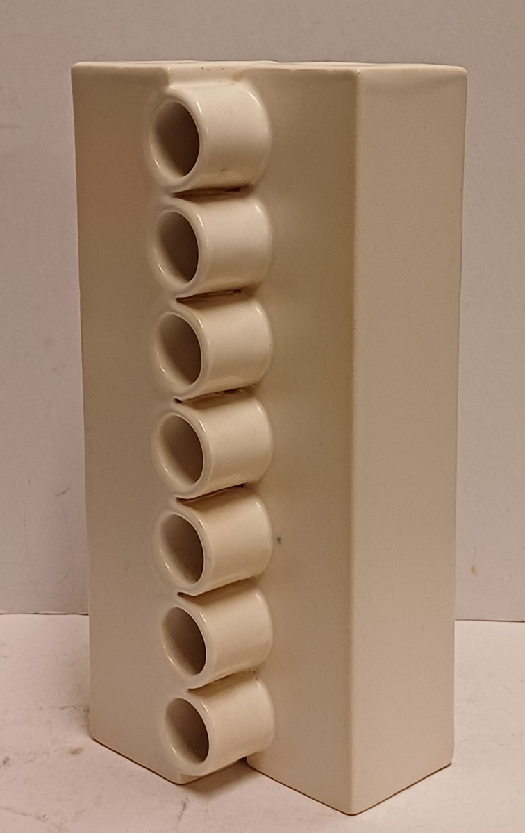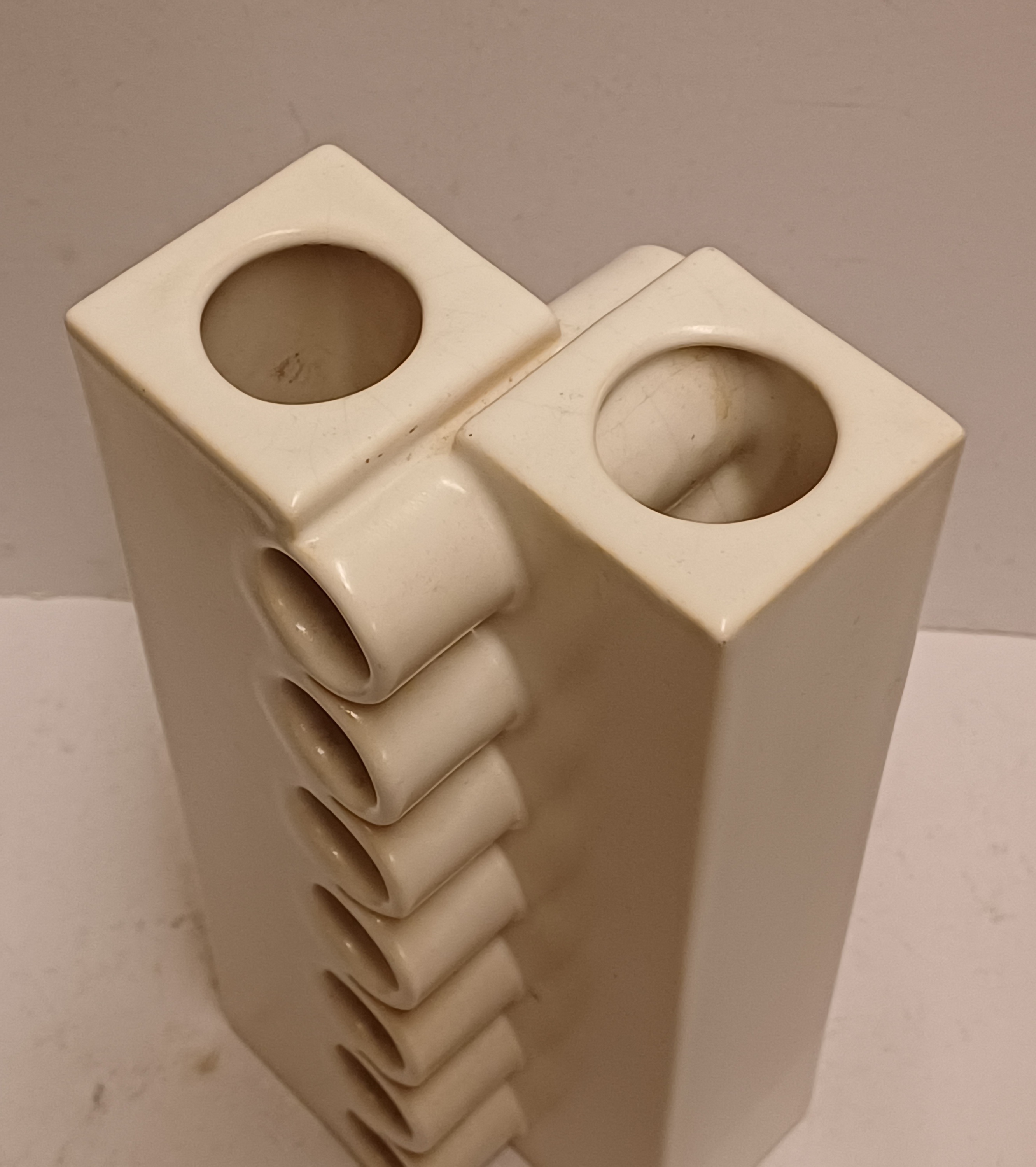 Modernistische dubbele vaas aaneengesloten met een open verticale rij ringen, met witte glazuur. Onderzijde met kunstenaars signatuur en datering '71.