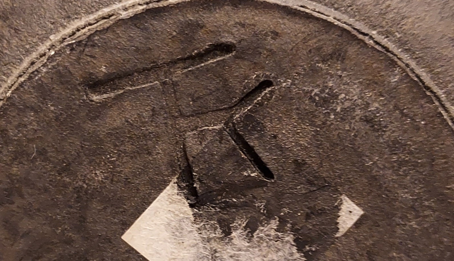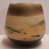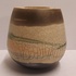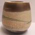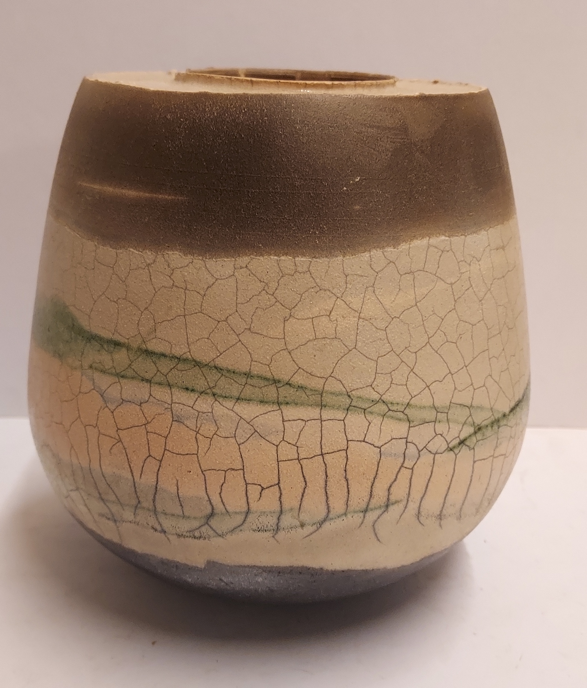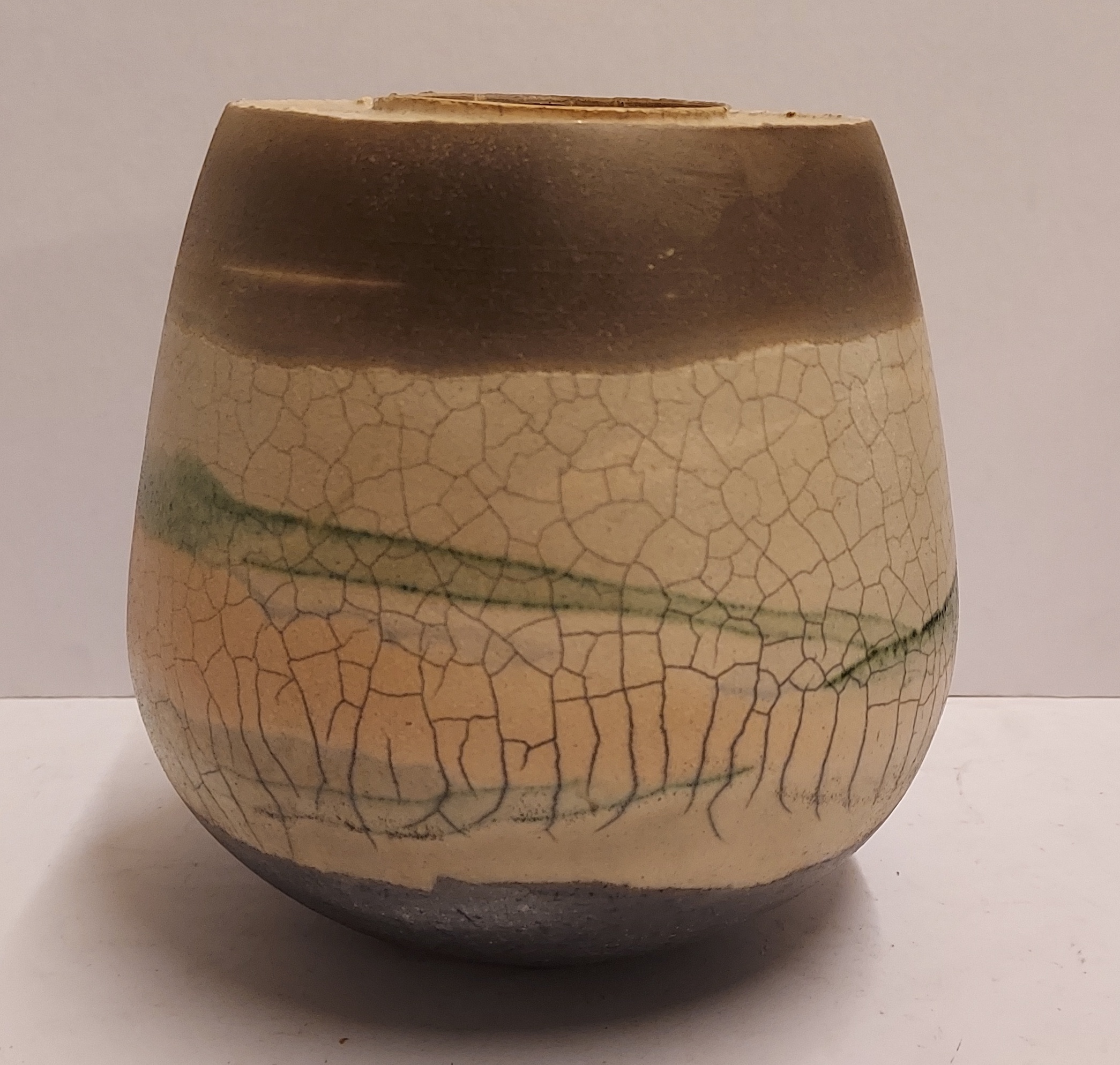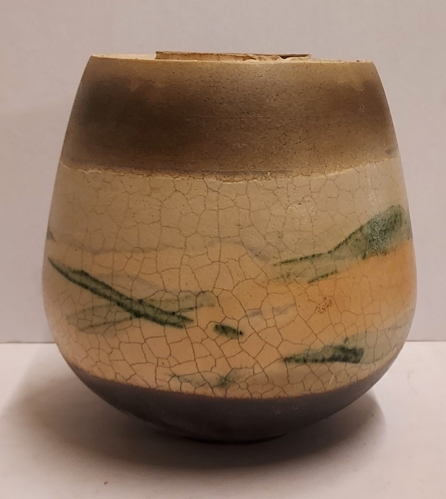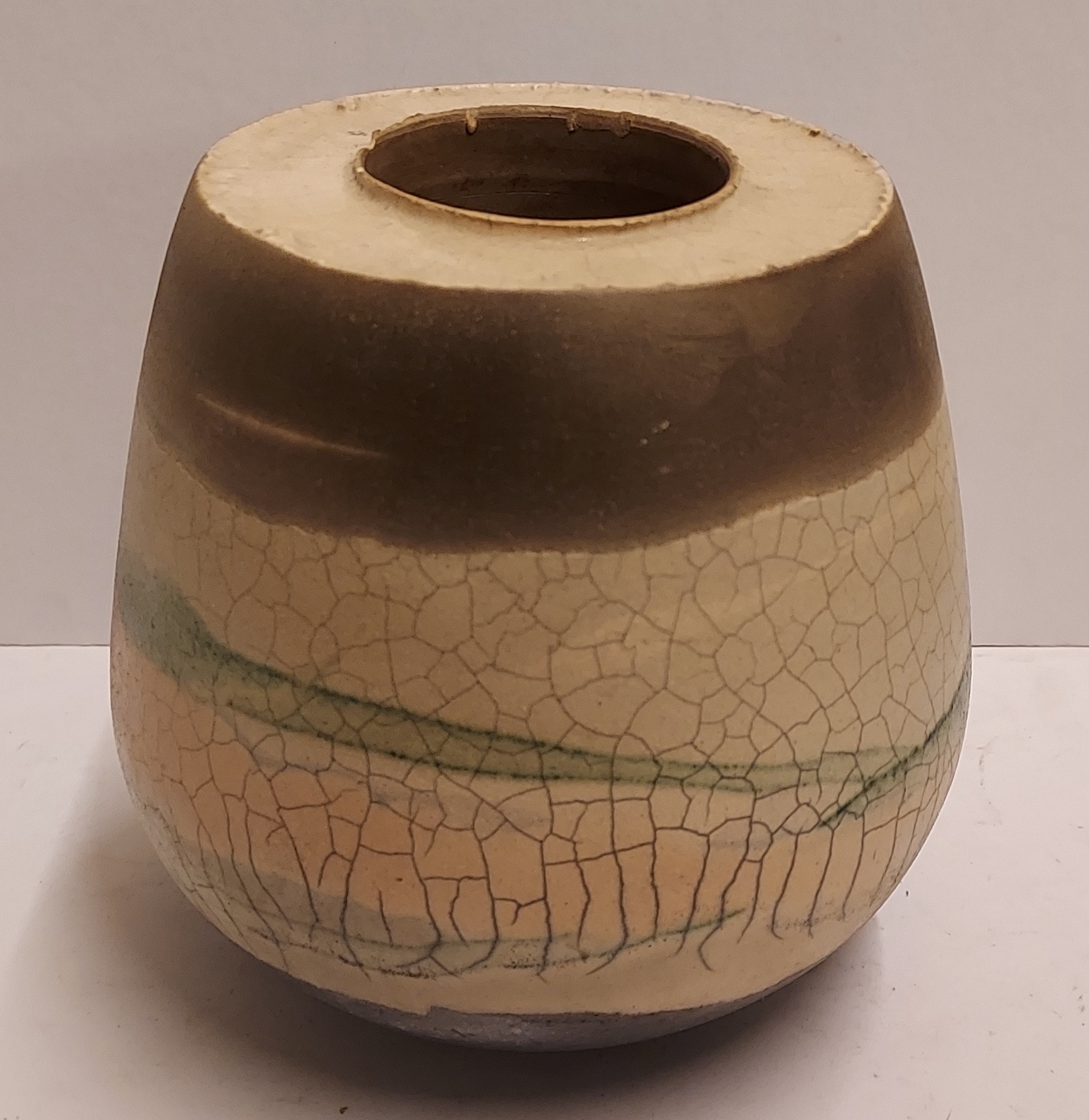 Raku-fired vase with multicolored glaze and wide top rim. Signed with monogram.