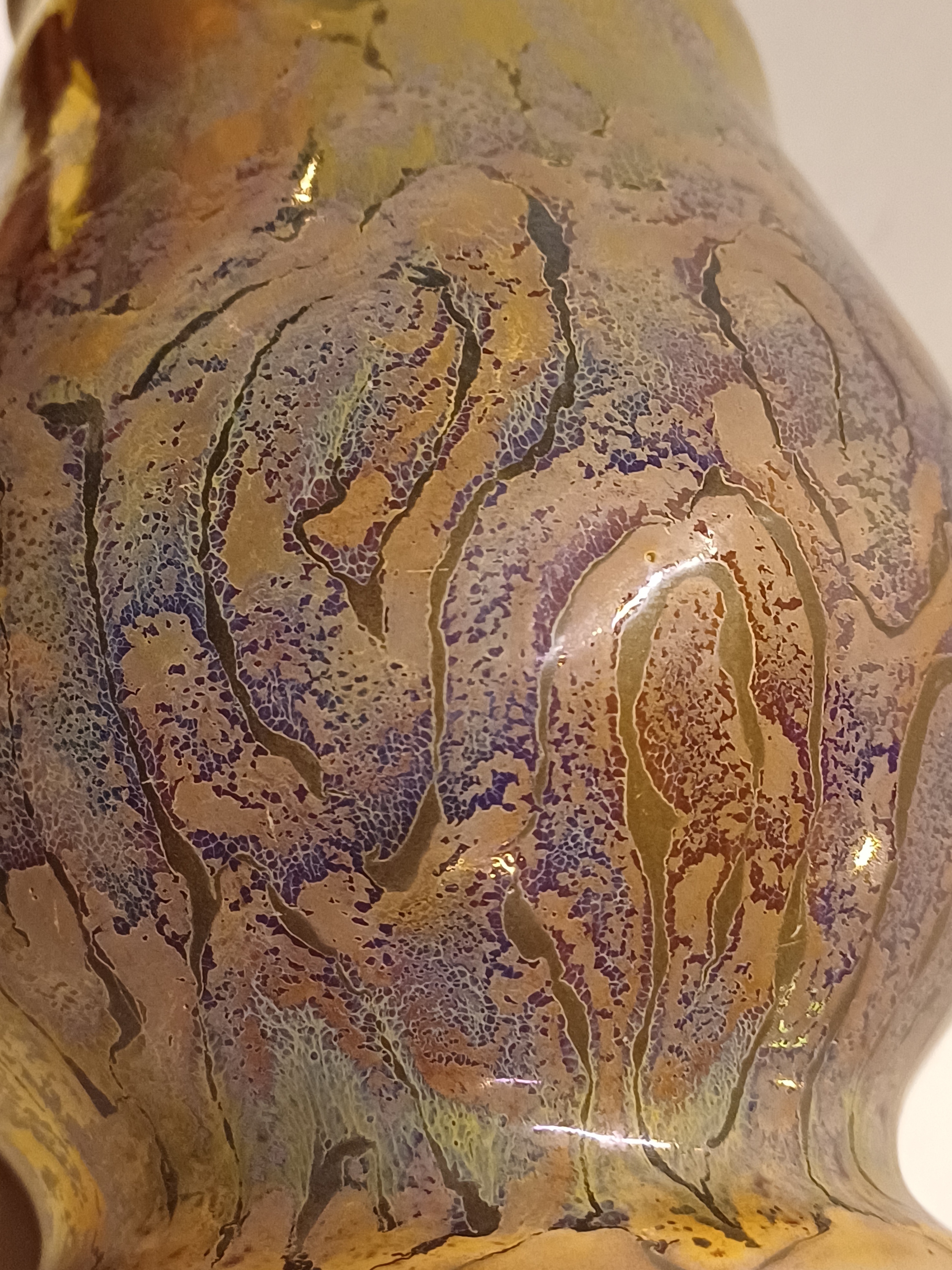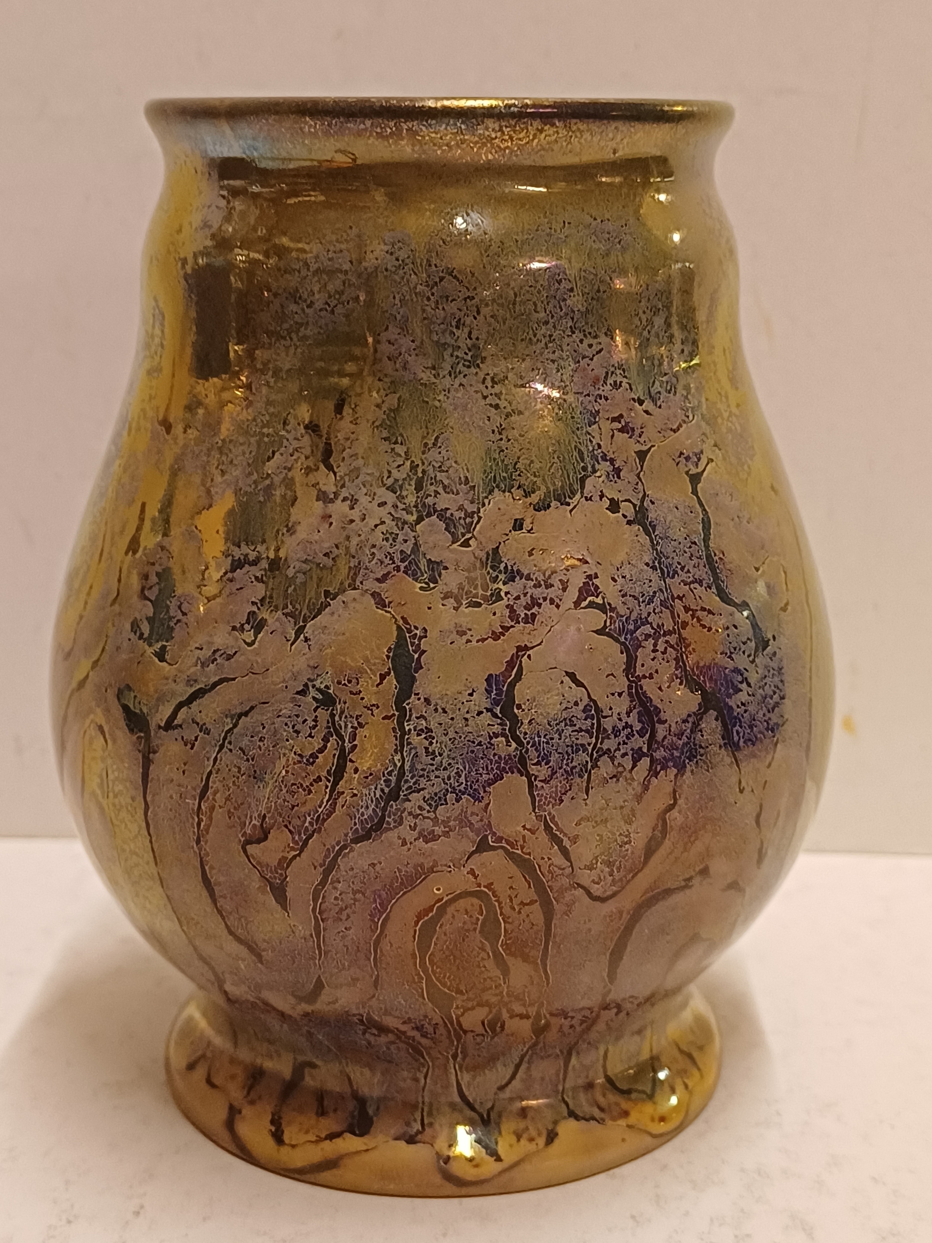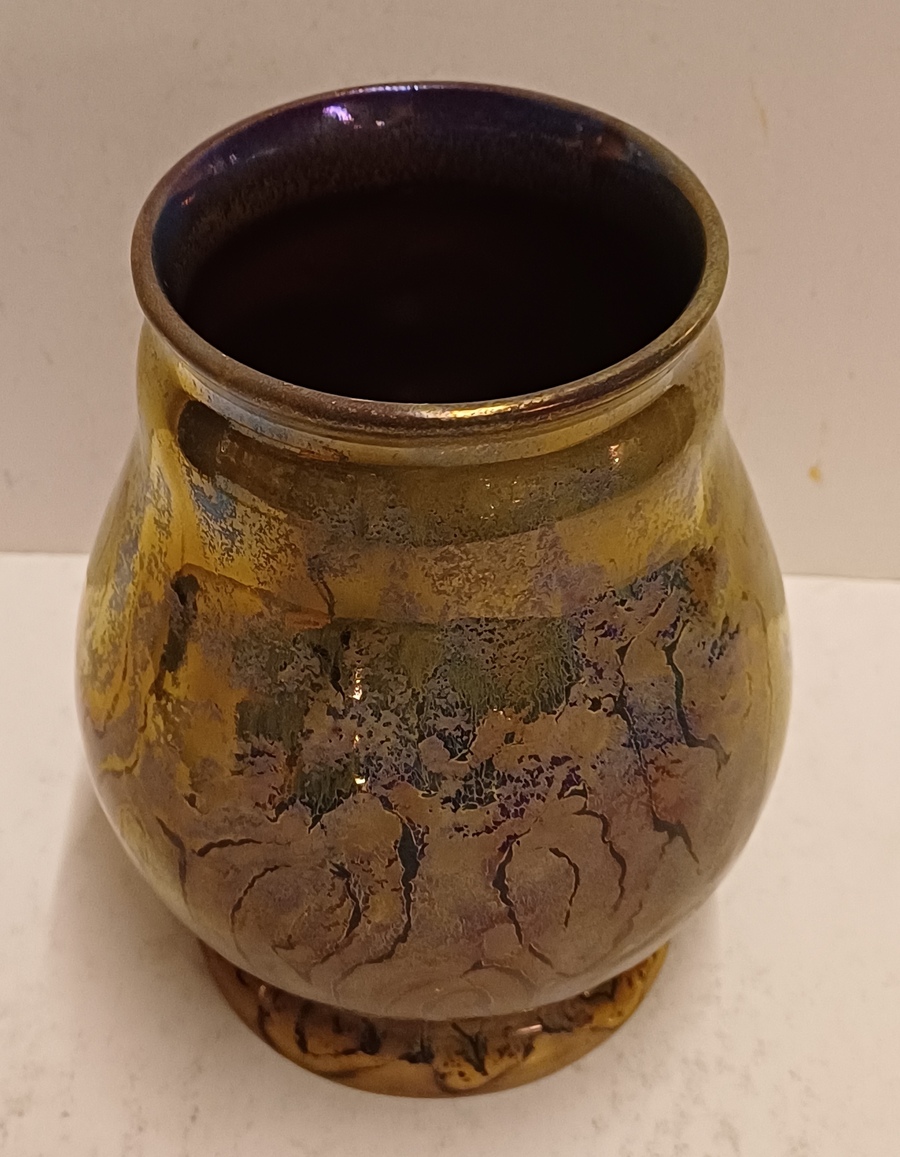 Platelen vaas met groen paarsige unique metallique glazuur. Onderzijde gesignmeerd
