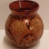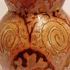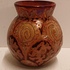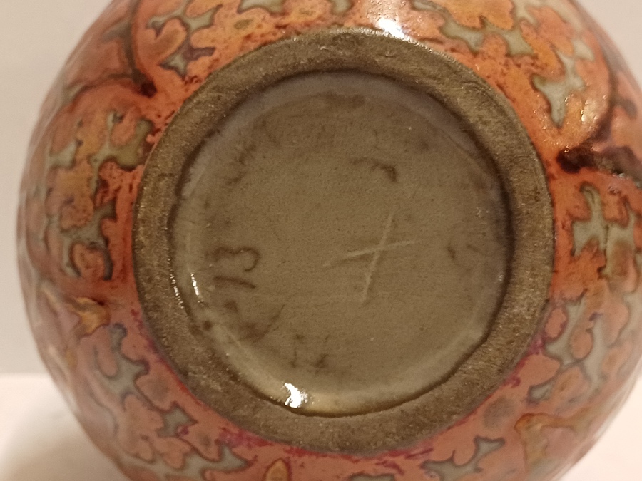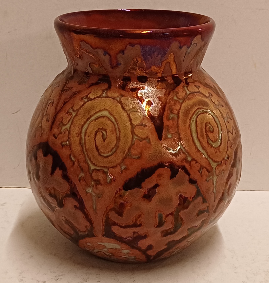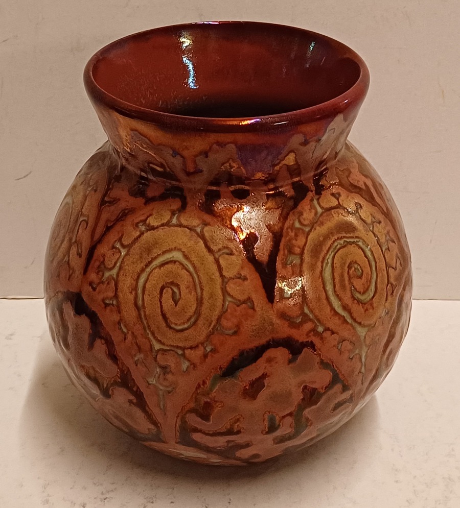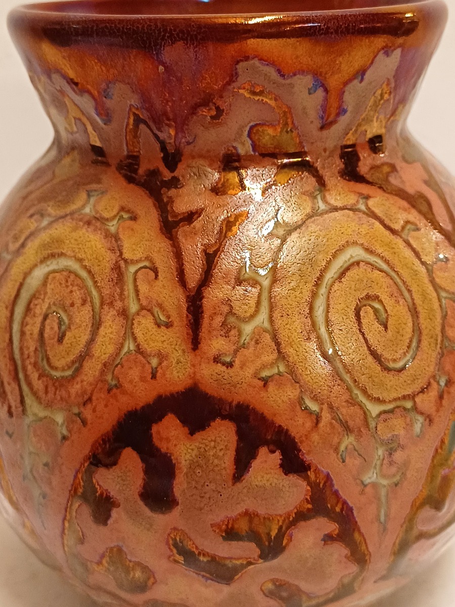 Platelen vaas met unique metalique glazuur met repeterend patroon. Niet gesigneerd