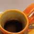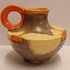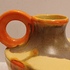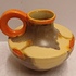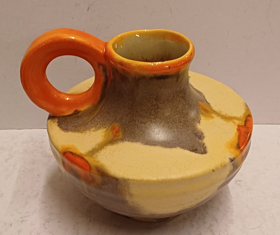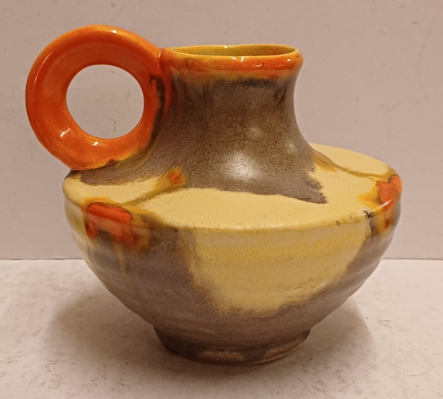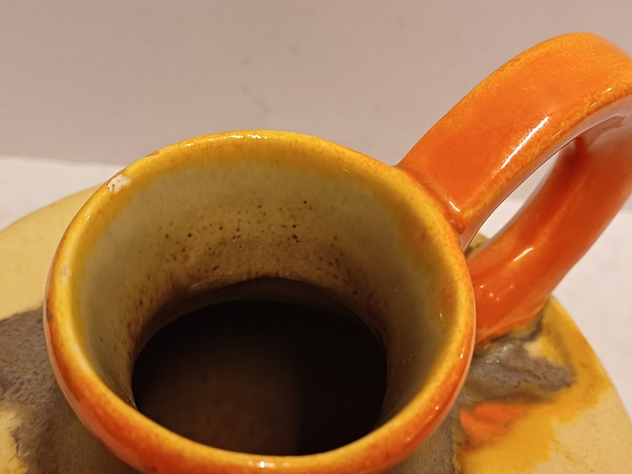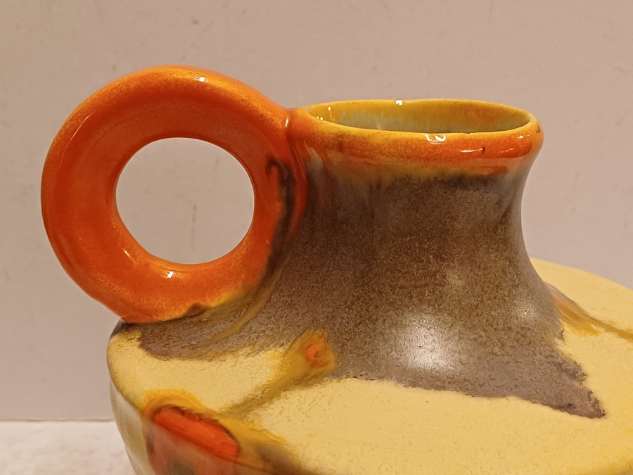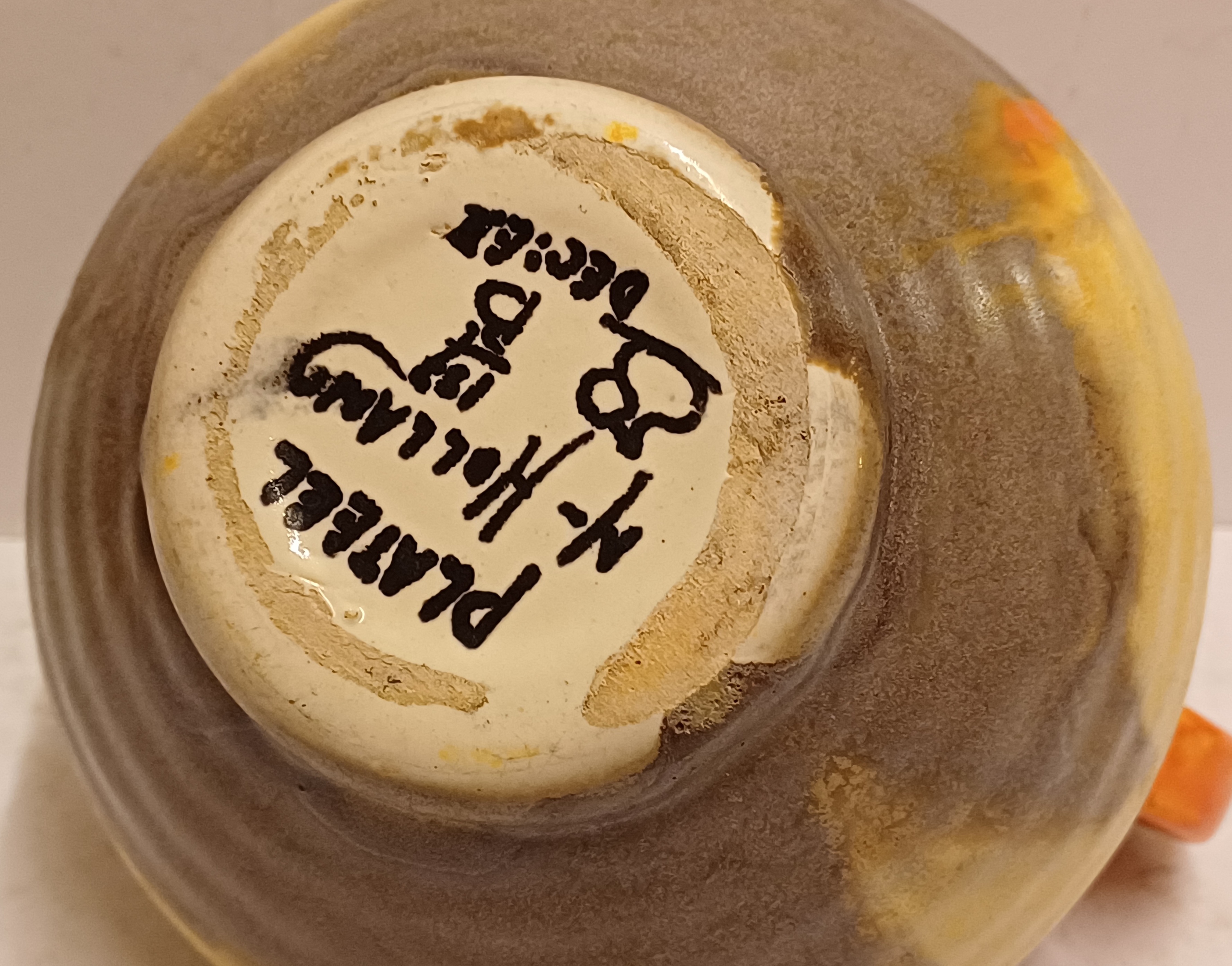 Met spuit glazuur in oranje en geel. Onderzijde gesigneerd.