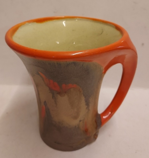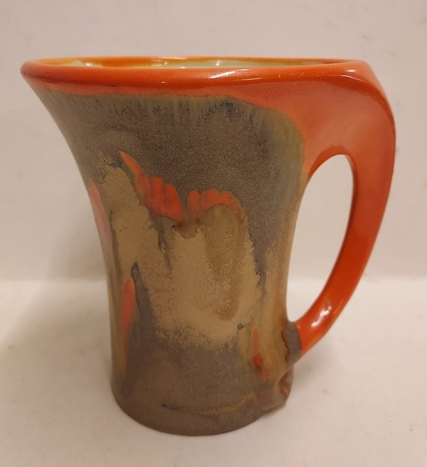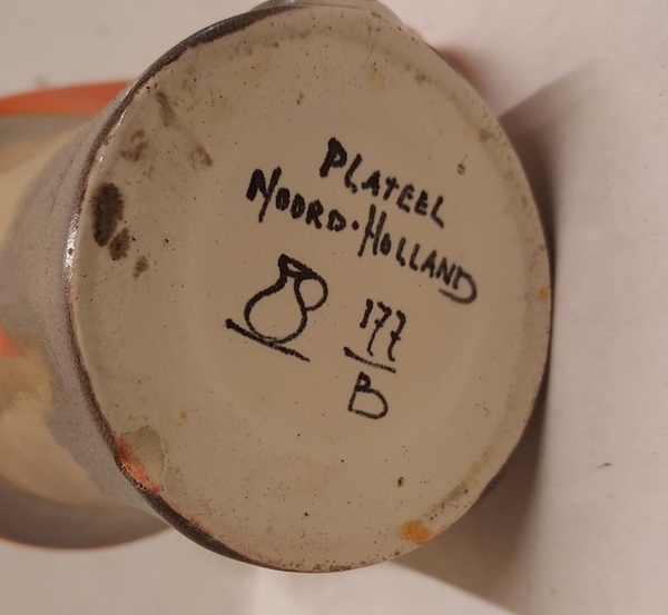 With spray glaze and orange handle. Signed with Plateel Noord Holland mark.