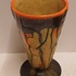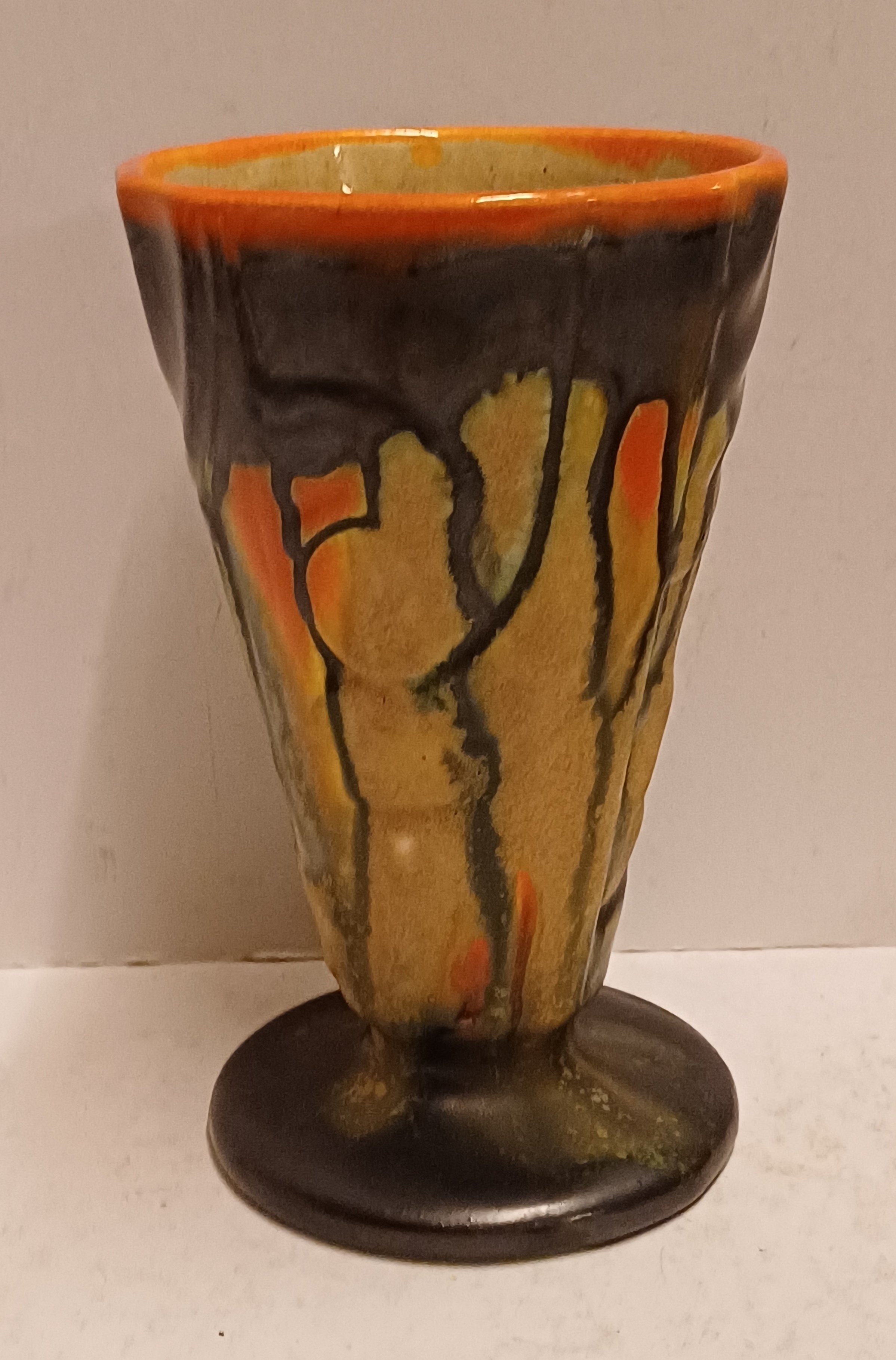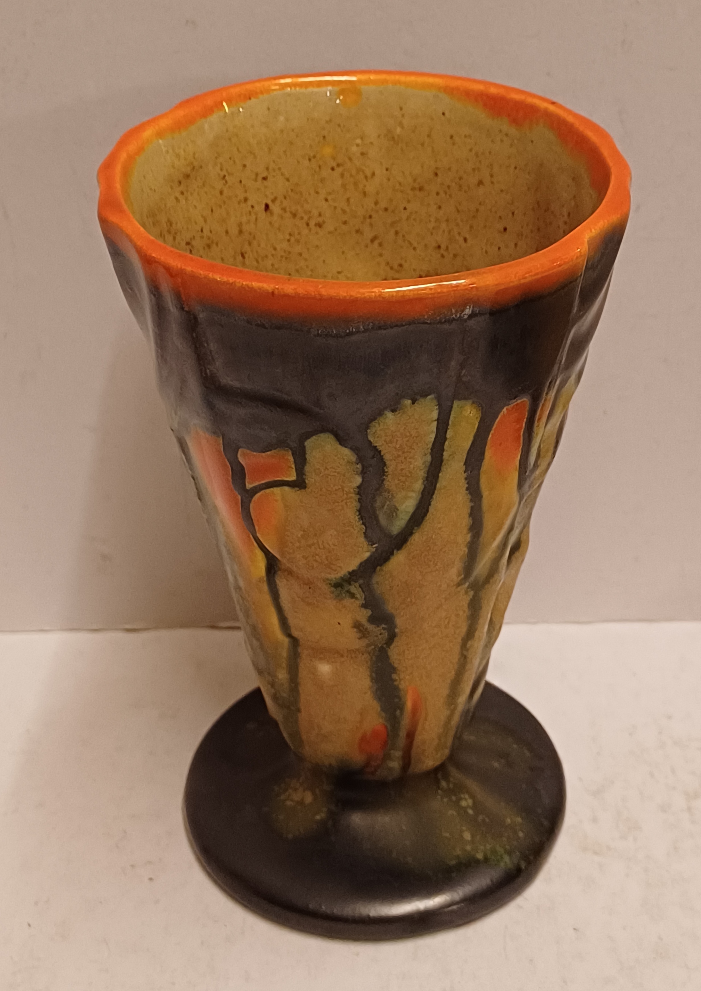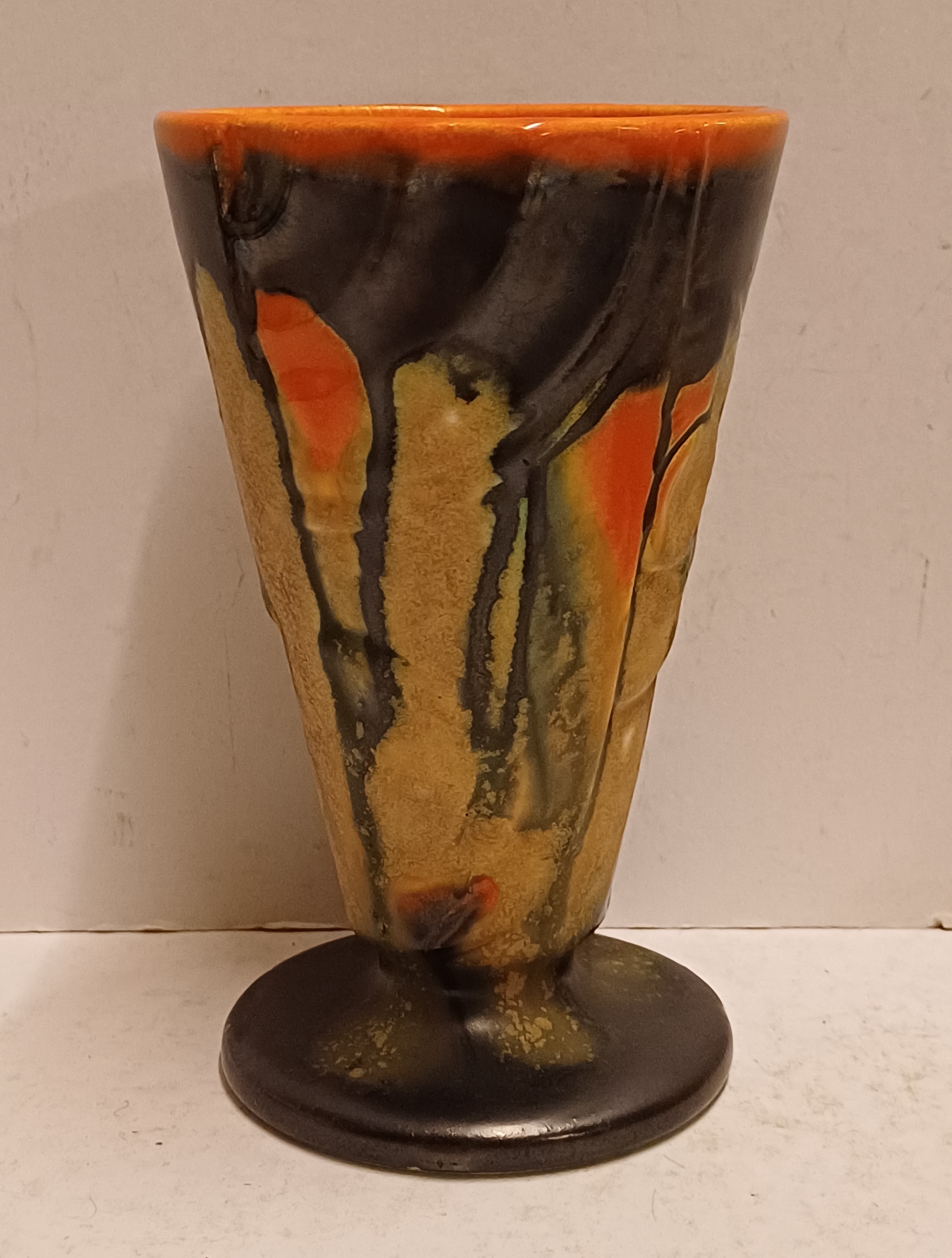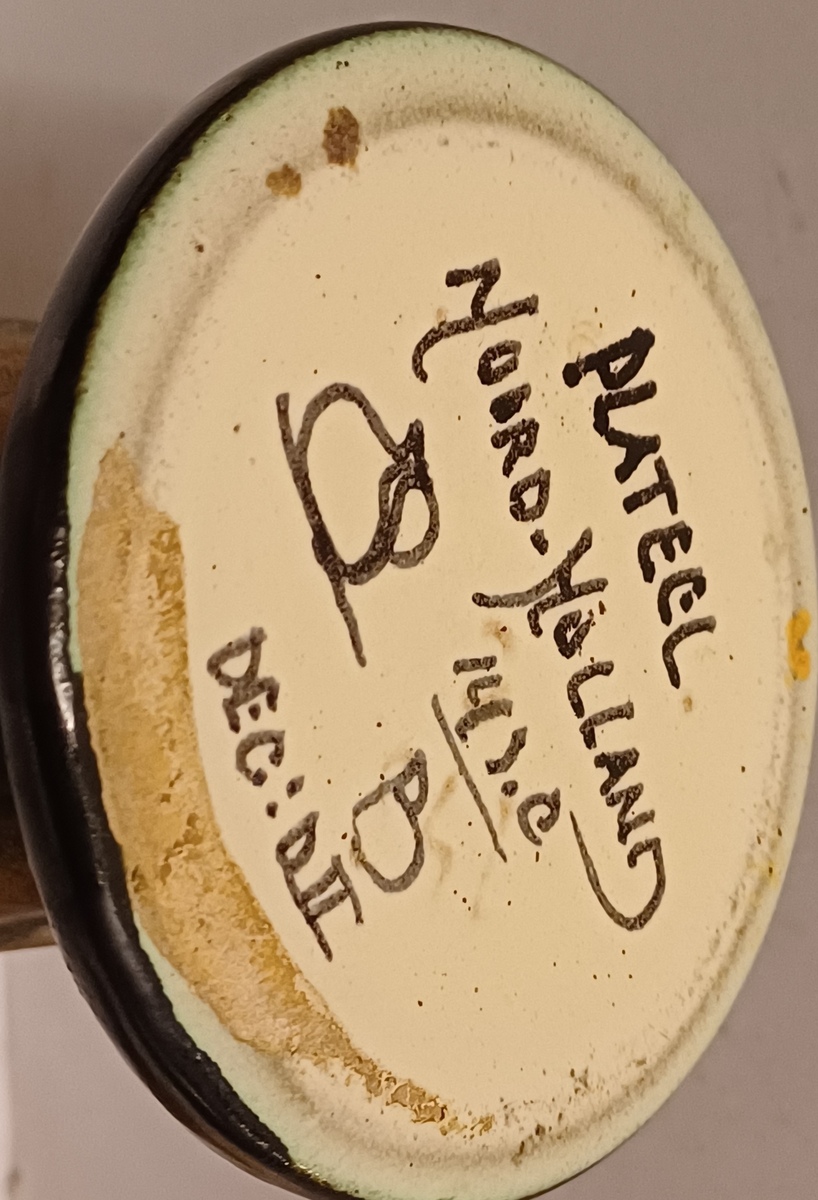 Met spuit glazuur in oranje en zwart. Onderzijde gesigneerd.