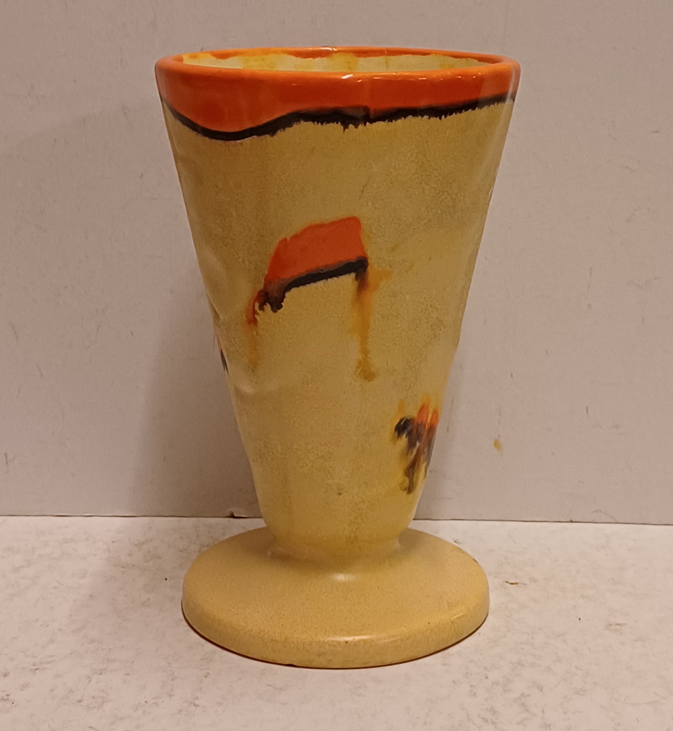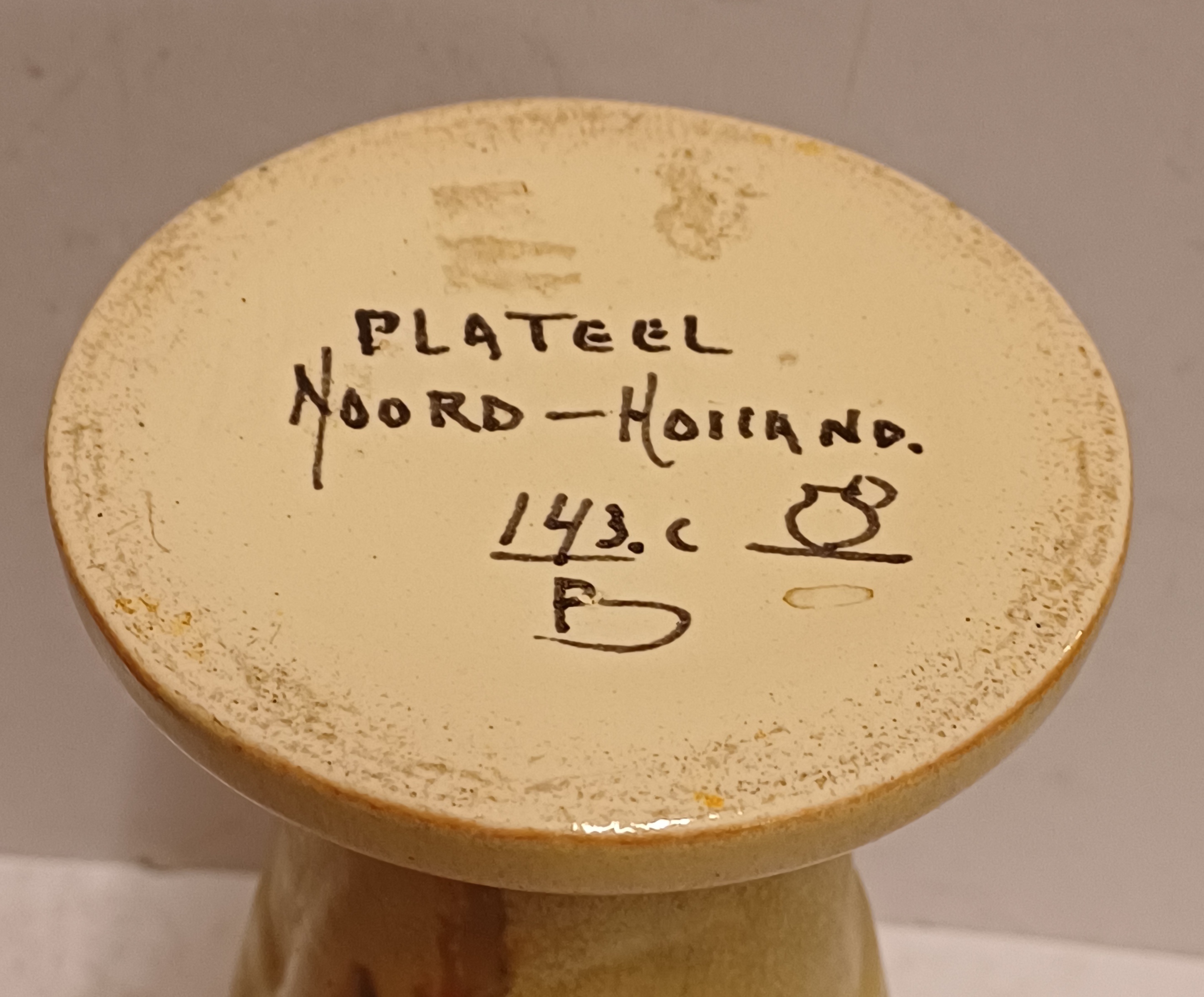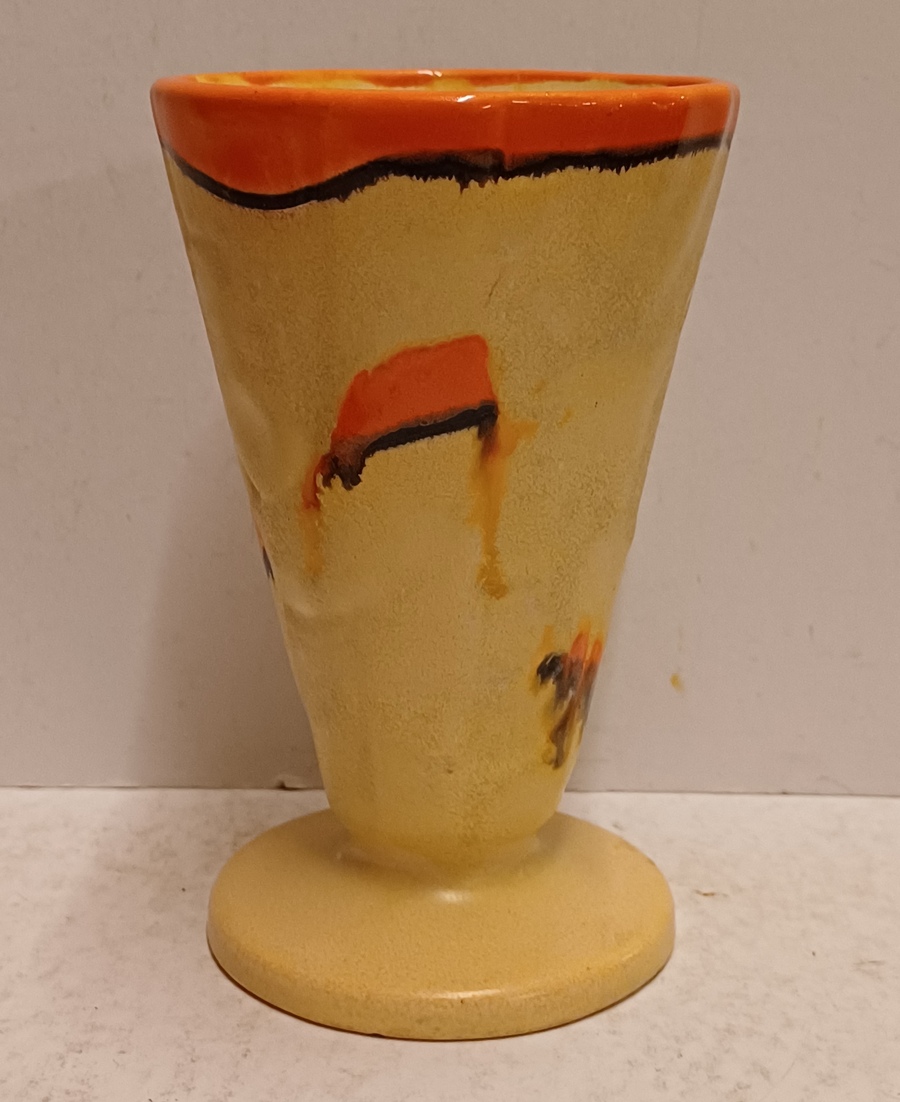 Met spuit glazuur in oranje en geel. Onderzijde gesigneerd.