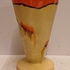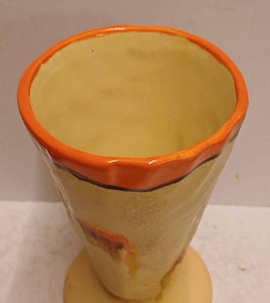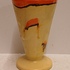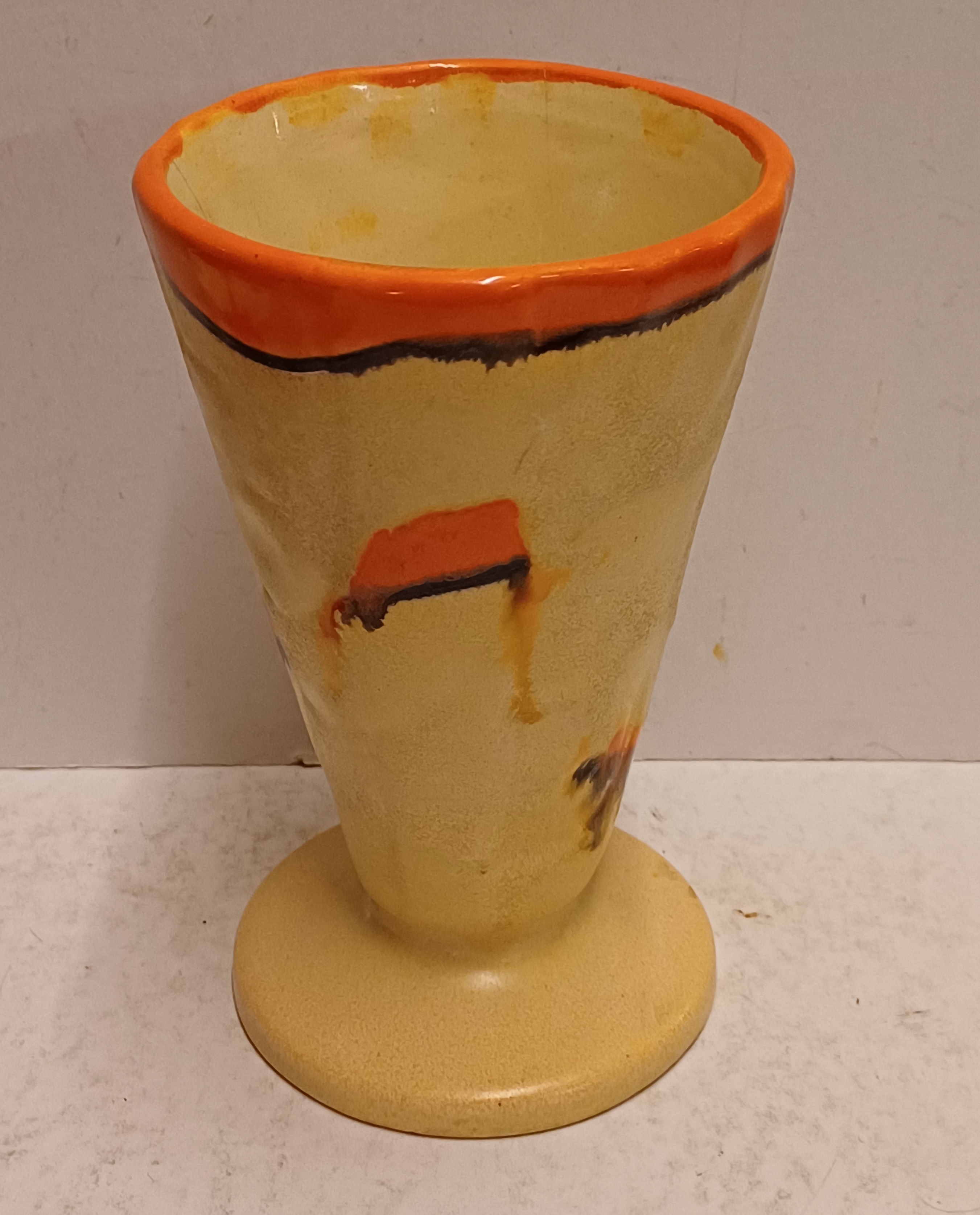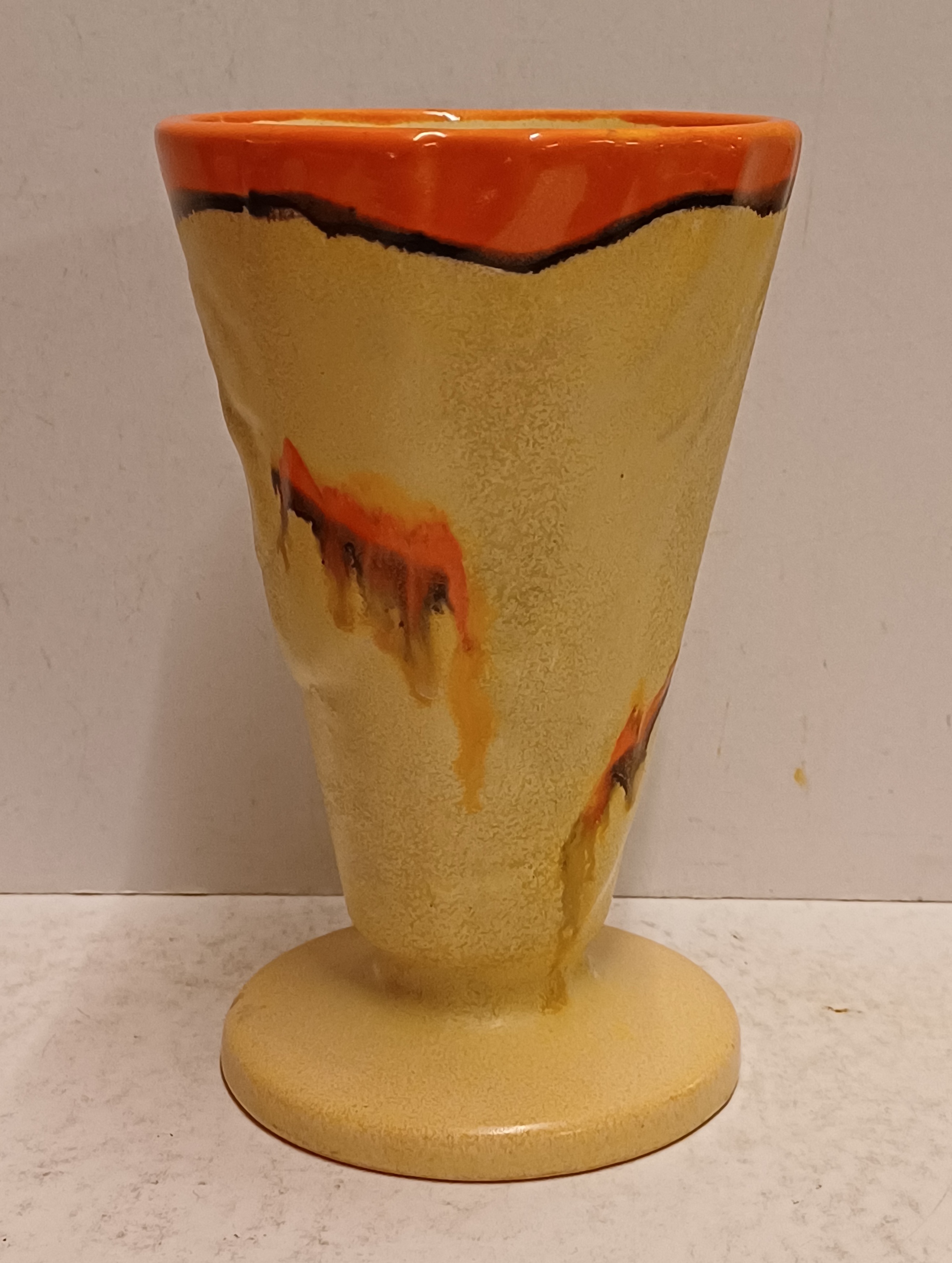 Met spuit glazuur in oranje en geel. Onderzijde gesigneerd.