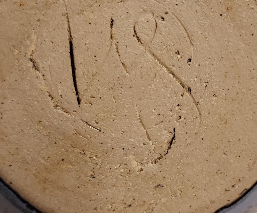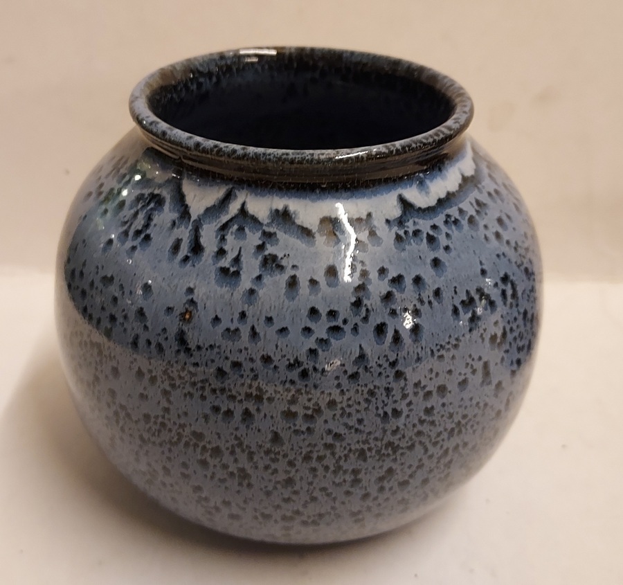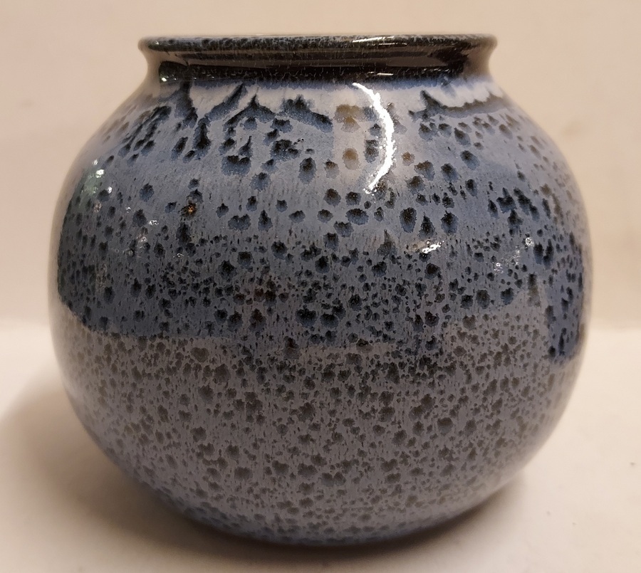 Small spherical vase with blue speckled glaze. Signed WS, produced by own Studio.