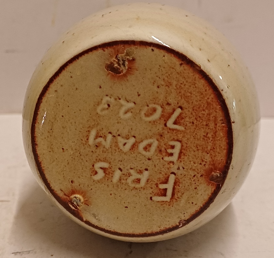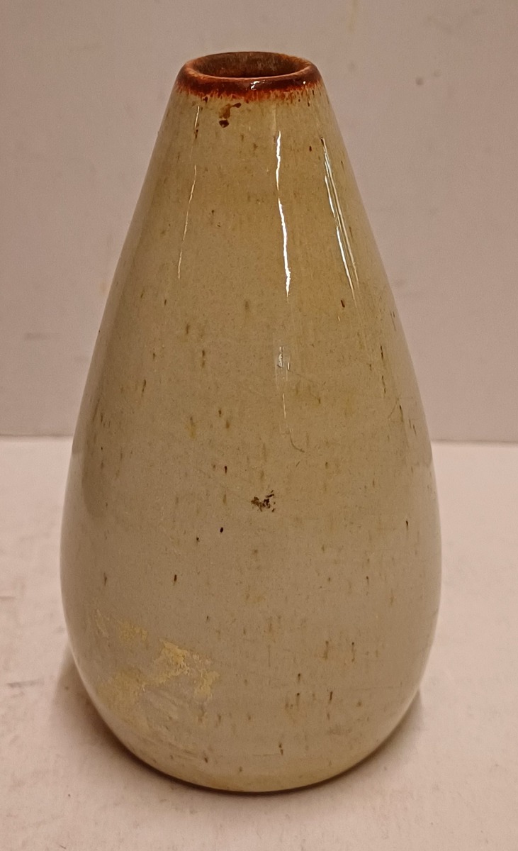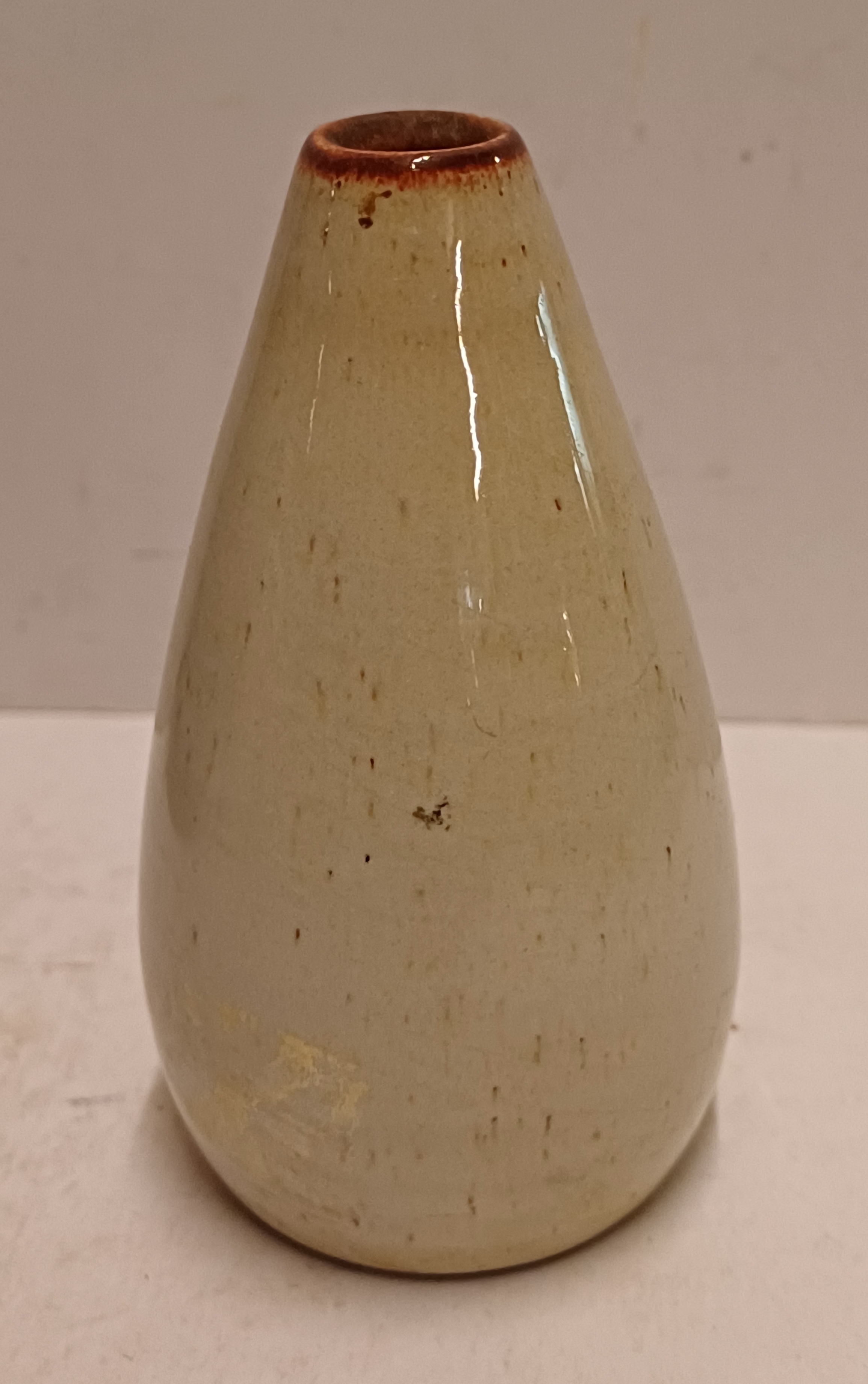 Klein conisch vaasje met grijze glazuur. Onderzijde met fabrieksmerk en modelnummer.