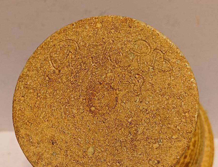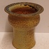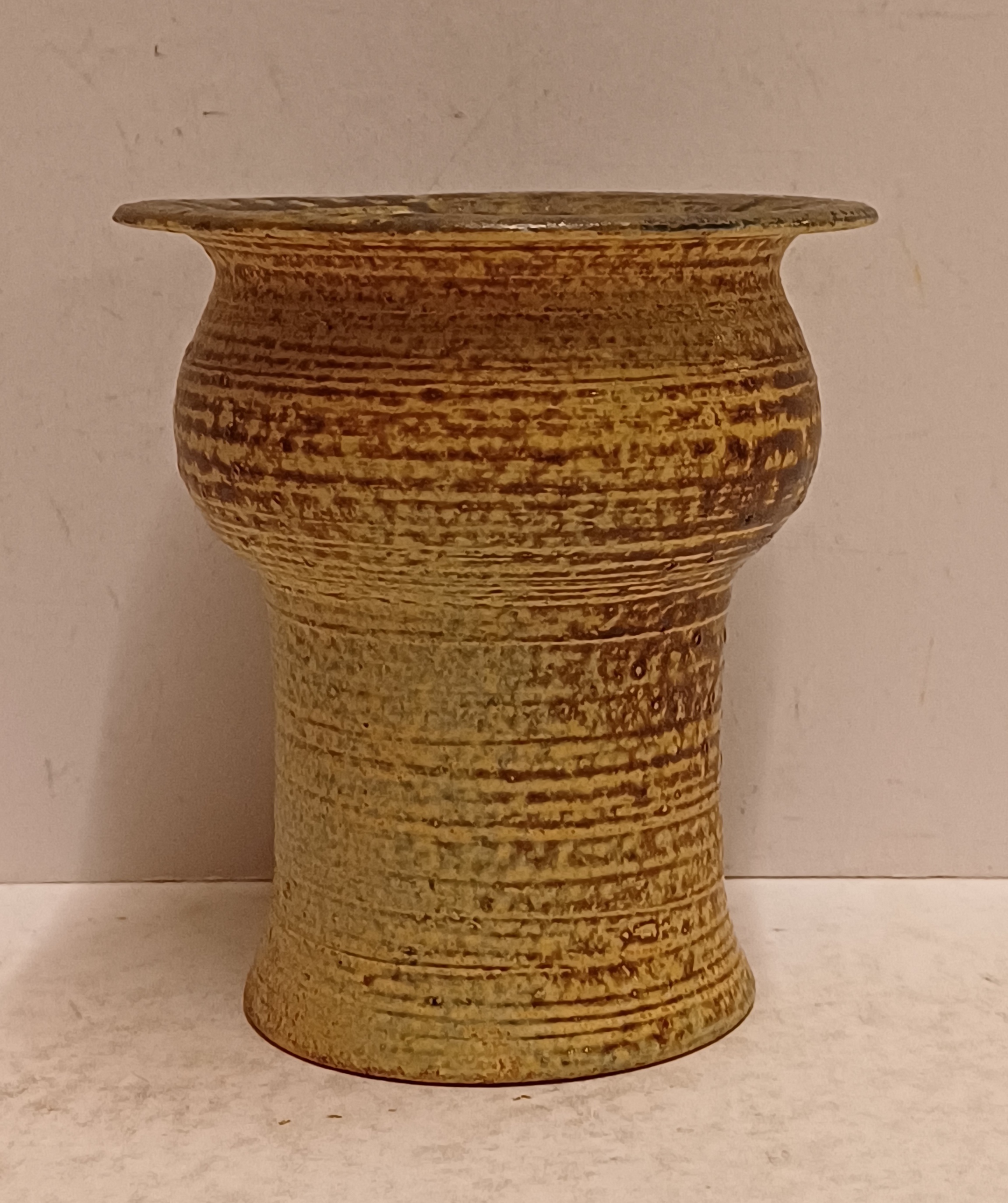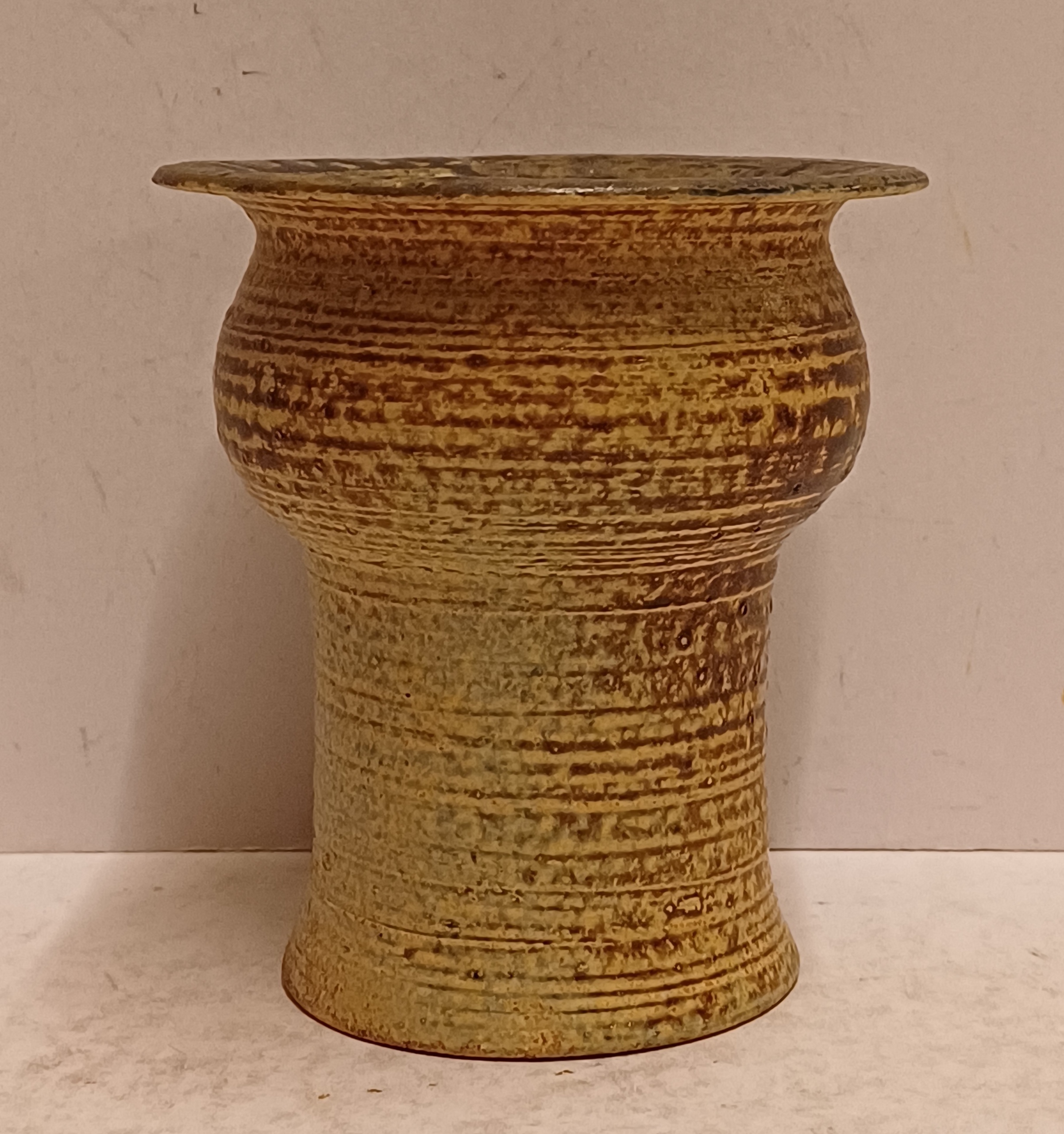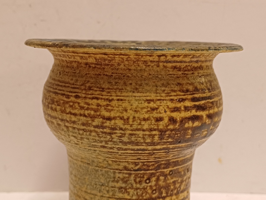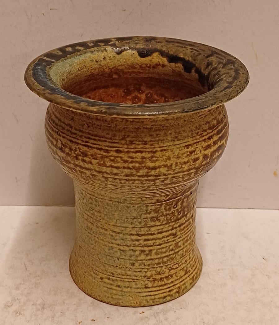 Vroeg hand gedraaid vaasje met bruinige glazuur. Onderzijde gesigneerd en gedateerd '68.