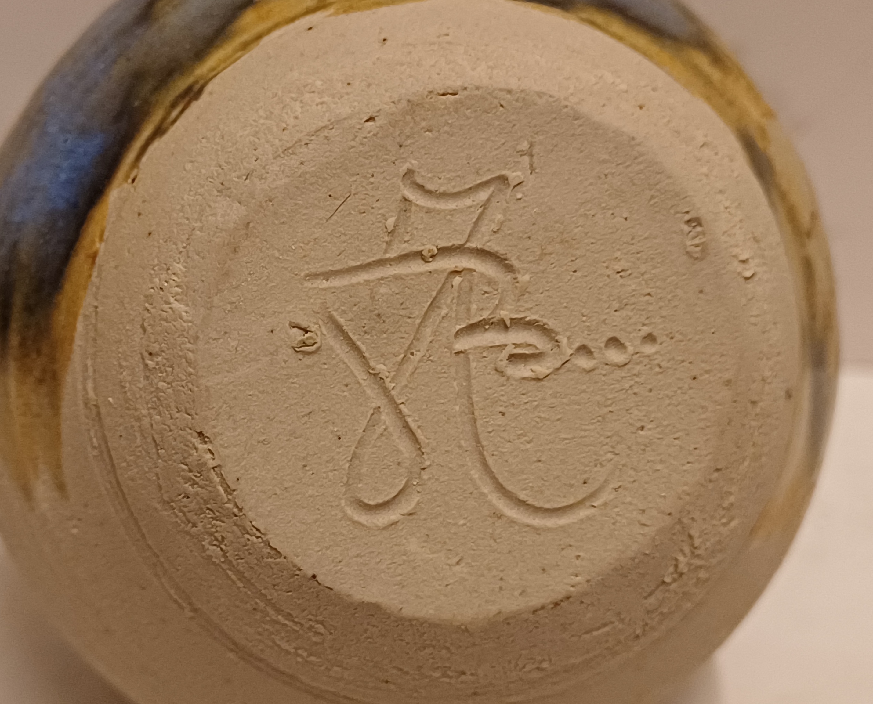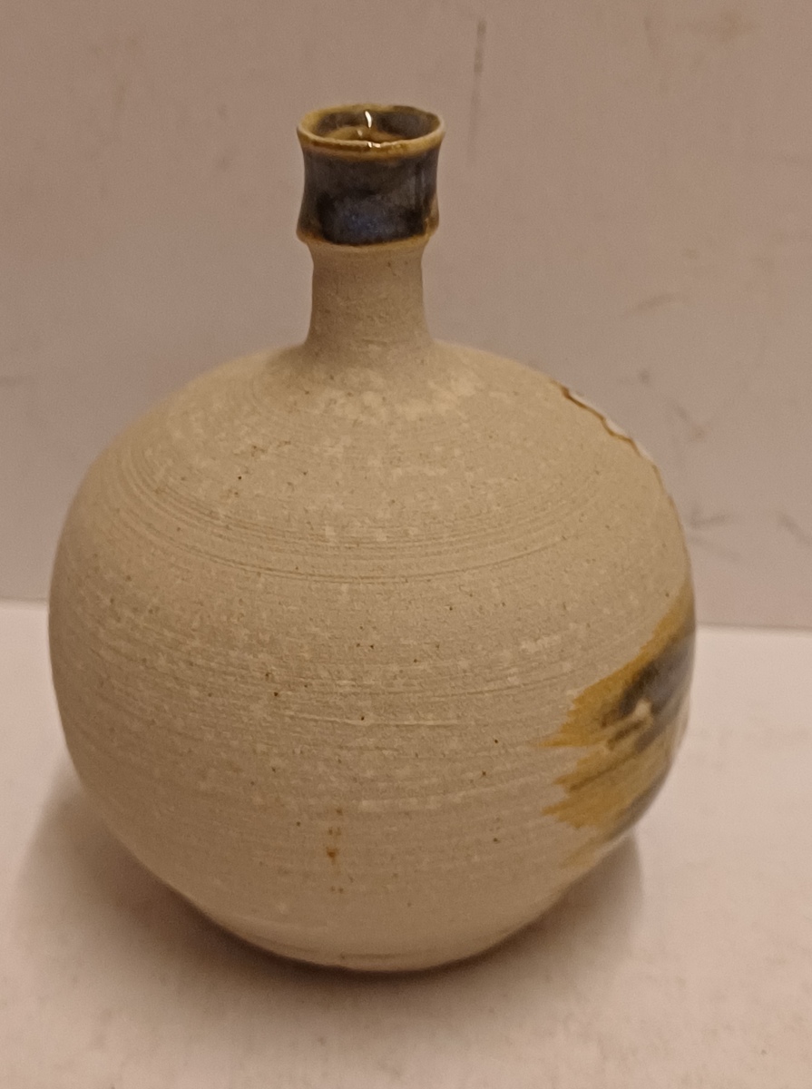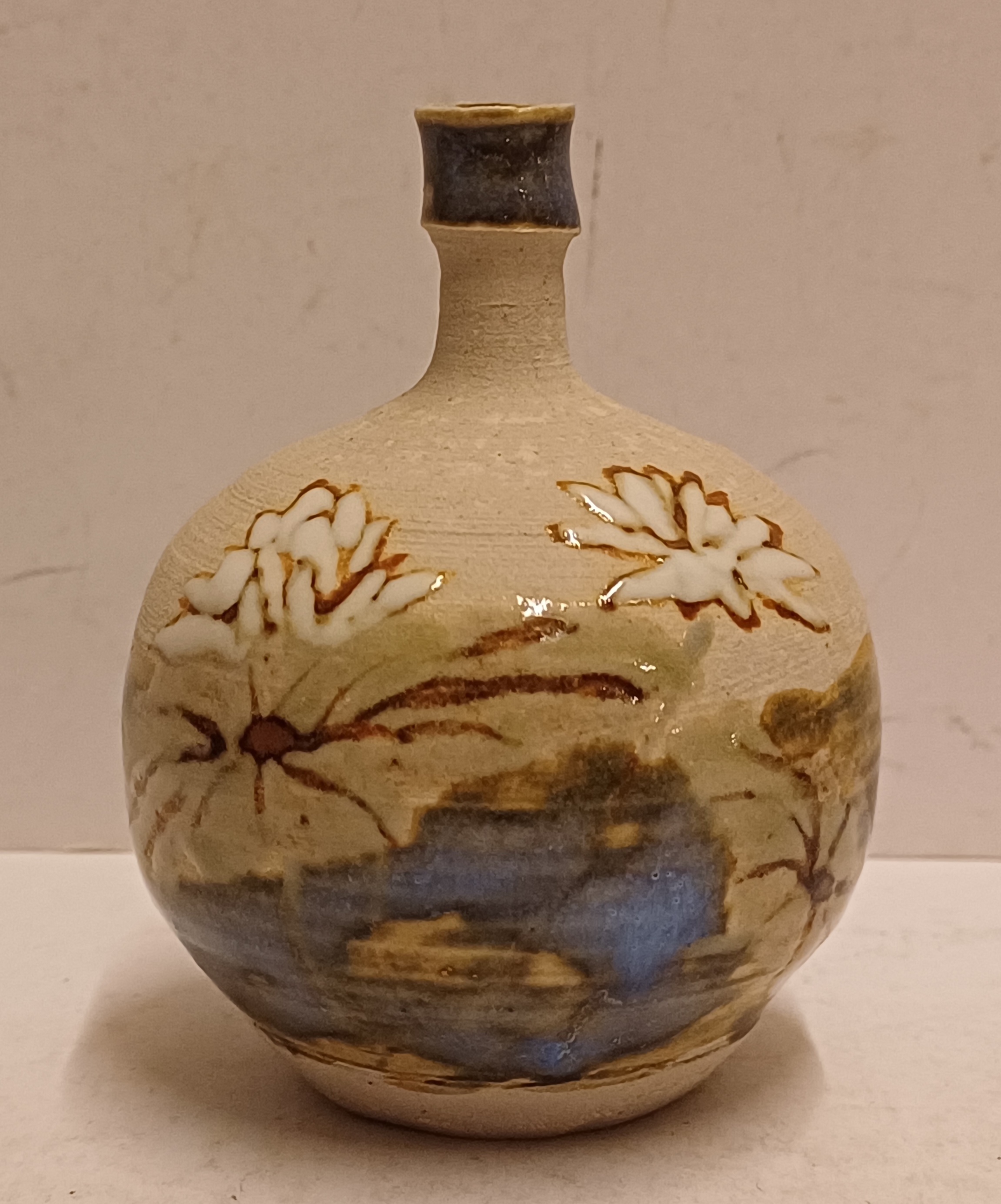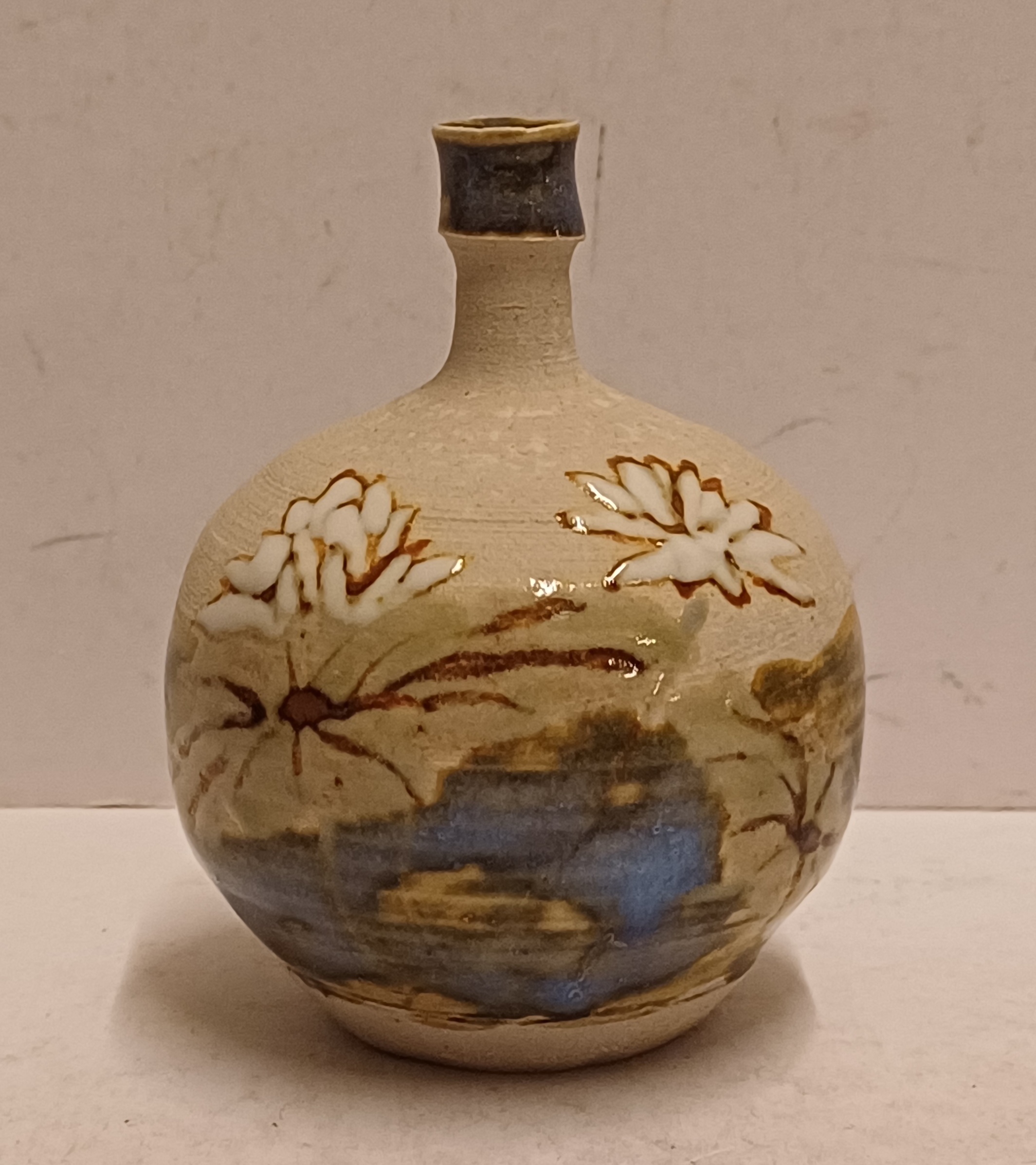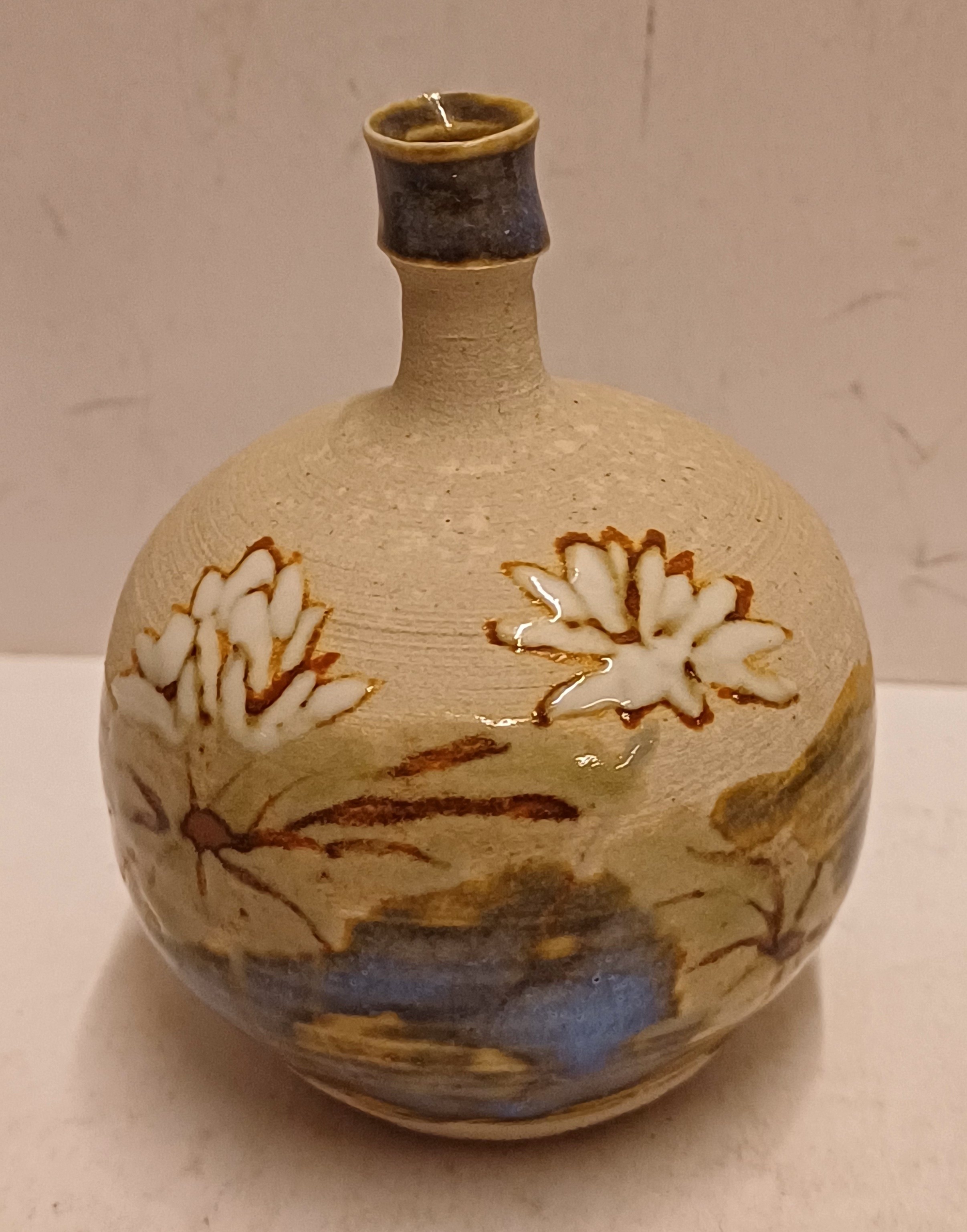 Klein vaasje met florale decoratie op ongeglazuurde ondergrond. Onderzijde met kunstenaars monogram.