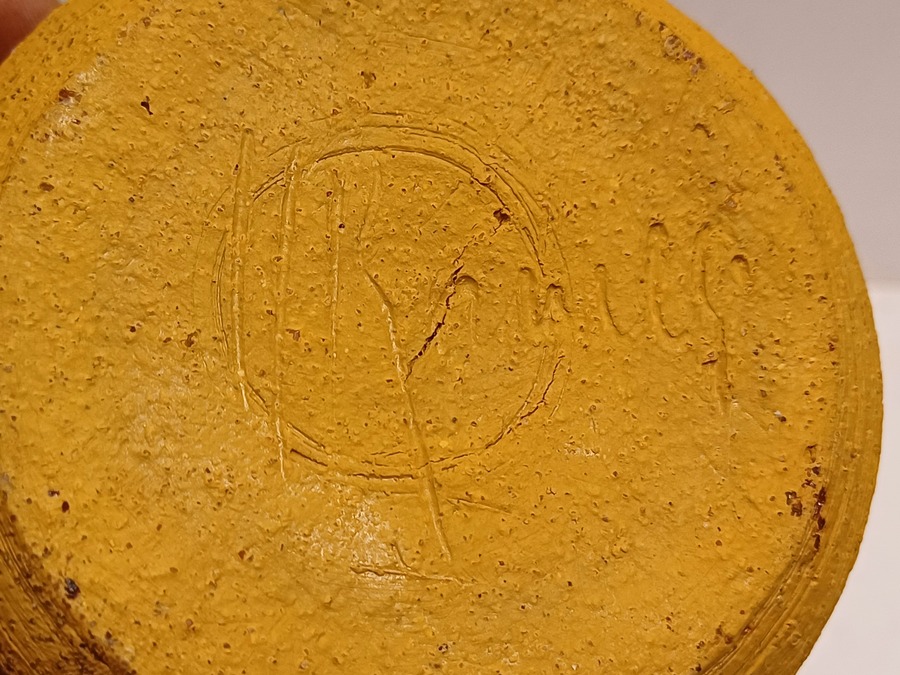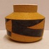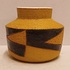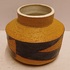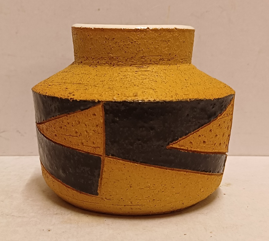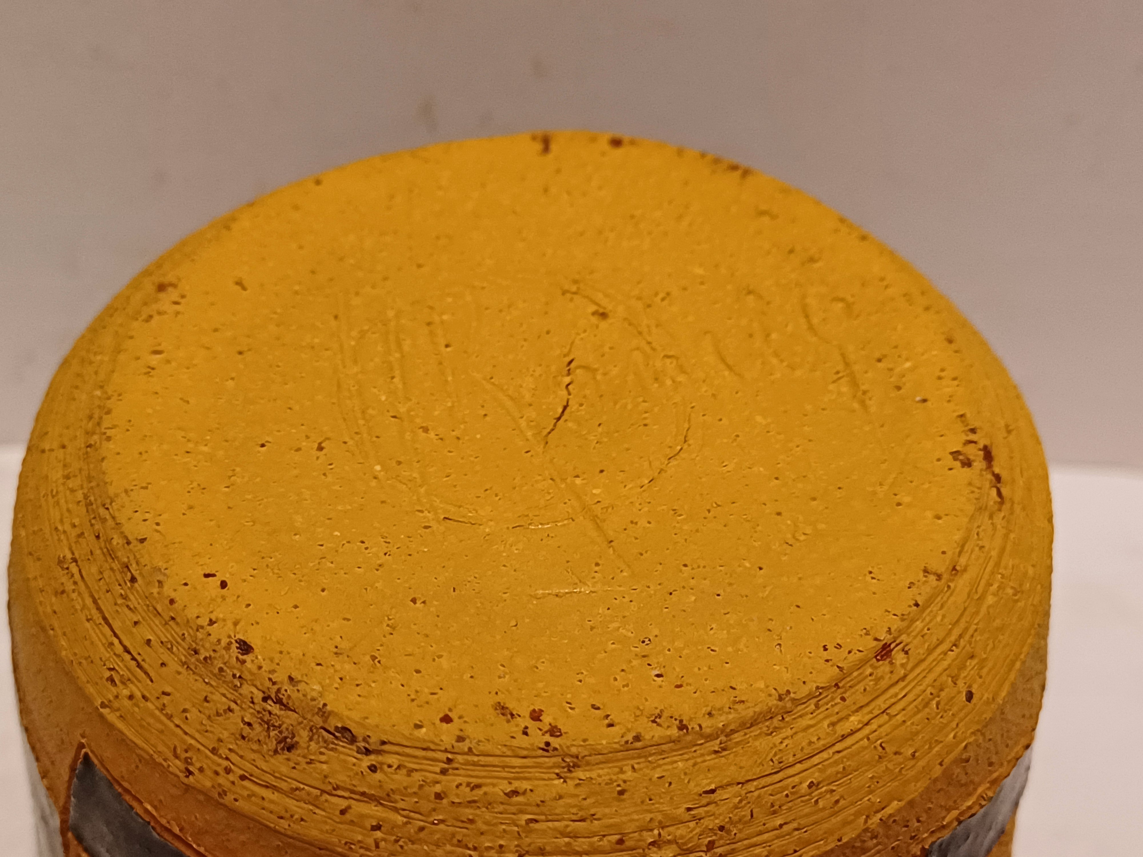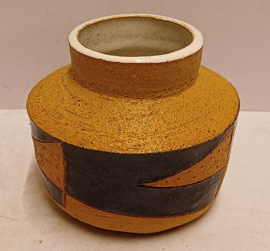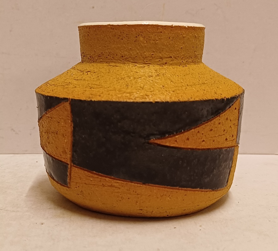 Klein vaasje met deels zwart geglazuurde vlakken op ruwe lichte ondergrond. Onderzijde gesigneerd