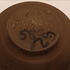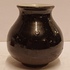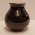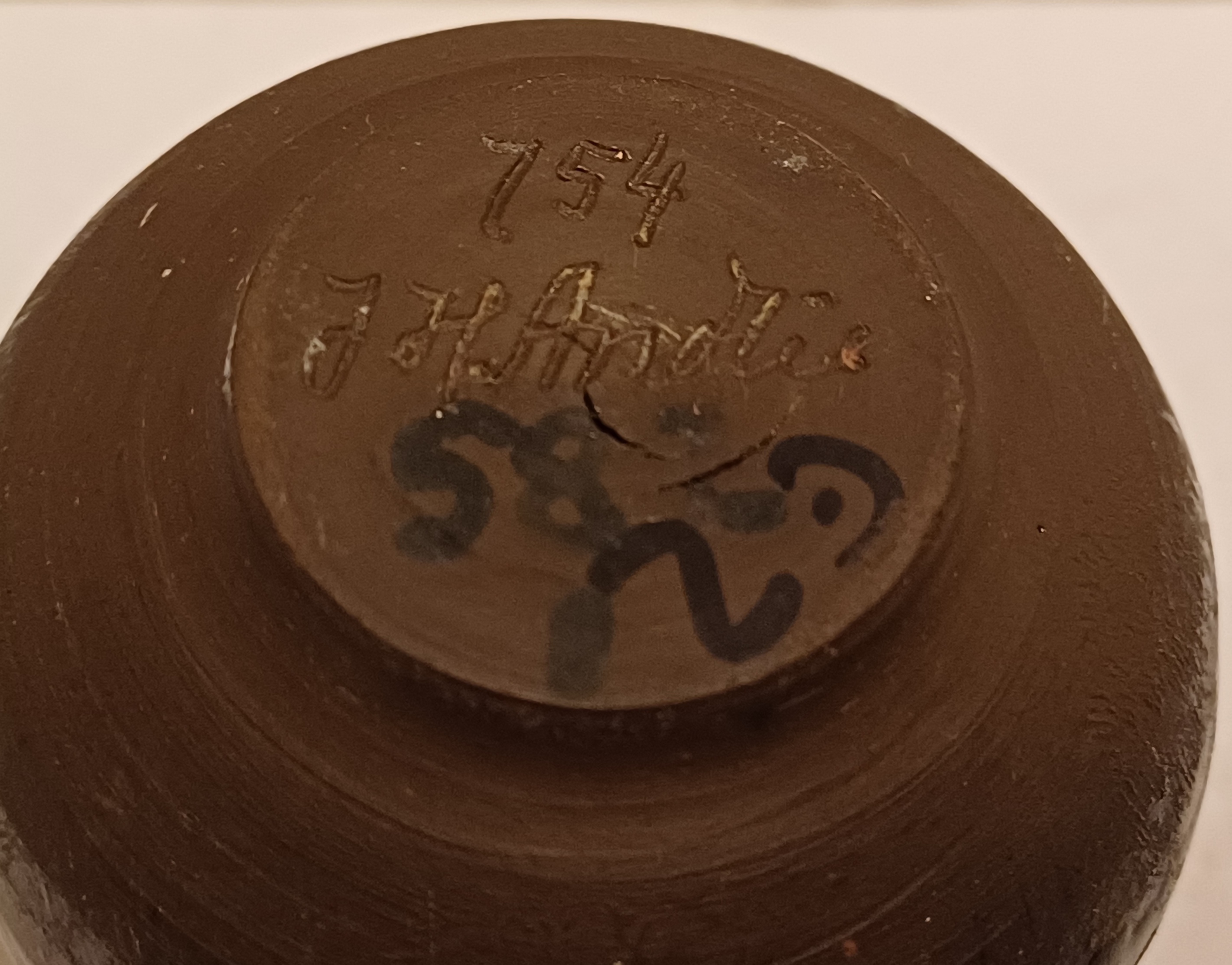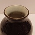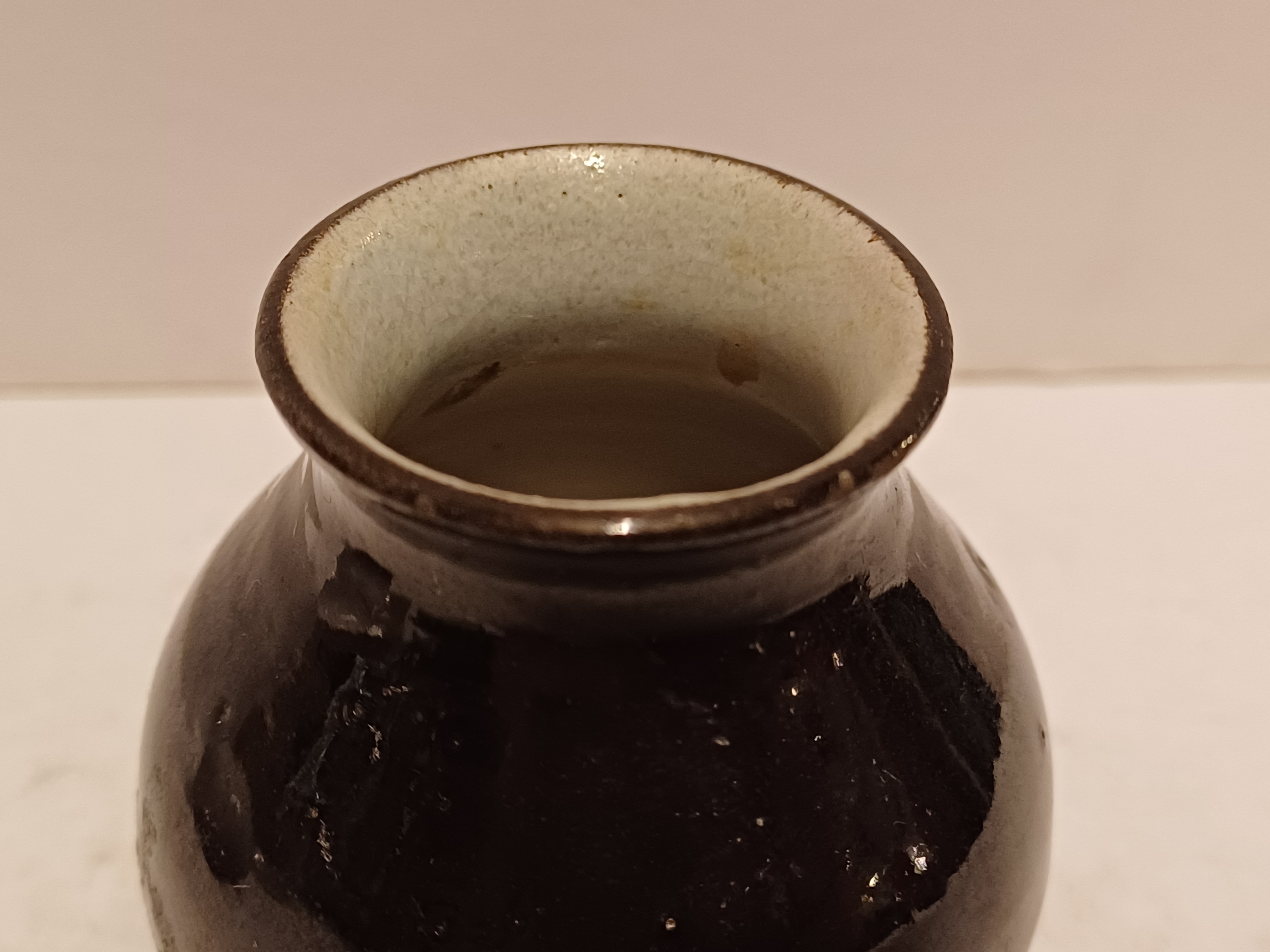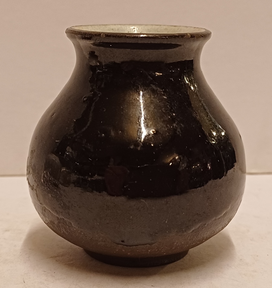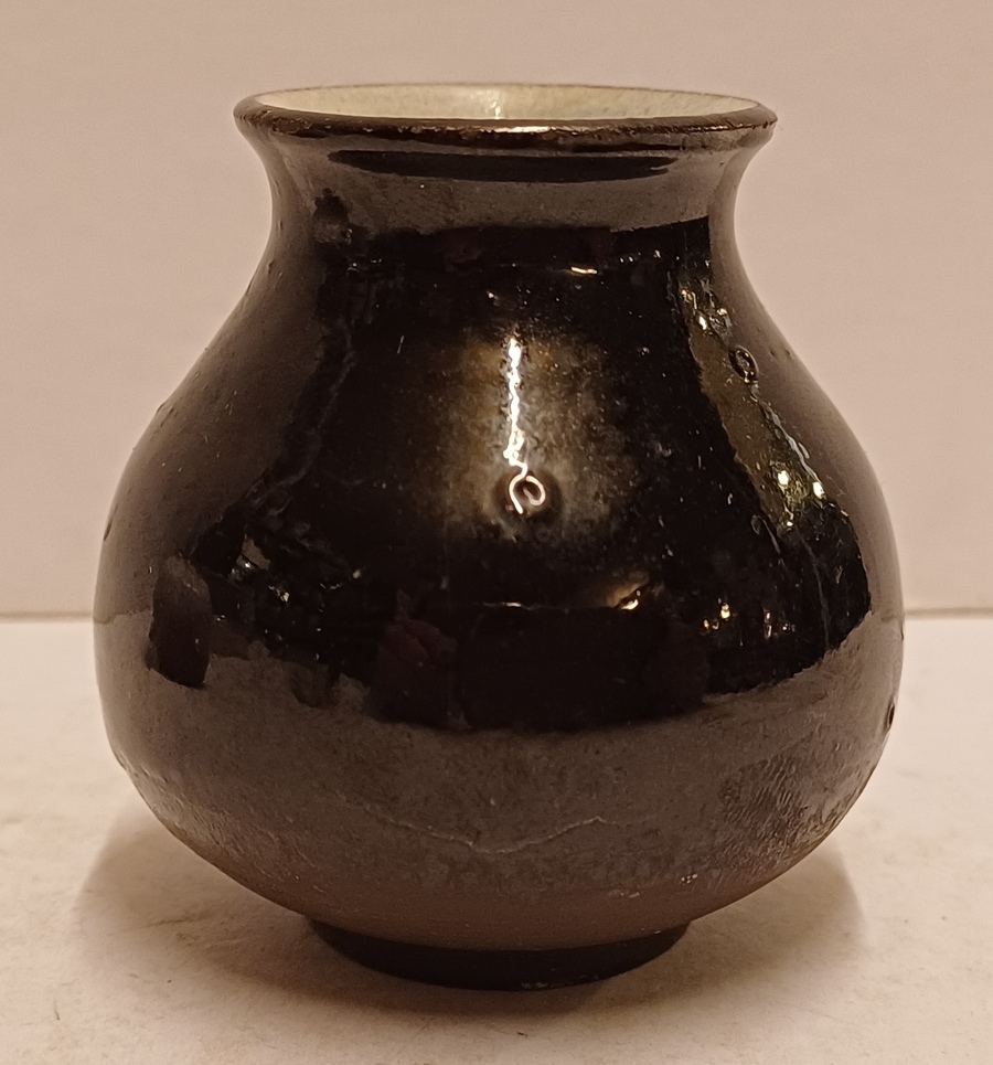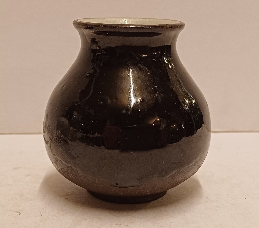 Klein hand gedraaid vaasje met donkere glanzende glazuur met aantal kraters, en mat witte binnenzijde. Onderzijde gesigneerd modelnummer 754 en glazuur code 582.
