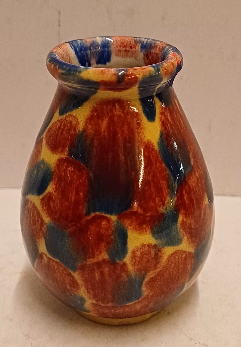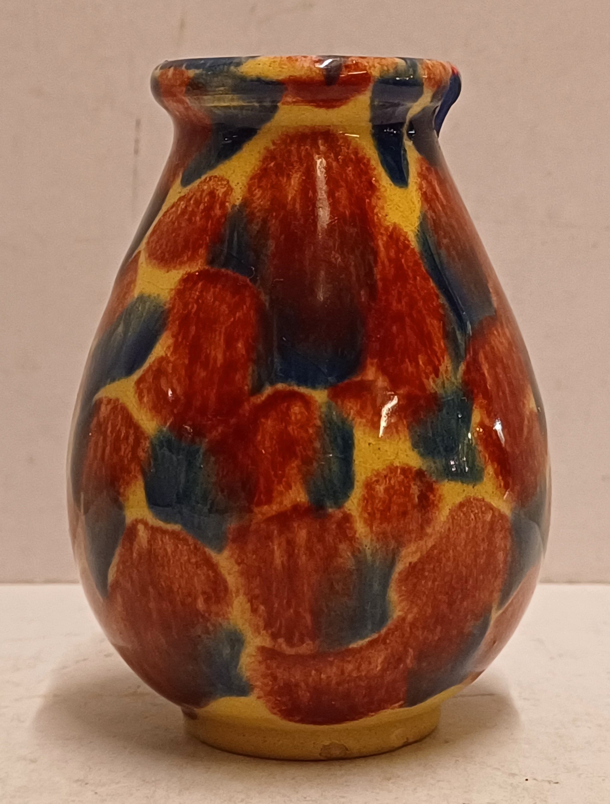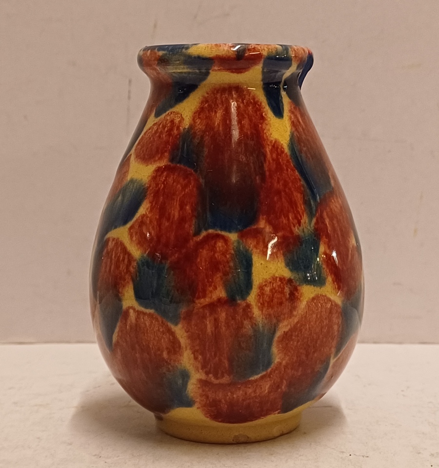 Aardewerken vaasje met rood blauw gevlekte glazuur op creme fond. Onderzijde gesigneerd met glazuurcode 4748 en werknummer 511.
