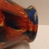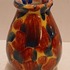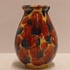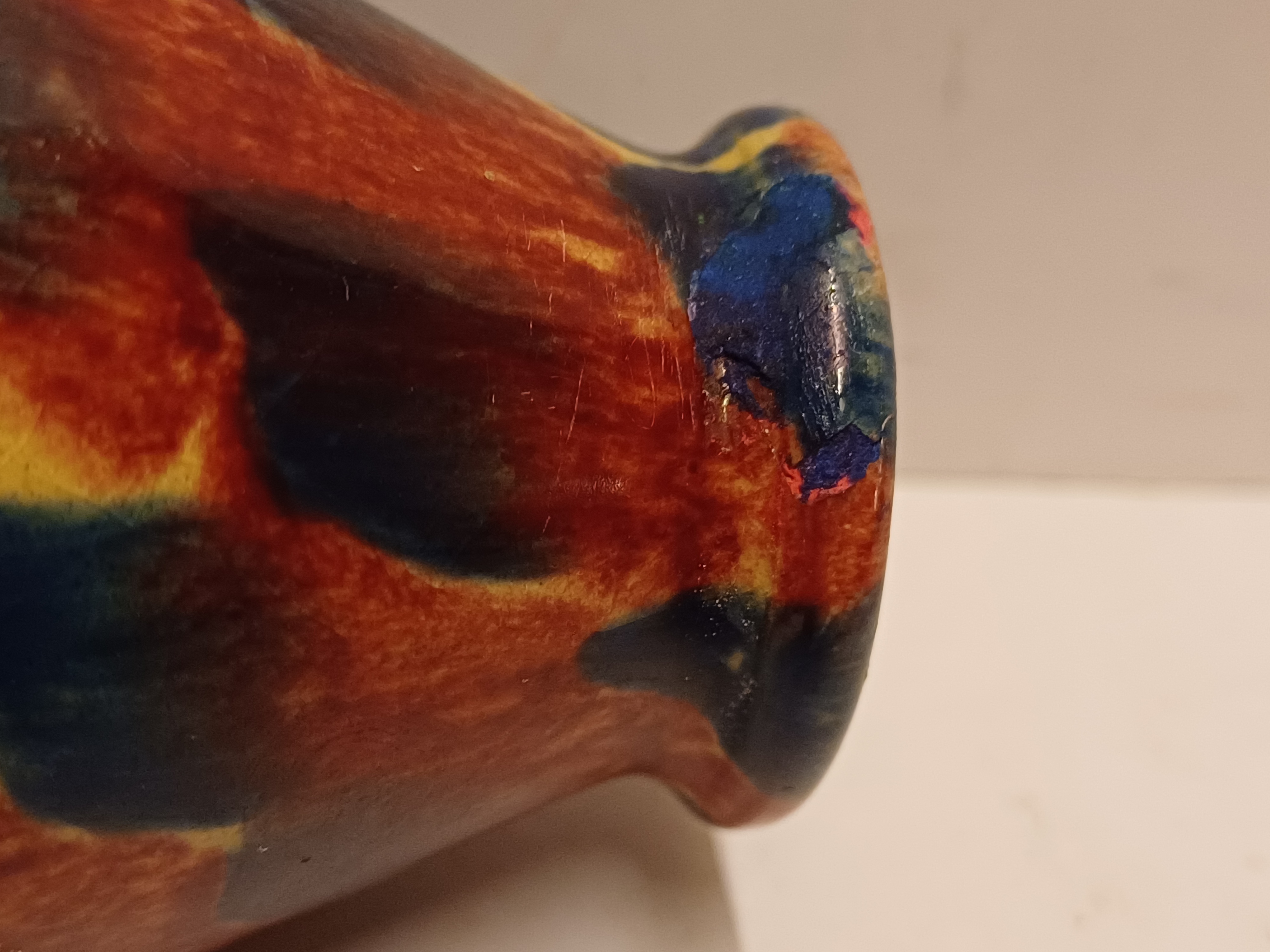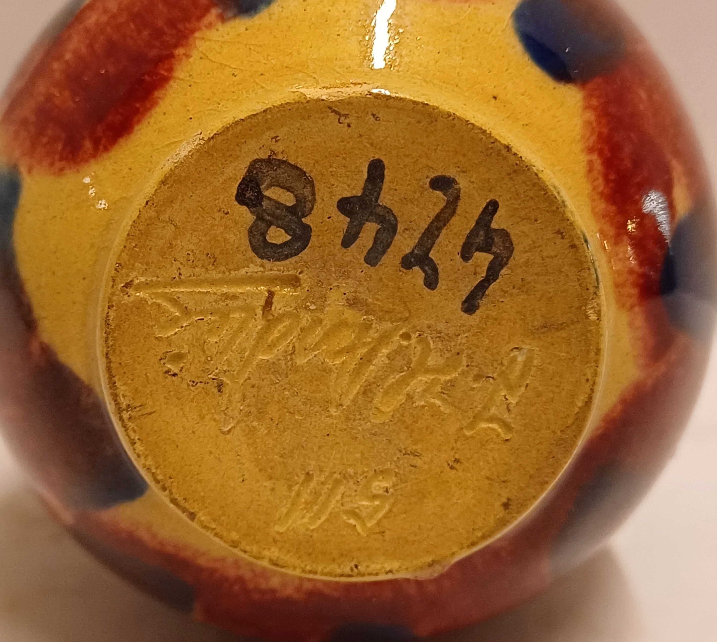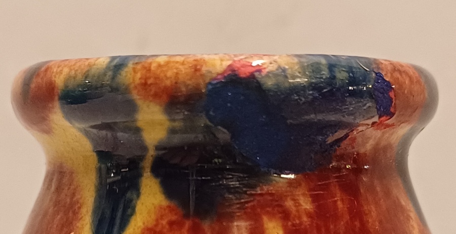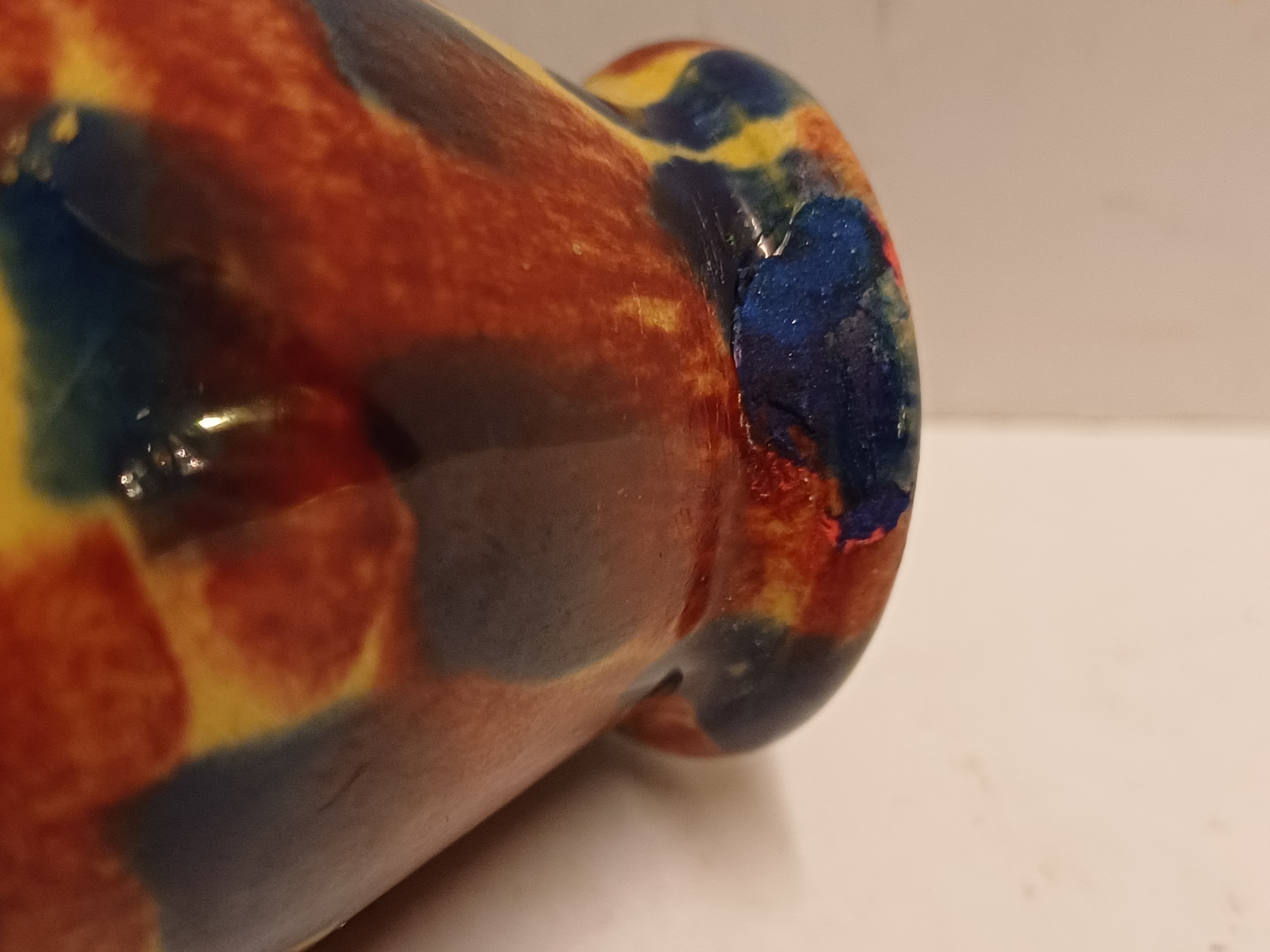 Aardewerken vaasje met rood blauw gevlekte glazuur op creme fond. Onderzijde gesigneerd met glazuurcode 4748 en werknummer 511.