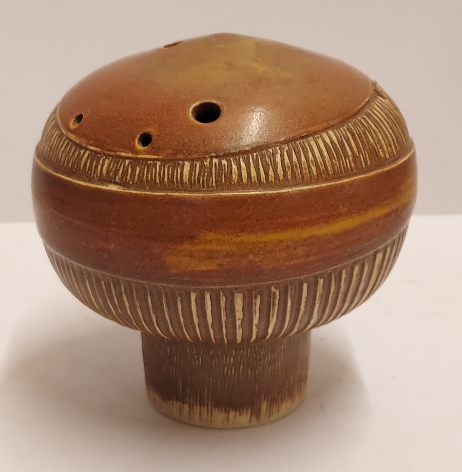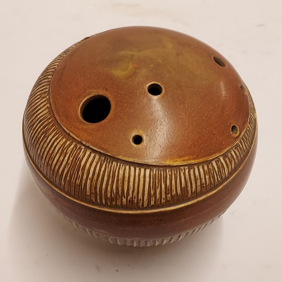 Bulbous shape with scratched decorations and multiple holes across the sphere. Signed with monogram.