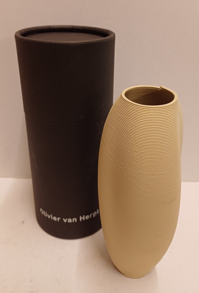 3D printed vase designed by Olivier van Herpt. Created for the centennial celebration of the Ministry of Education, Culture and Science in 2018. Designed and produced using a ceramic 3D printer developed by van Herpt himself.