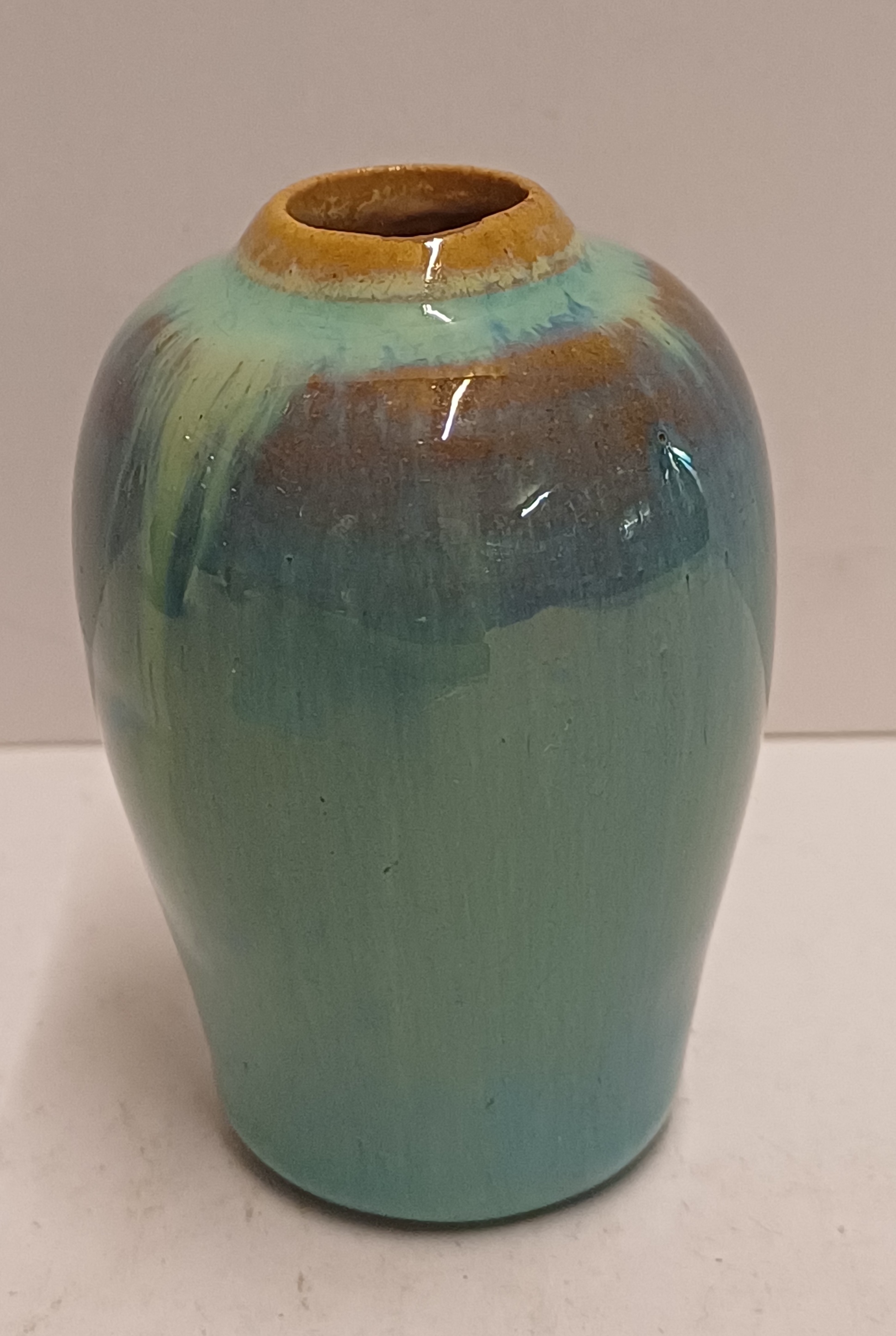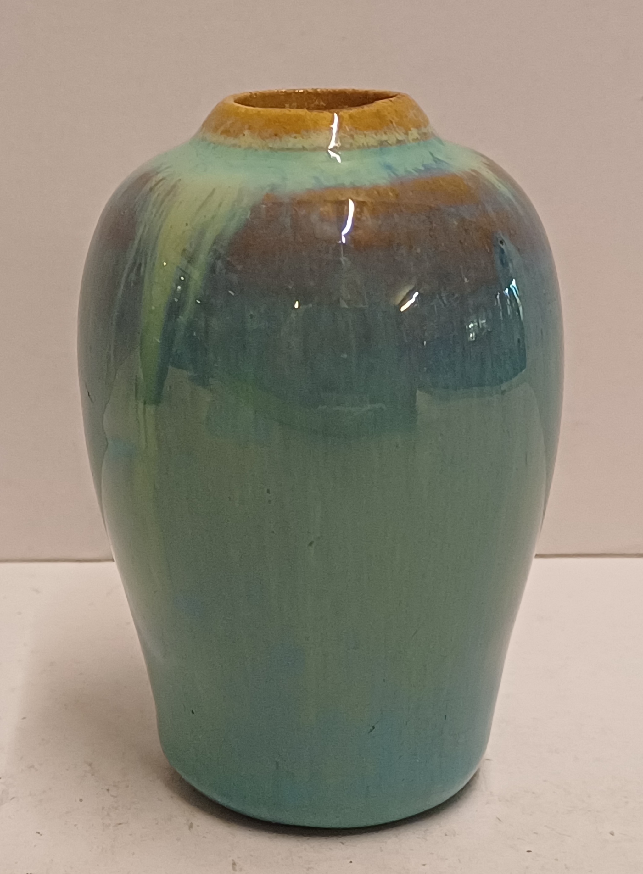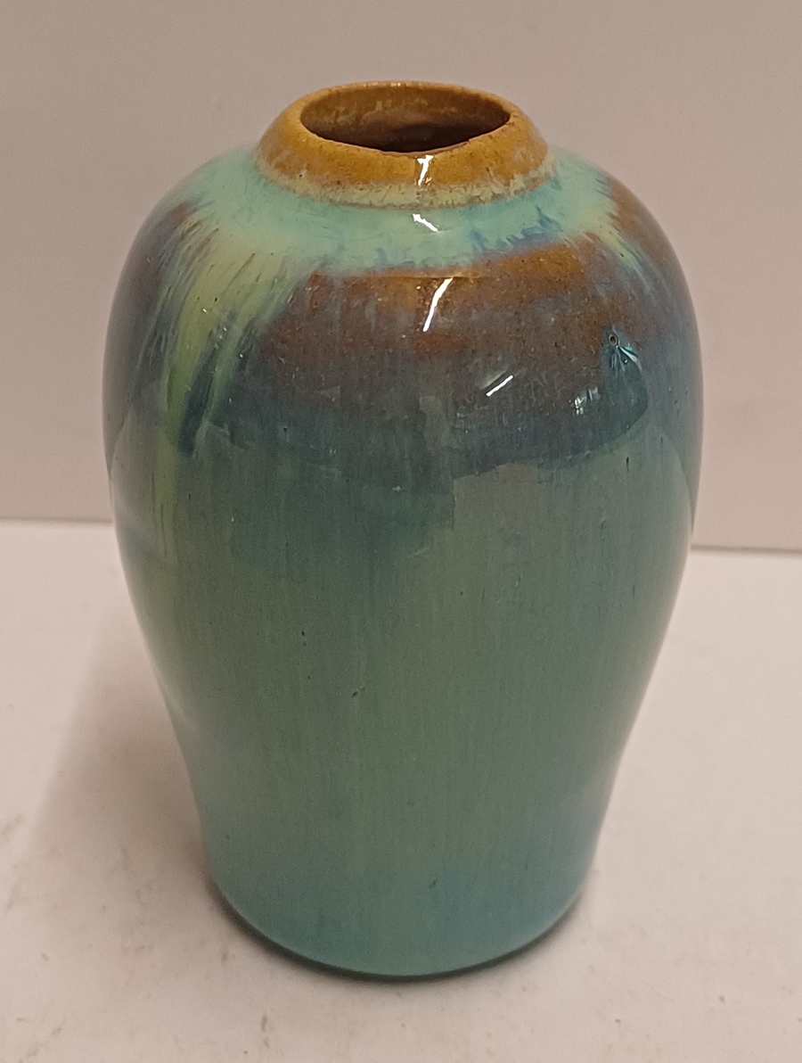 Miniature vase with flowing glaze. Not signed.