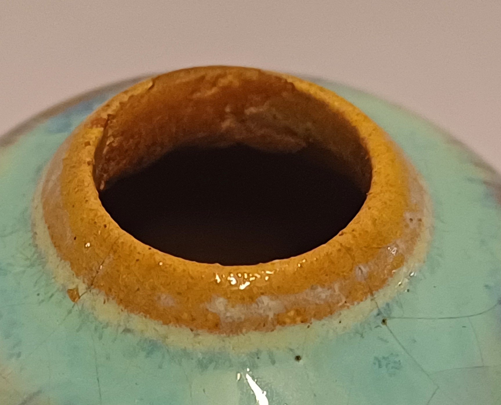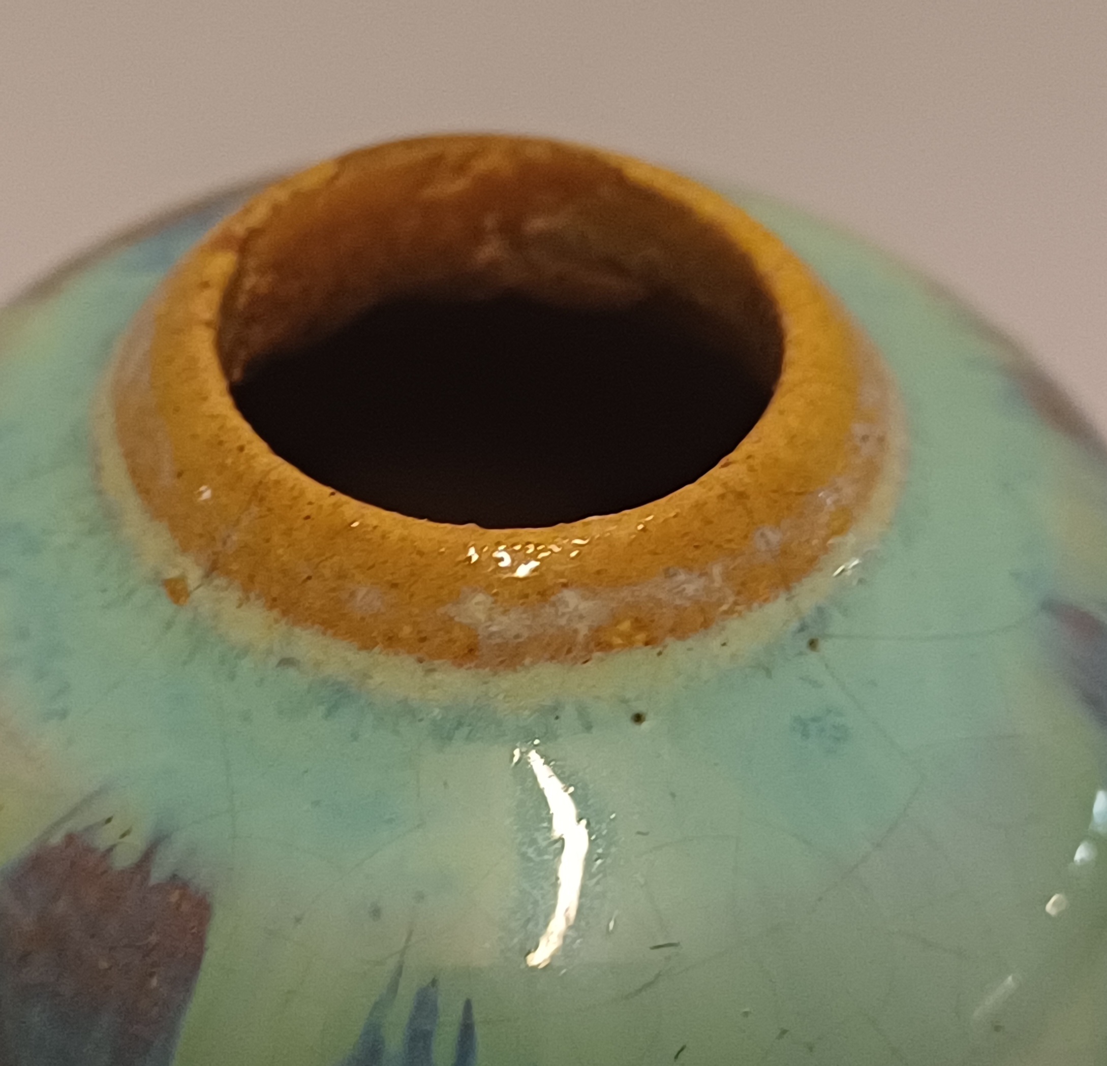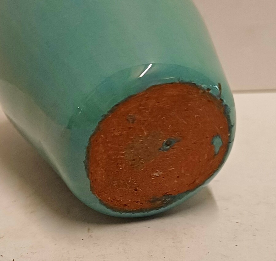 Miniature vase with flowing glaze. Not signed.