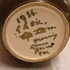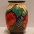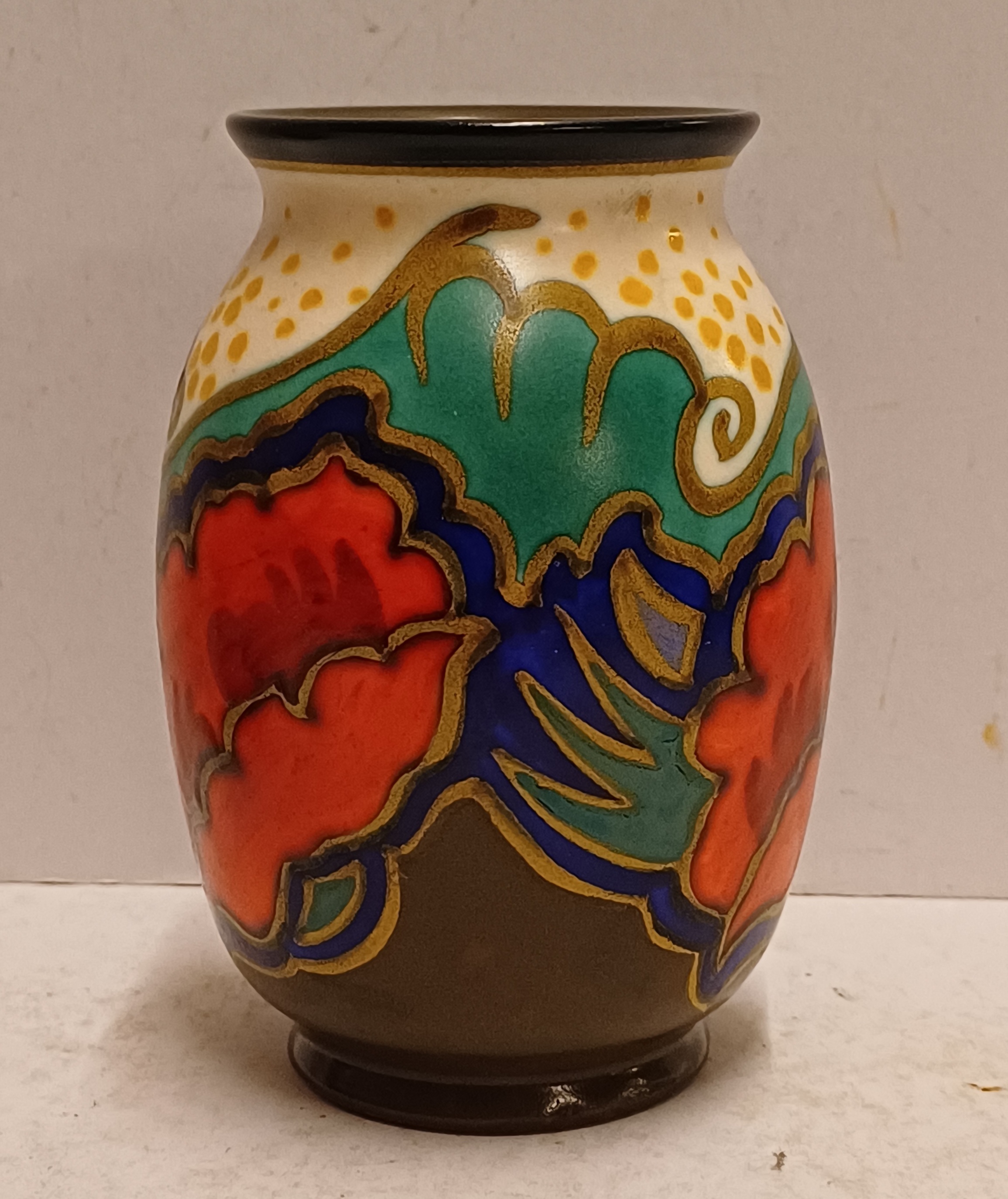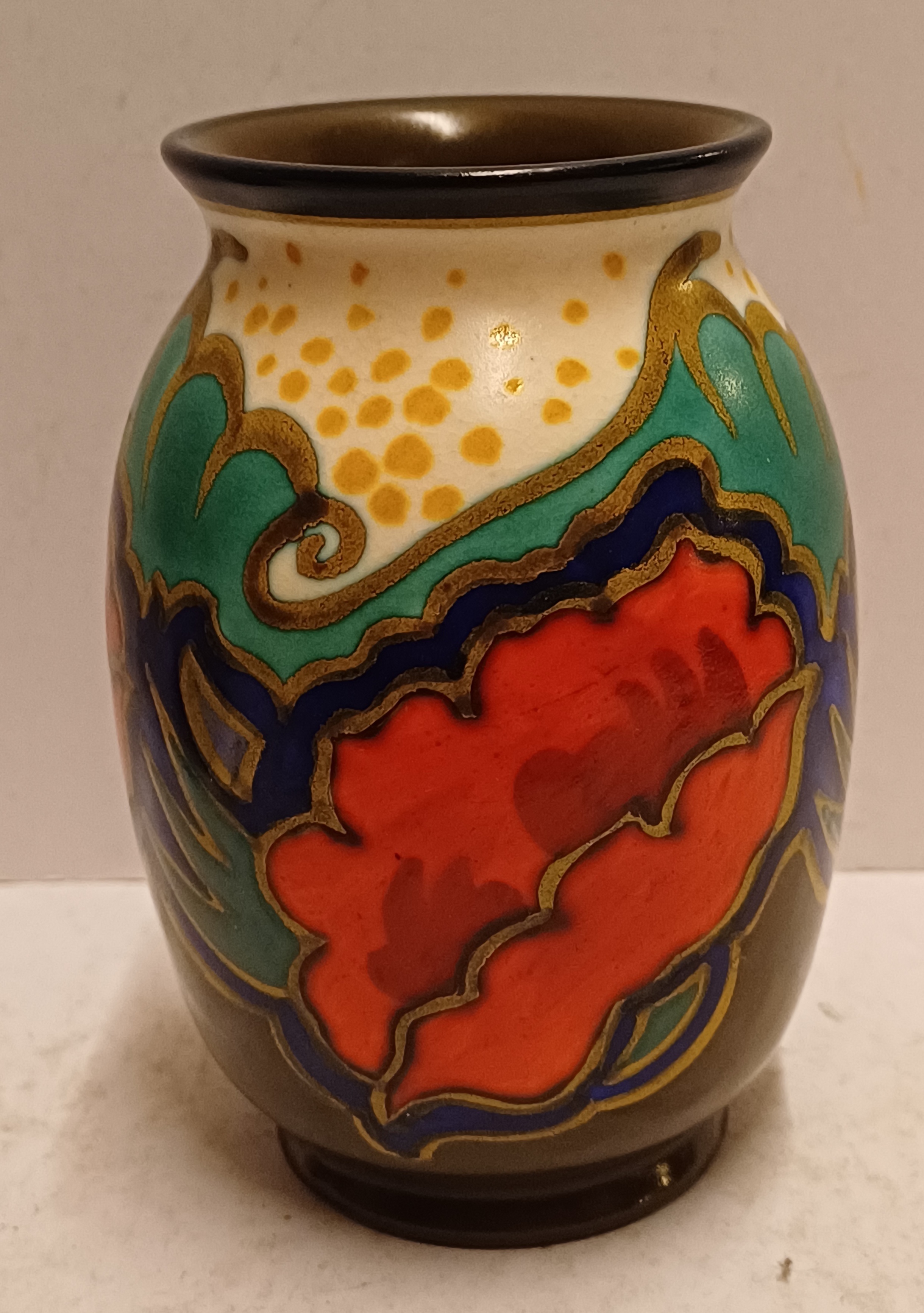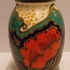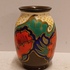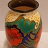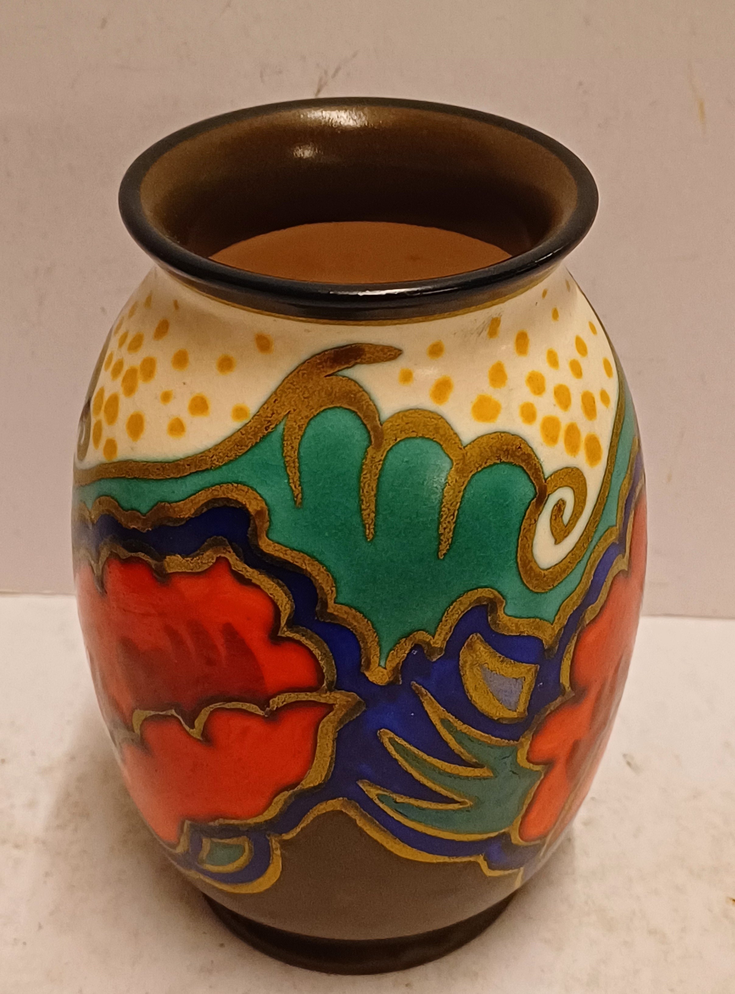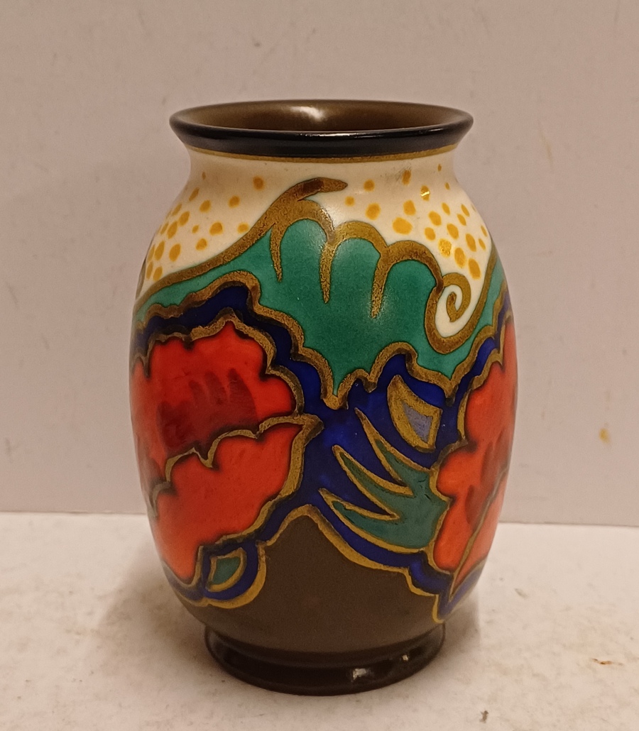 Plateel vaasje met gestileerd floraal decor met rode bloemen. Onderzijde met fabrieksmerk en decornaam.