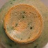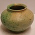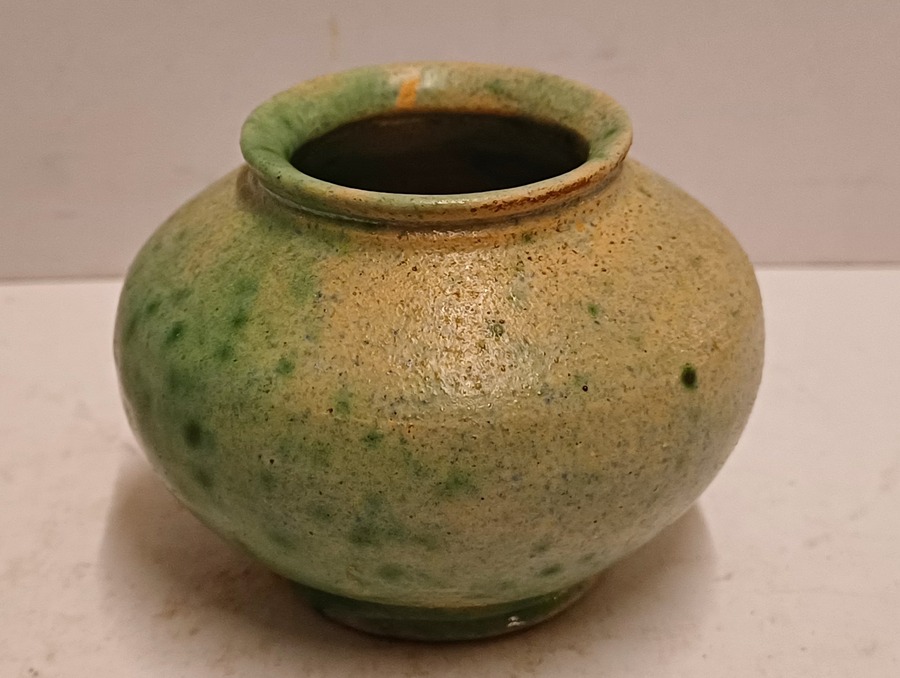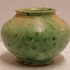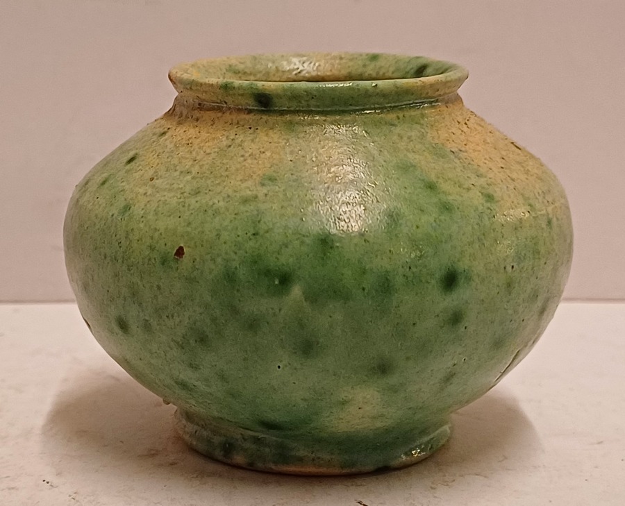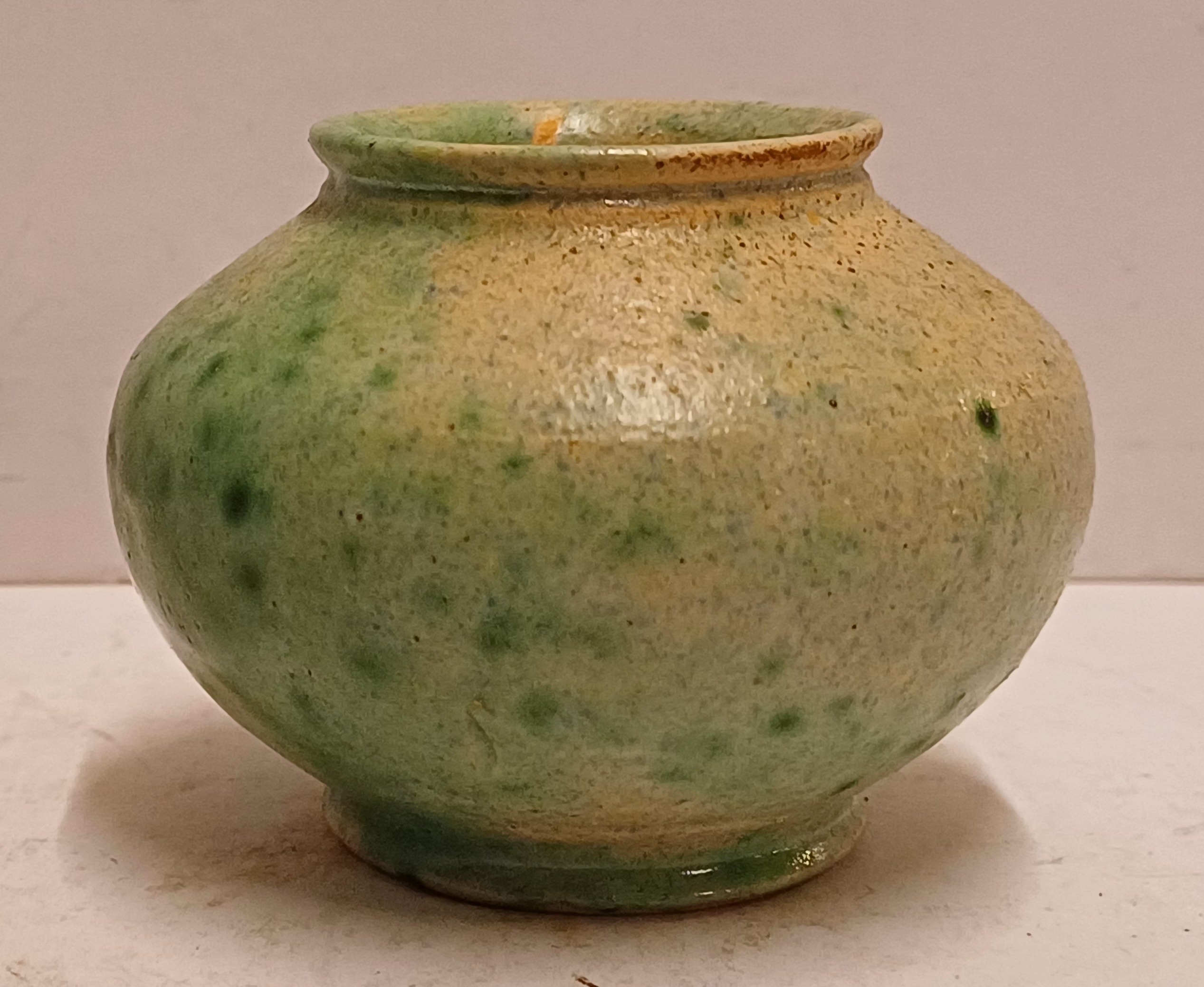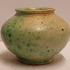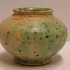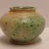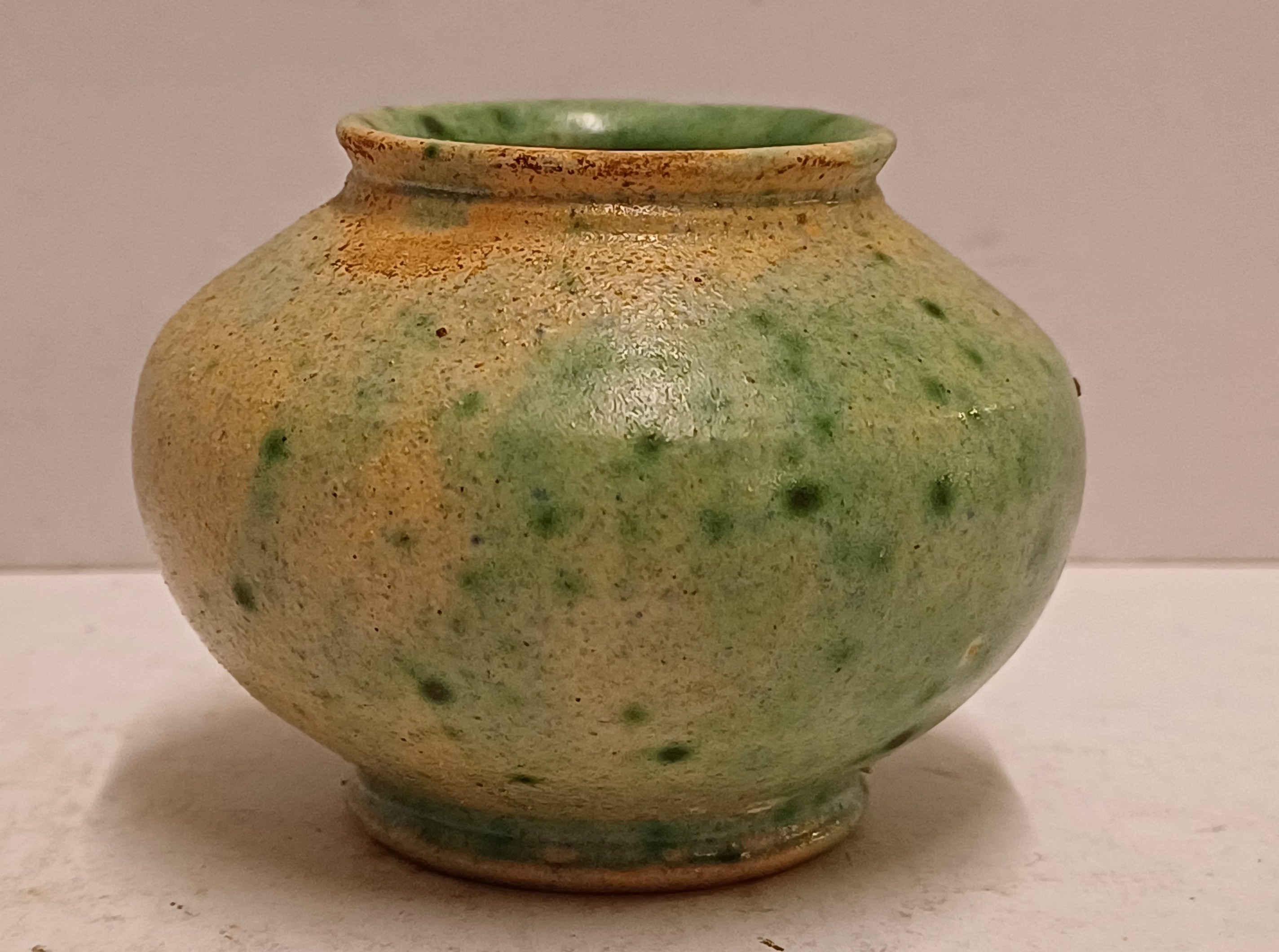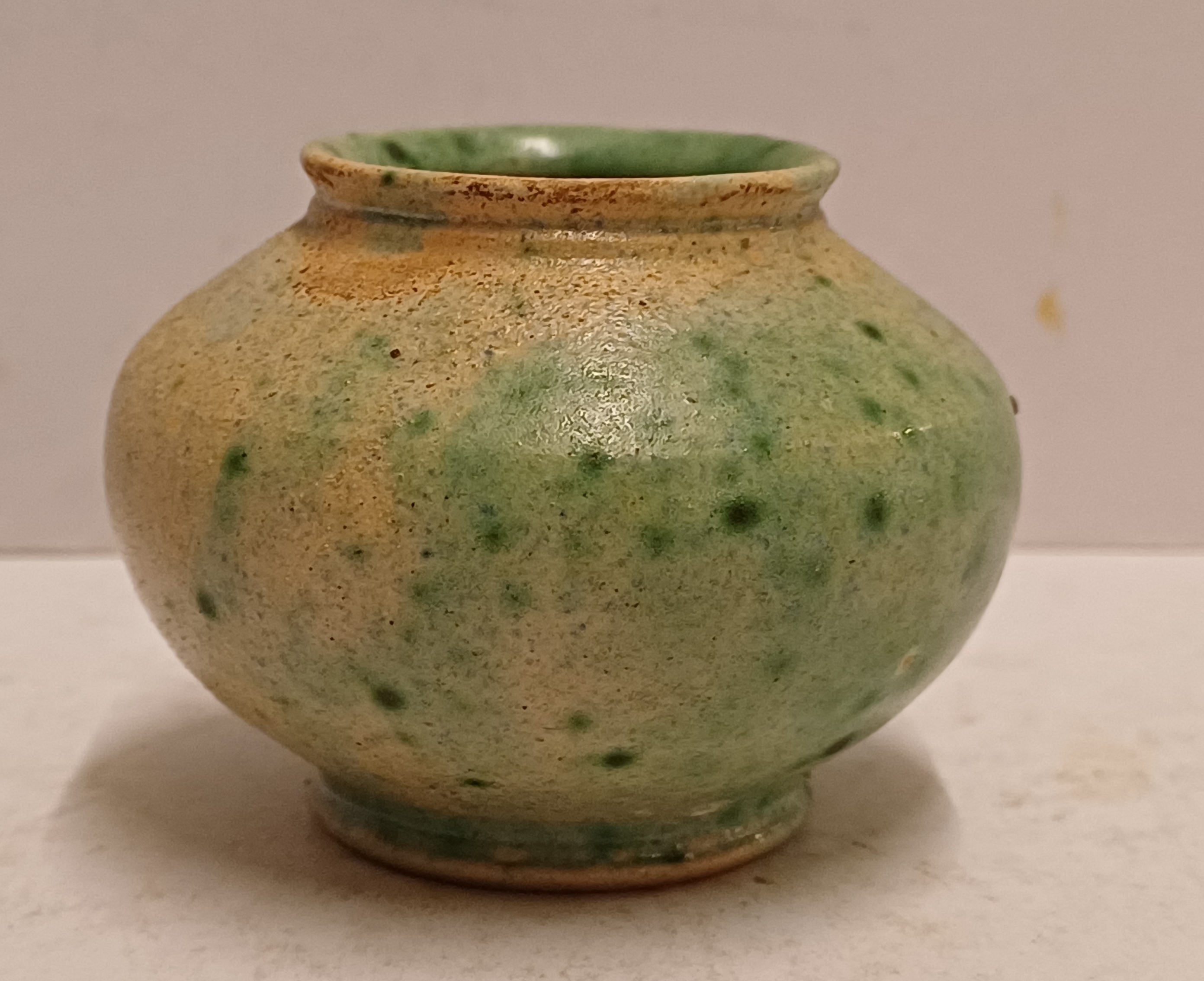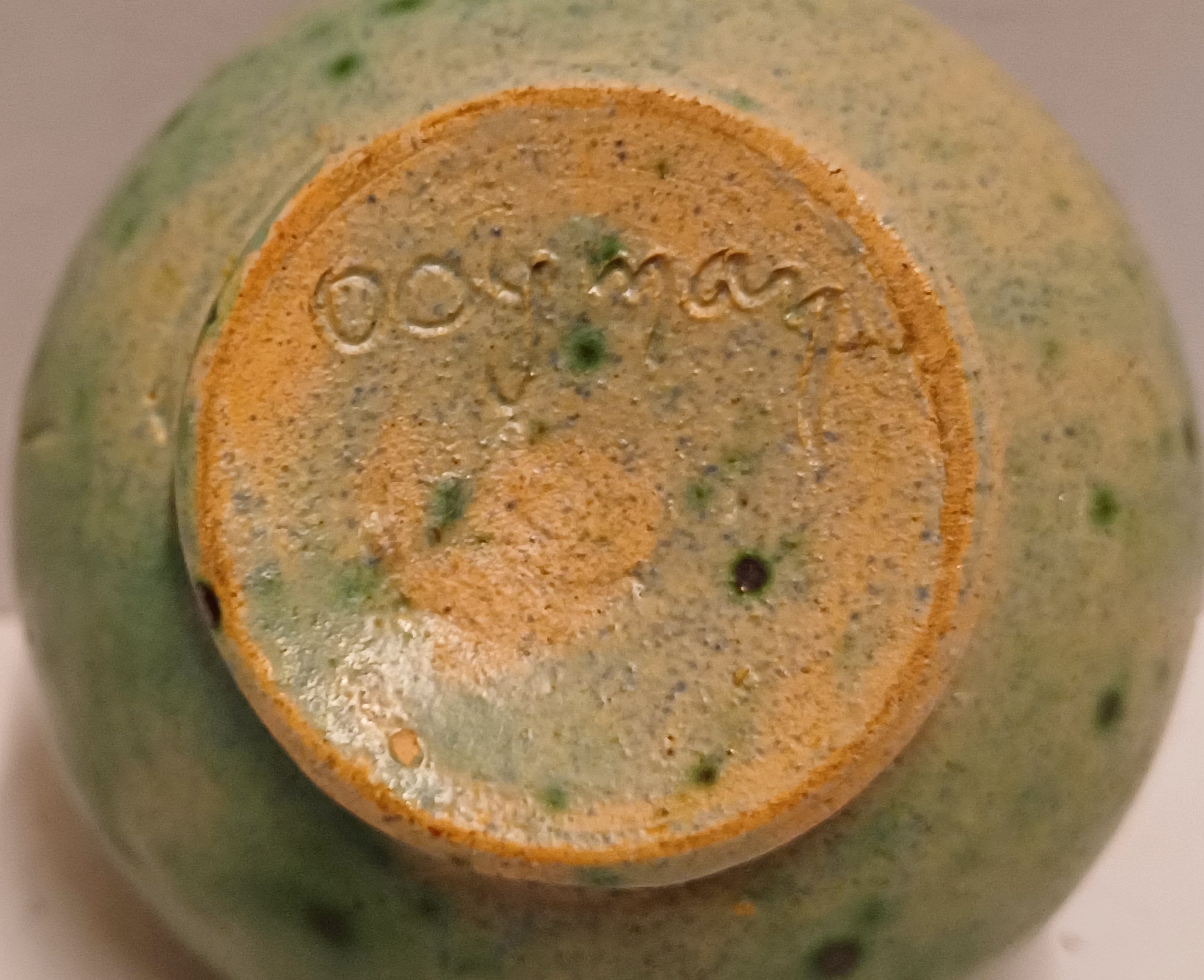 Earthenware vase with green speckled glaze on a cream background. Bottom signed Ooyman.
