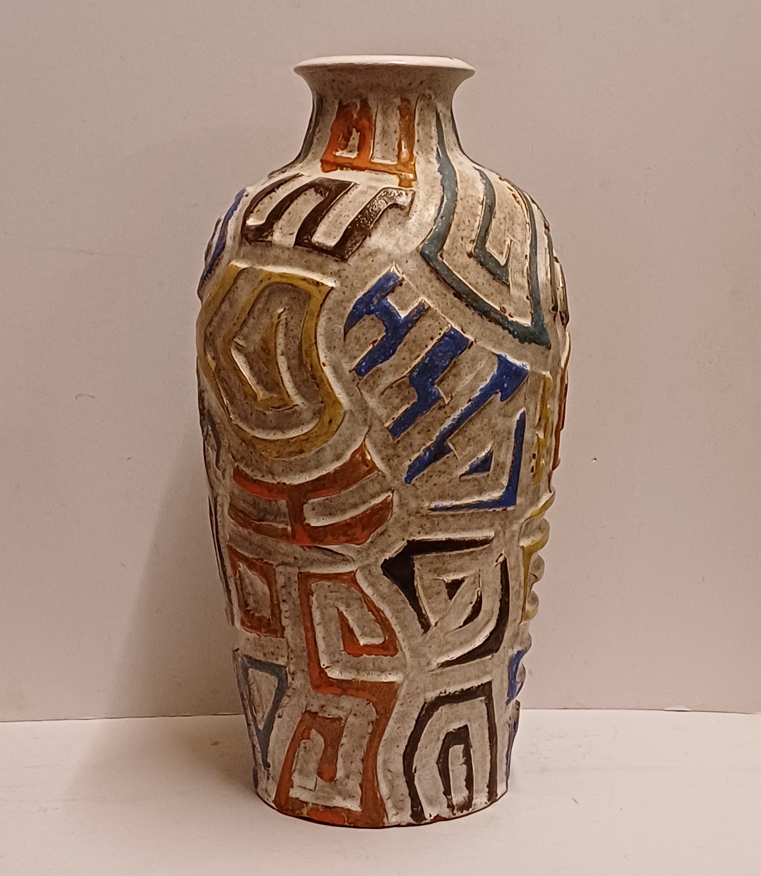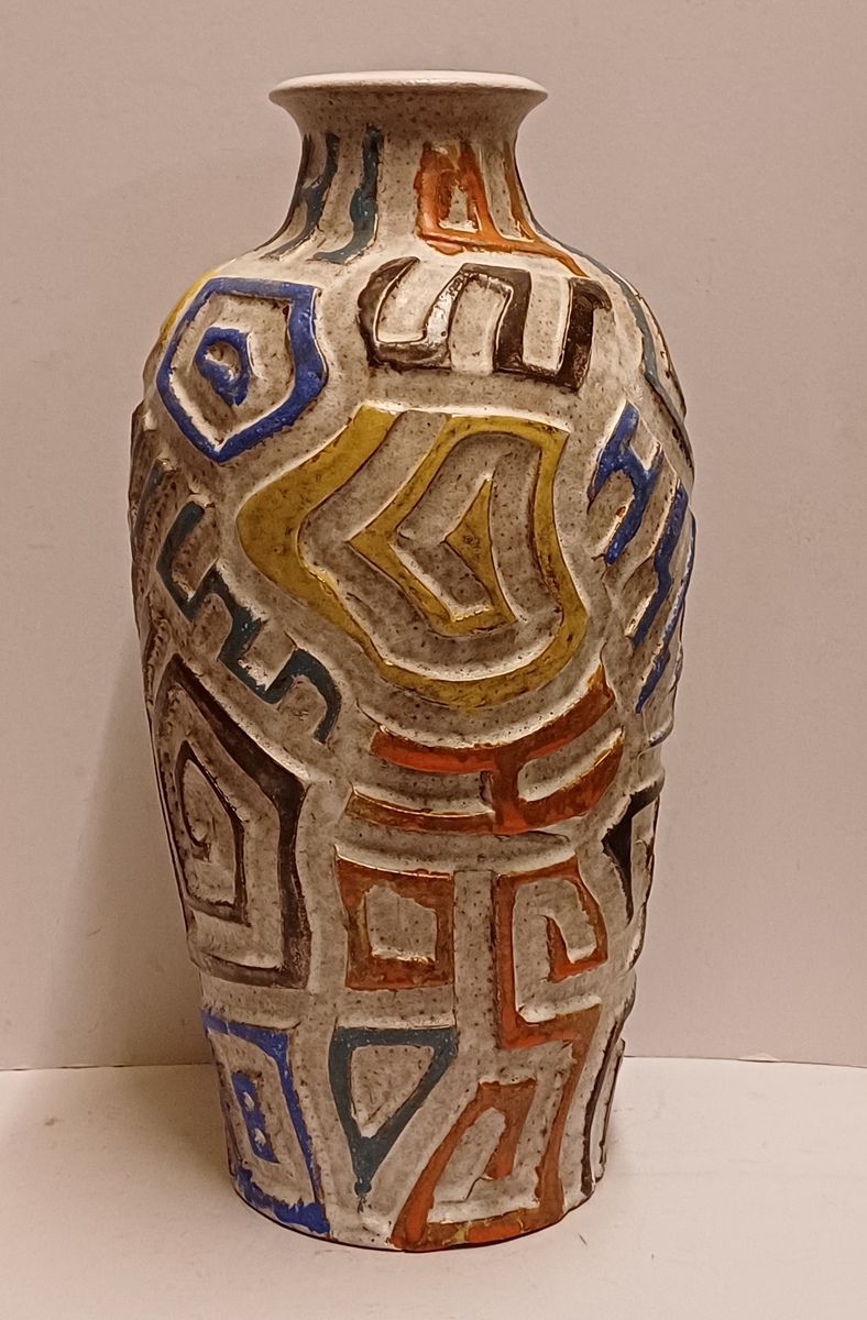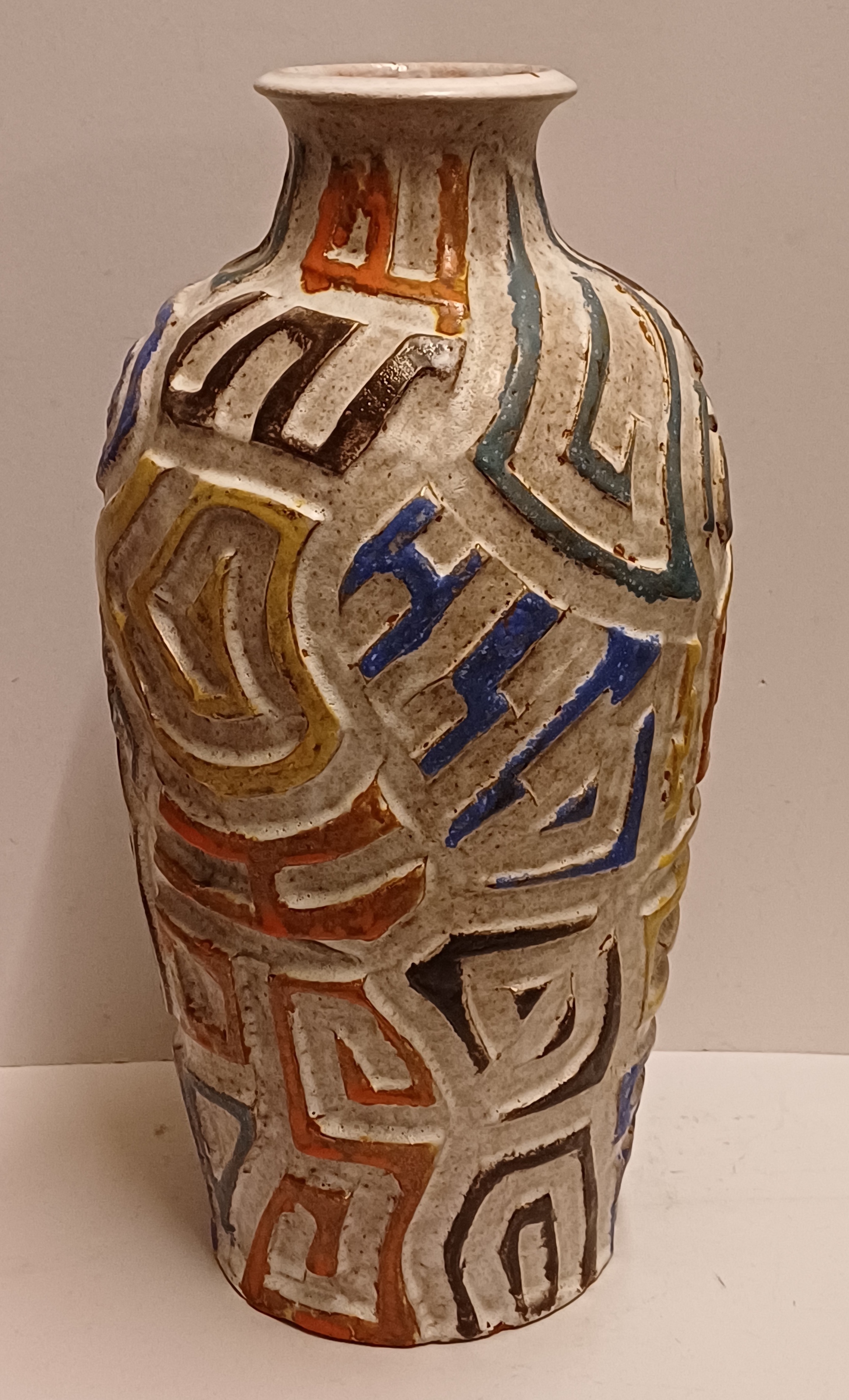 Aardewerken grote vaas met uitgesneden decor met meerkleurige glazuur. Zogenaamd Sequoia aardewerk. Onderzijde niet gesigneerd.