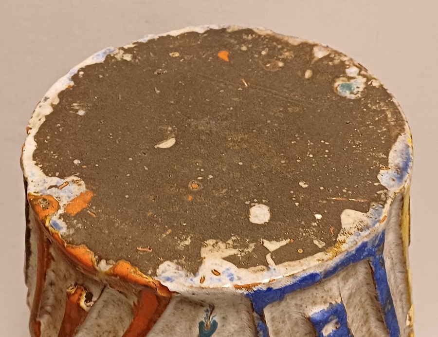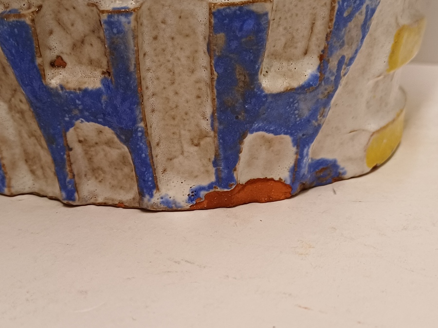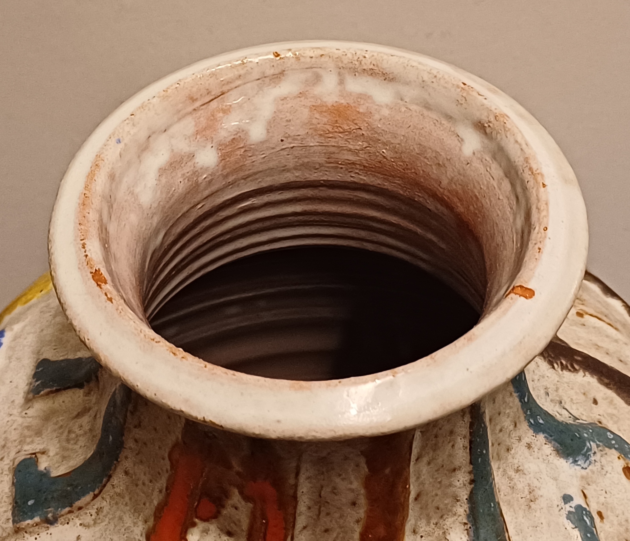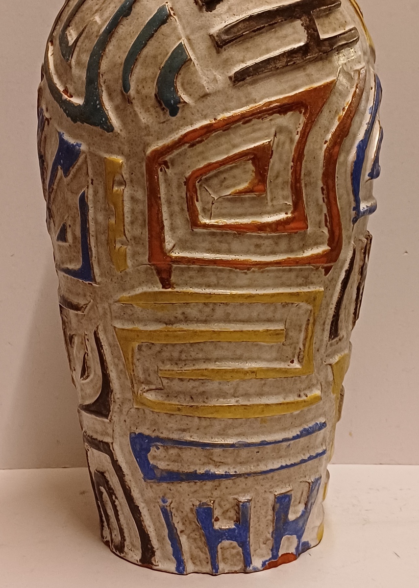 Aardewerken grote vaas met uitgesneden decor met meerkleurige glazuur. Zogenaamd Sequoia aardewerk. Onderzijde niet gesigneerd.