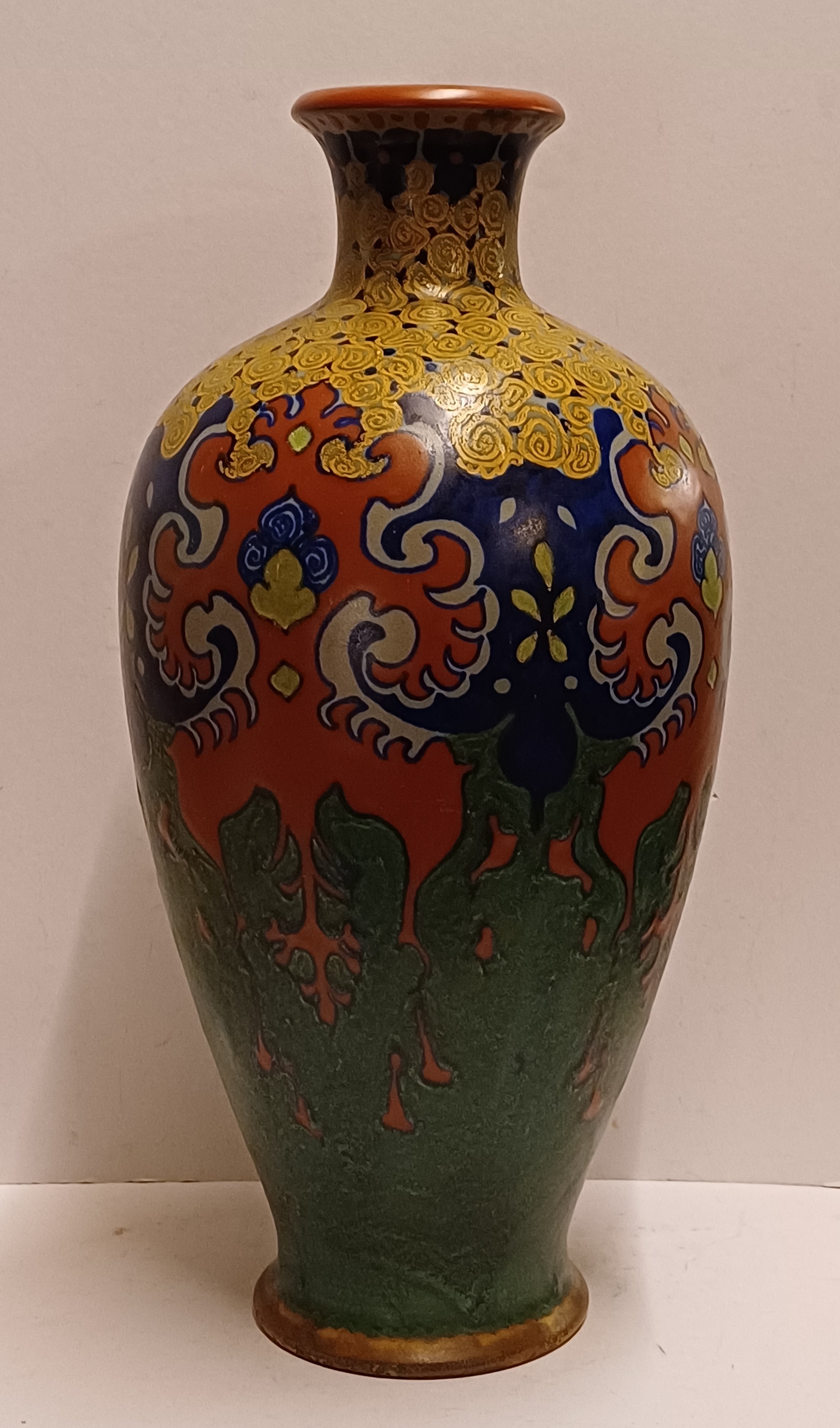 Grote vloervaas met gestileerd decor westland op groen fond. Onderzijde met fabrieksmerk en jaarletter 1918.