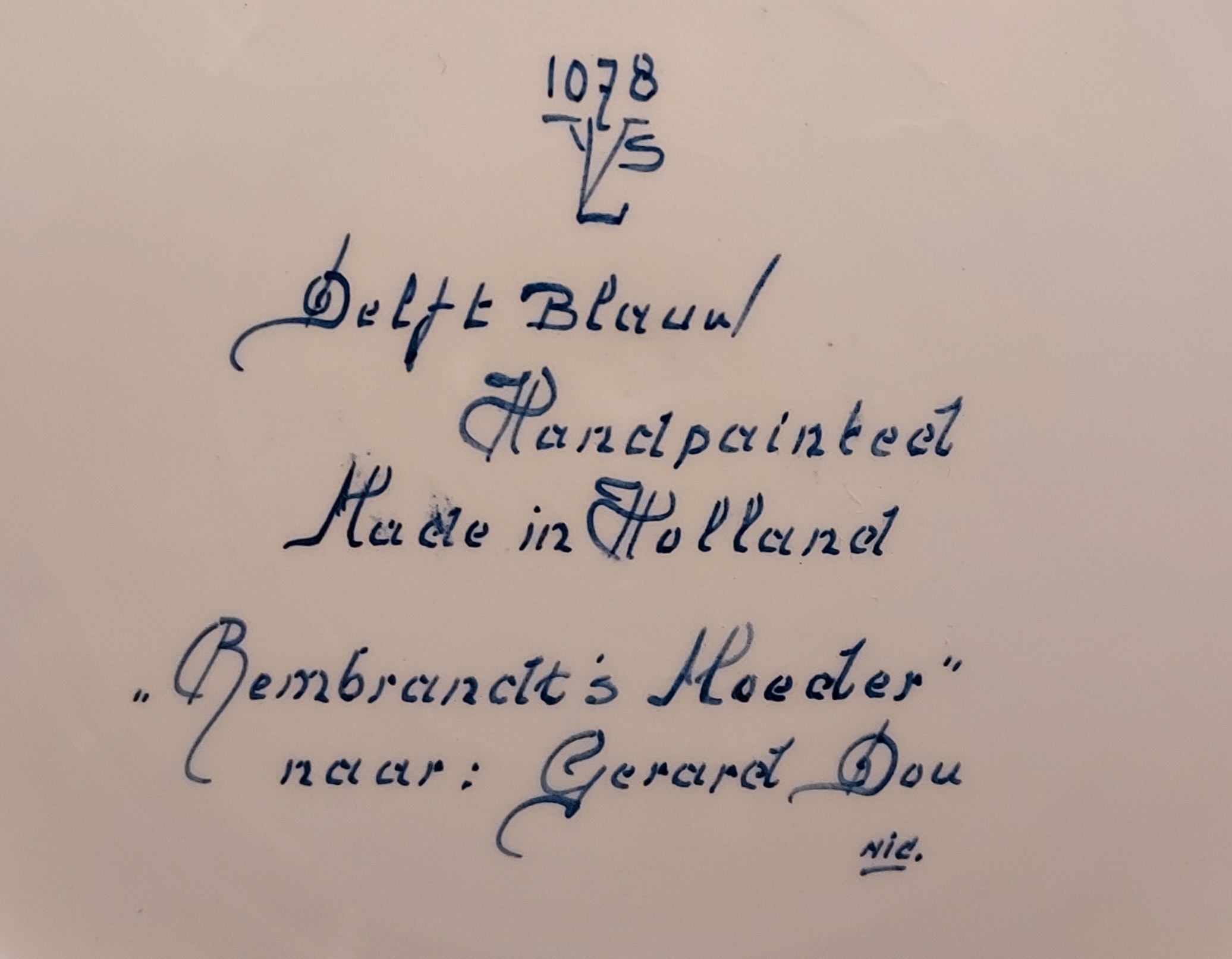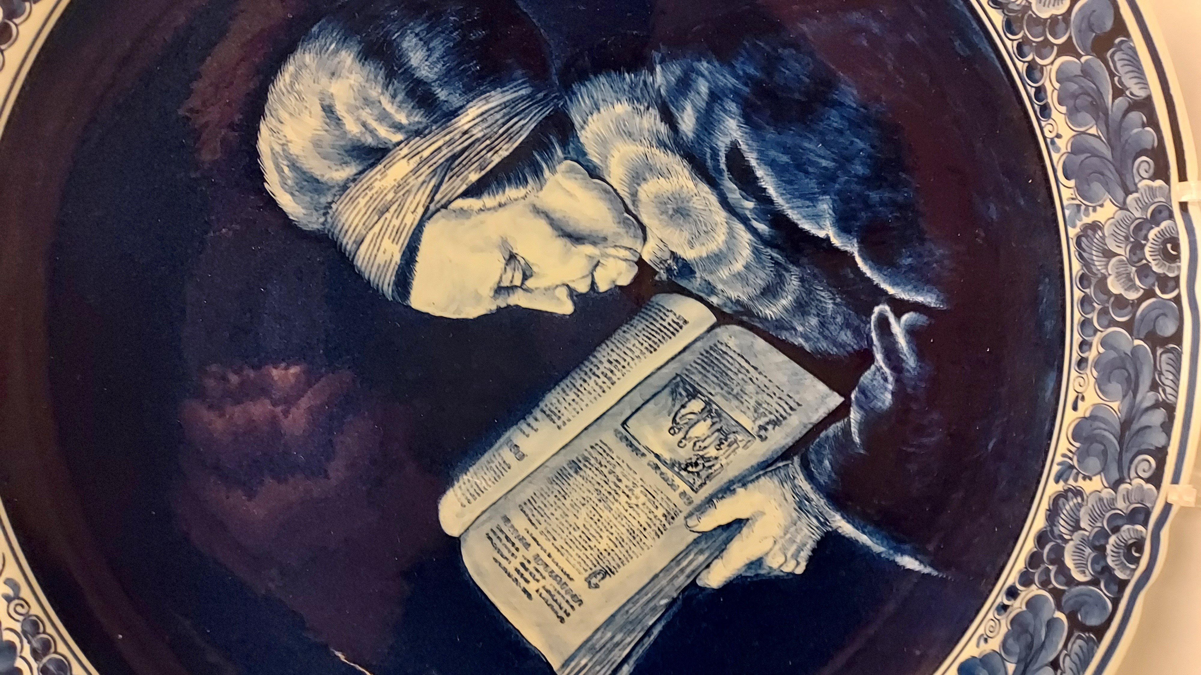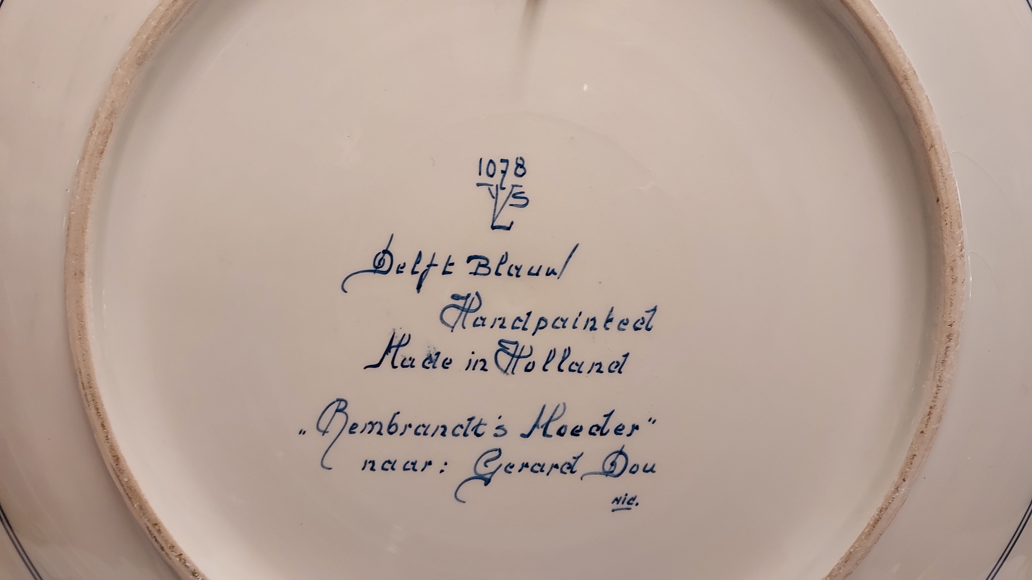 Delft blue wall plate with a hand-painted depiction of Rembrandt's mother, after a painting by Gerard Dou. Backside bears a mark from an unknown Delft factory YLS?