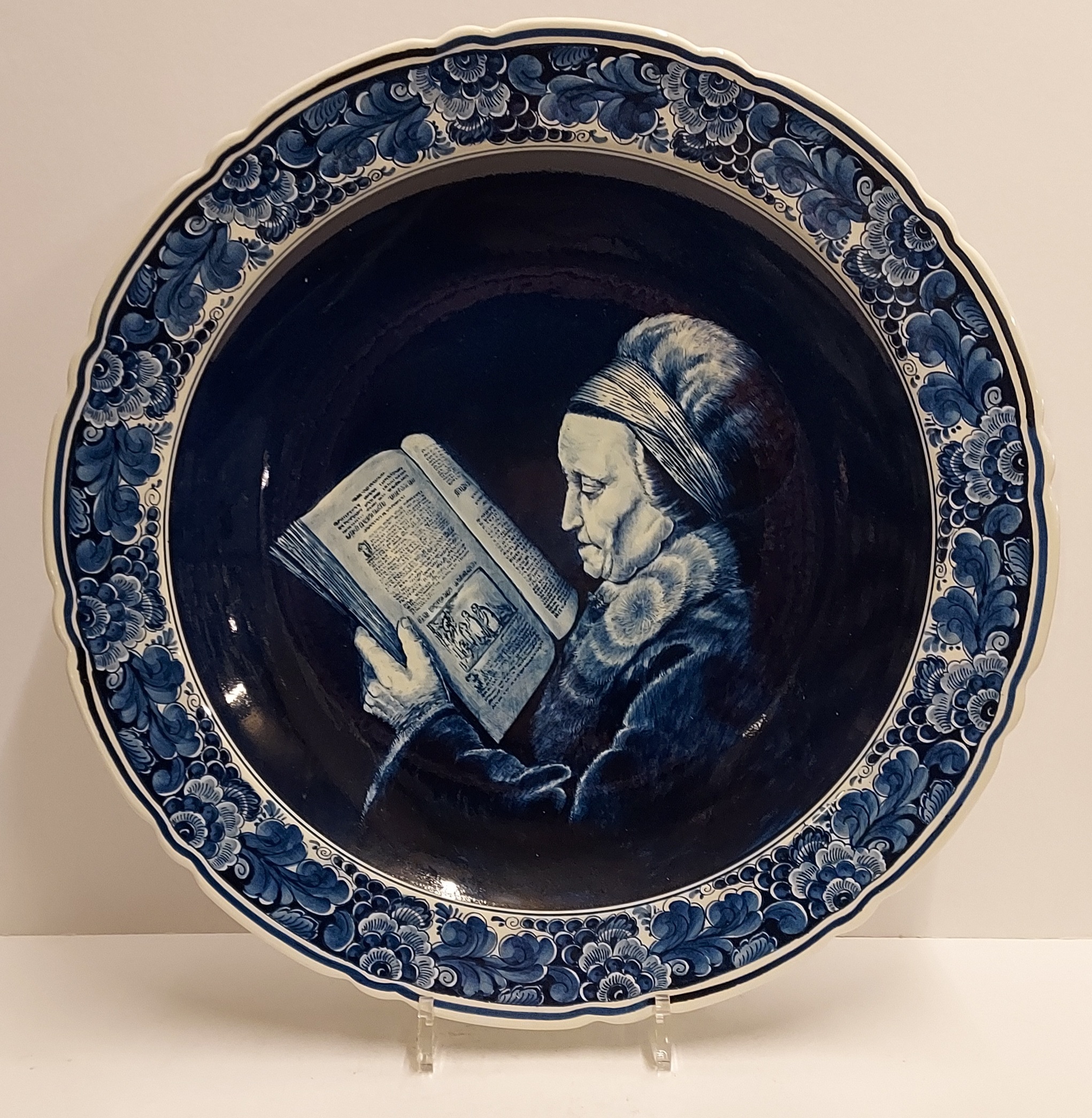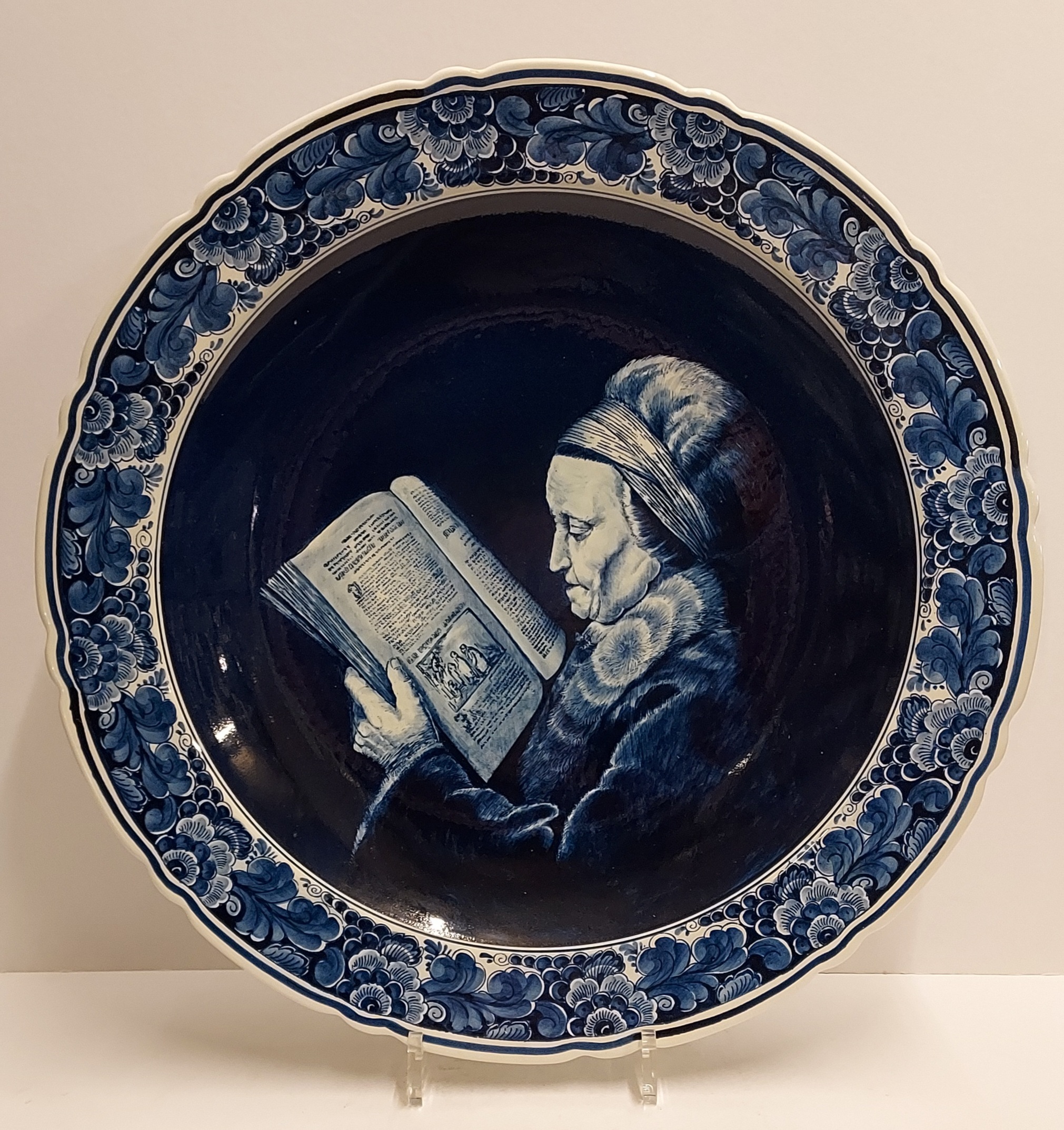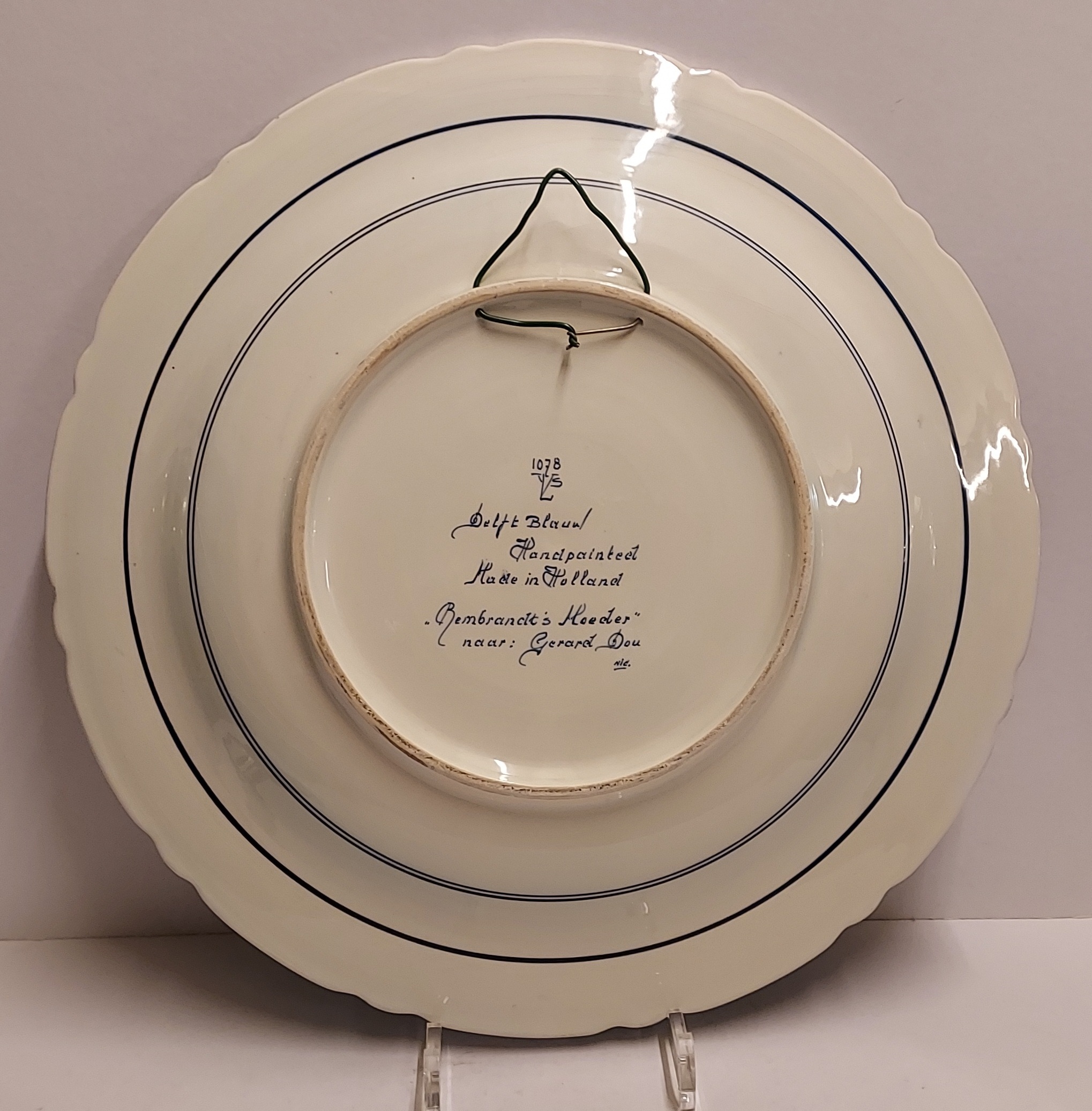 Delft blue wall plate with a hand-painted depiction of Rembrandt's mother, after a painting by Gerard Dou. Backside bears a mark from an unknown Delft factory YLS?