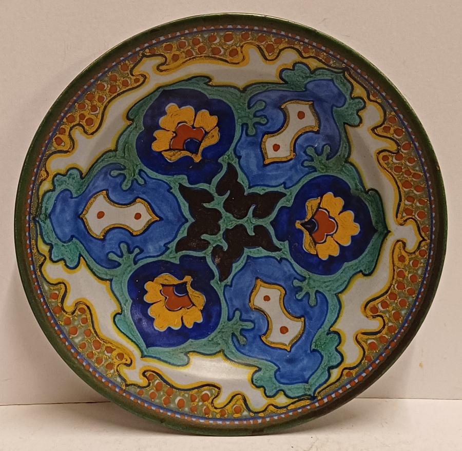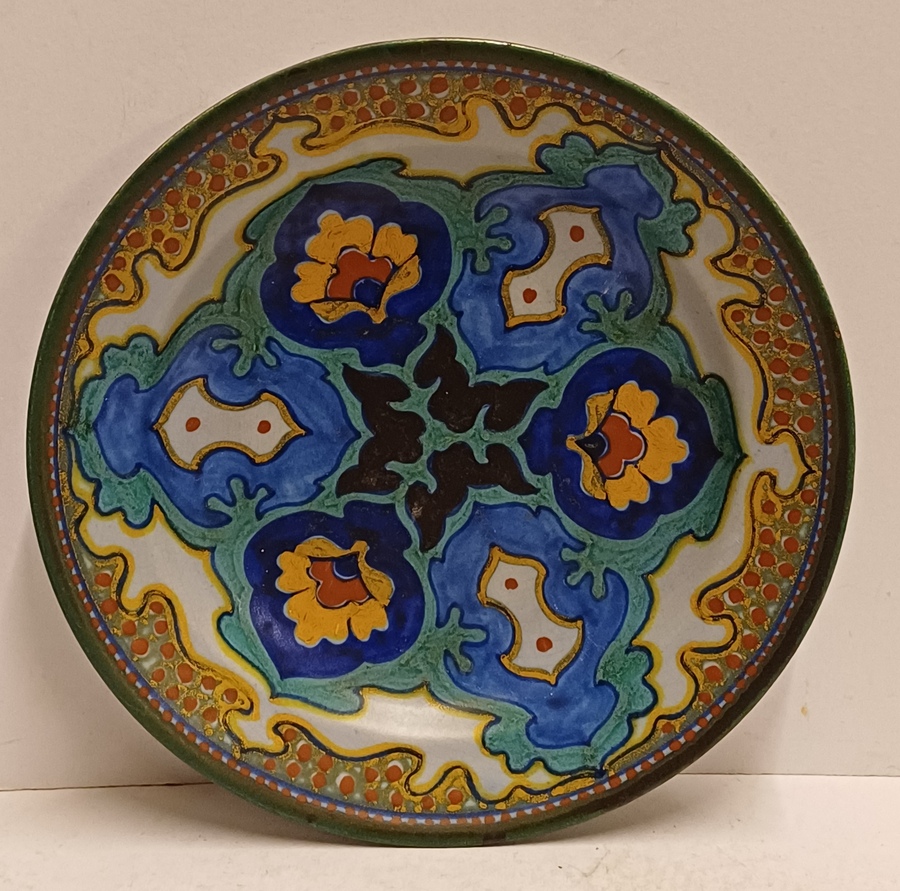 Faience wall plate with stylized Rhodian decor. Reverse side with signature and year letter.