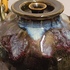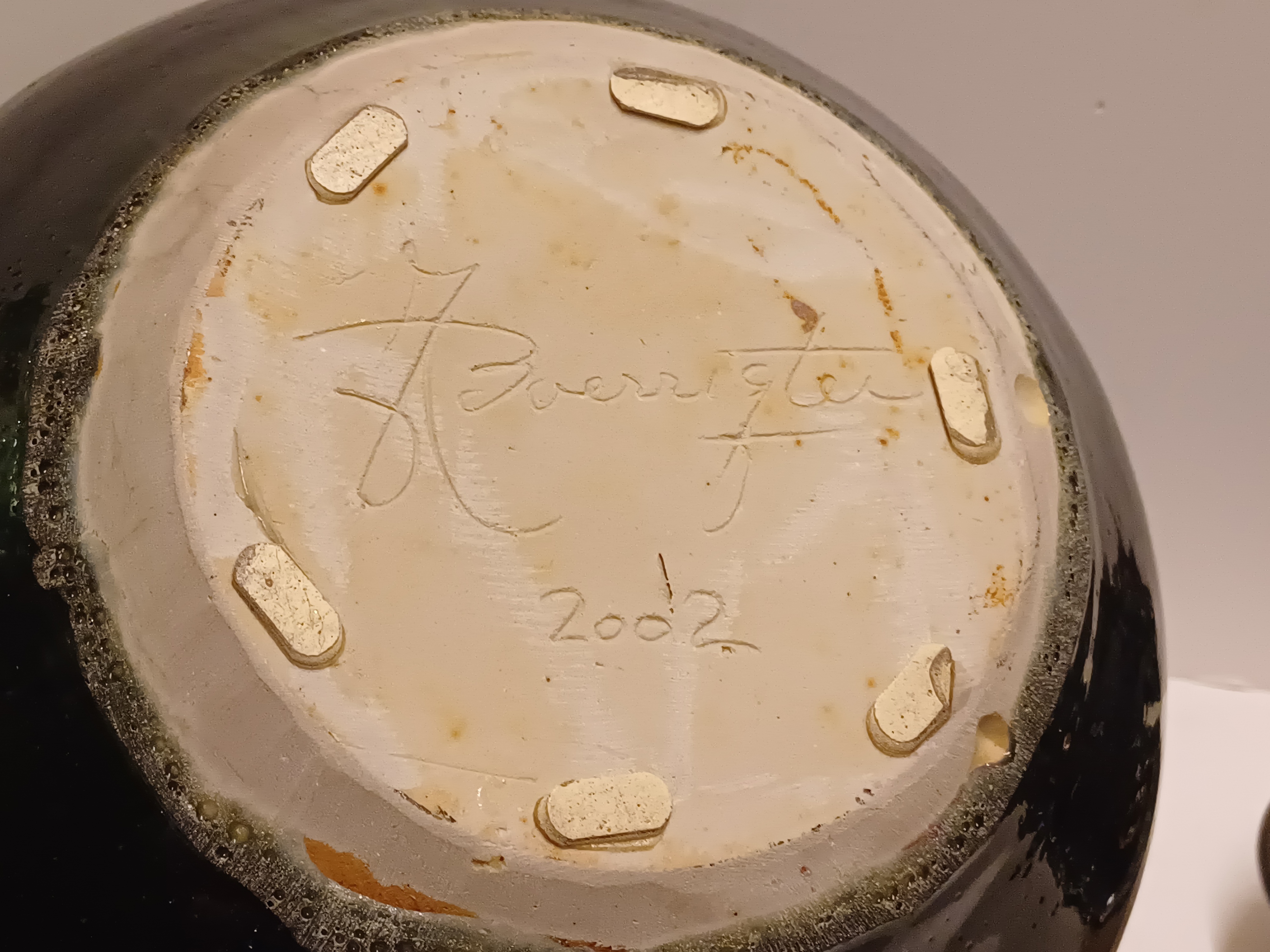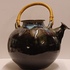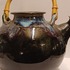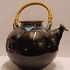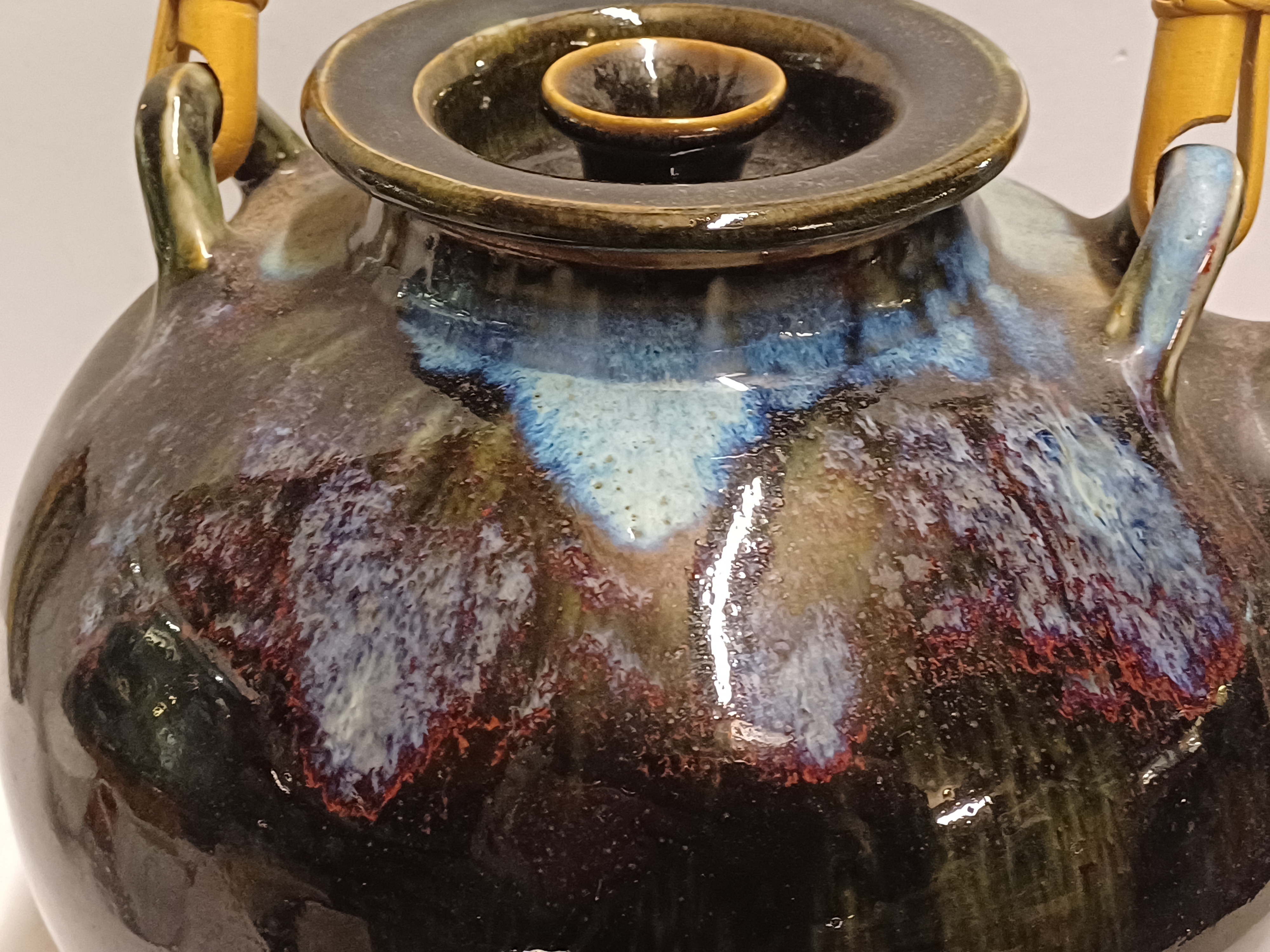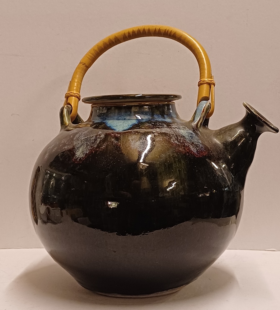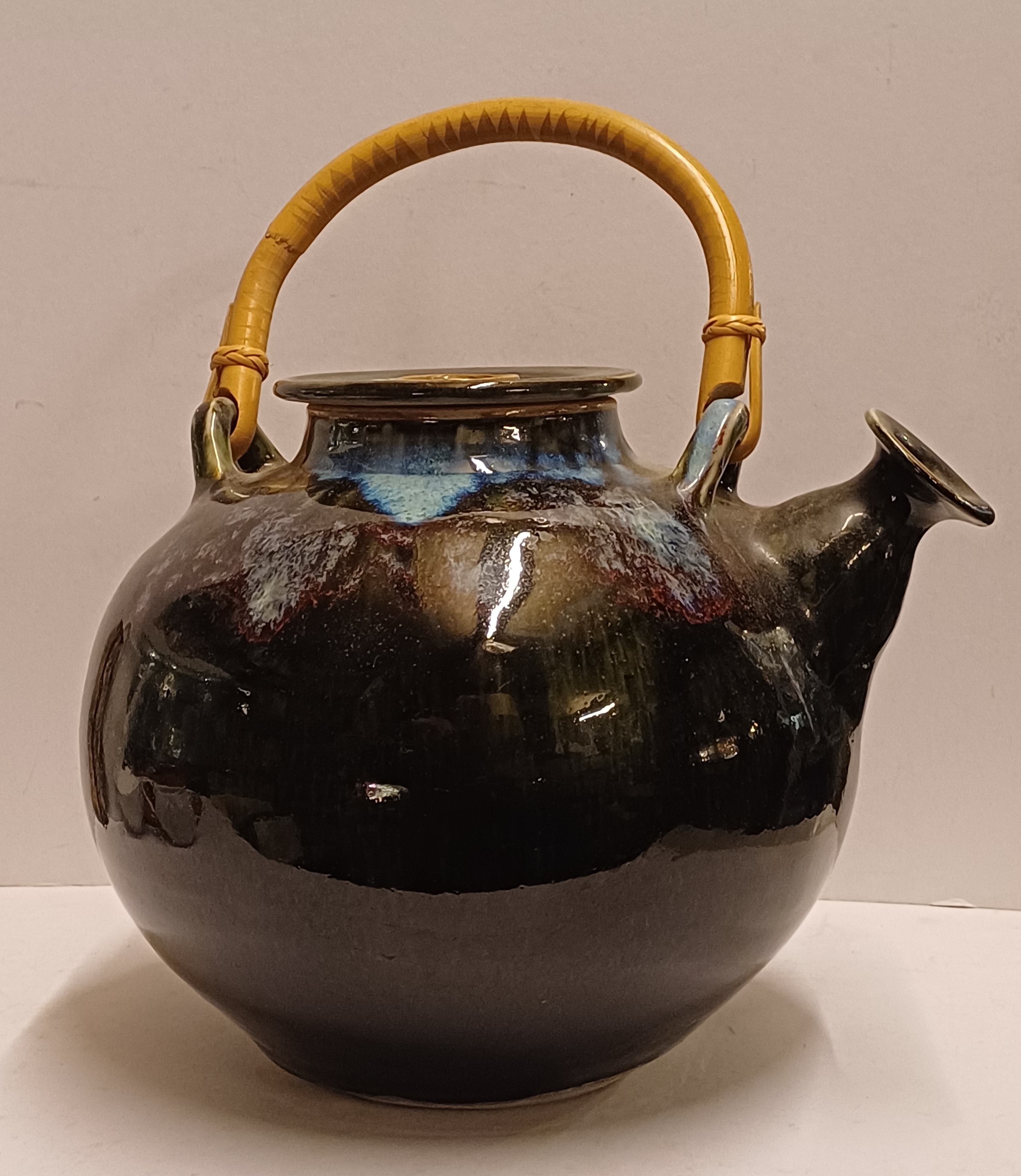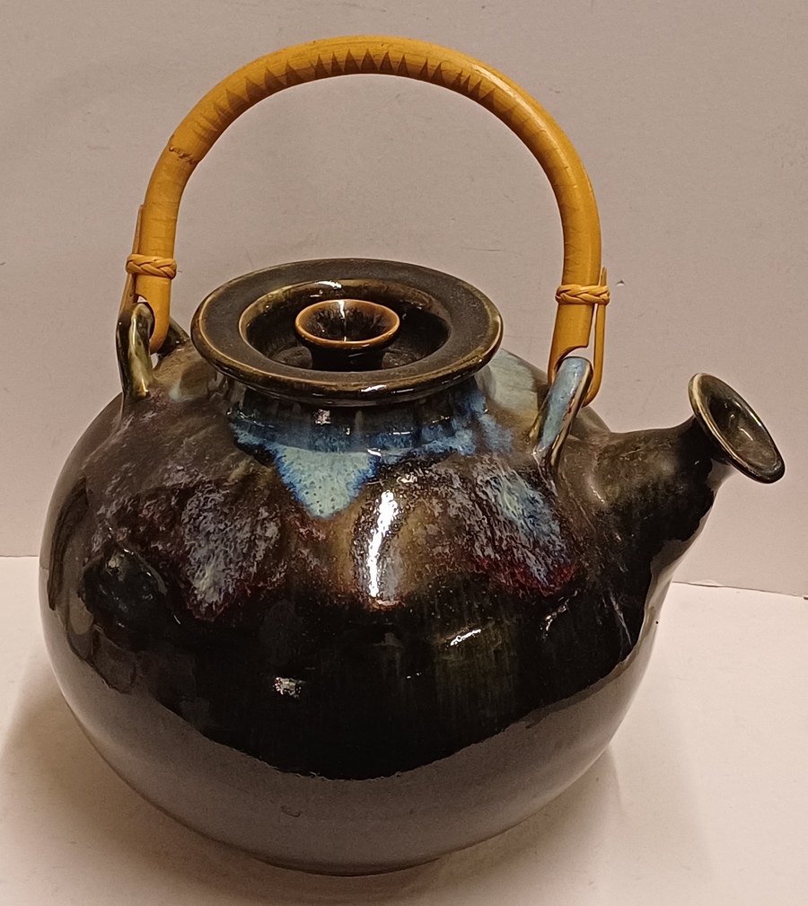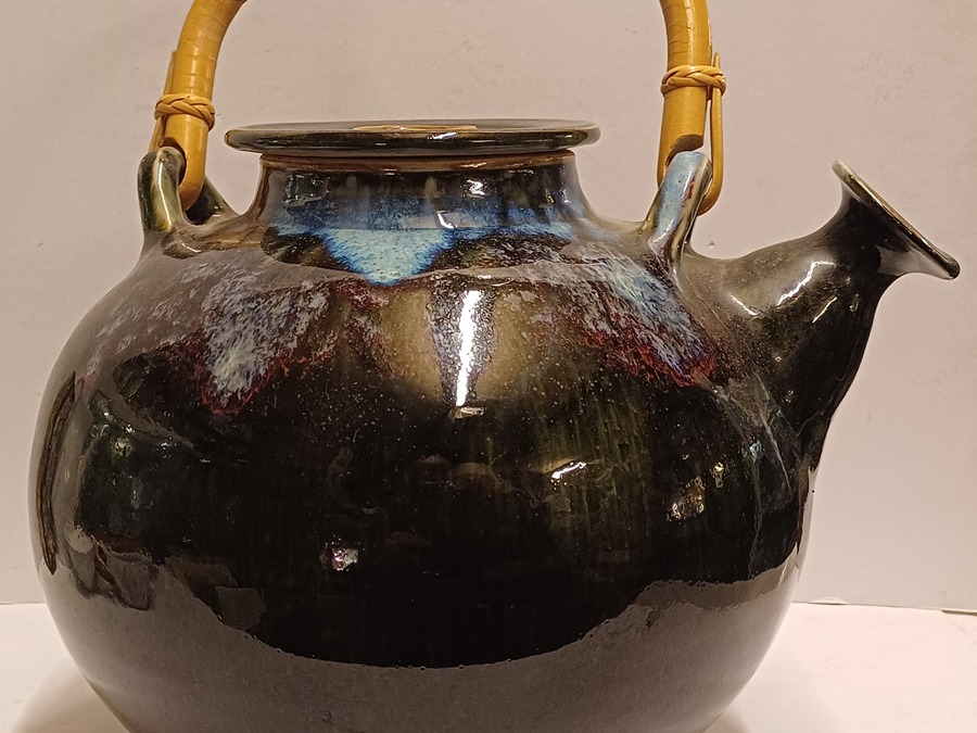 Groot formaat ketel met stroomglazuur op donker fond, aan bamboe heft. Onderzijde gesigneerd en gedateerd 2002.