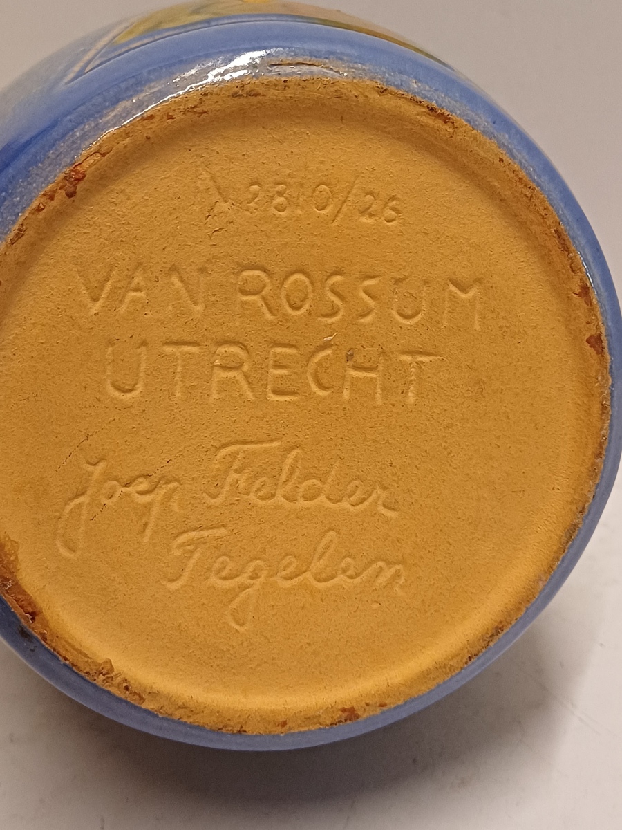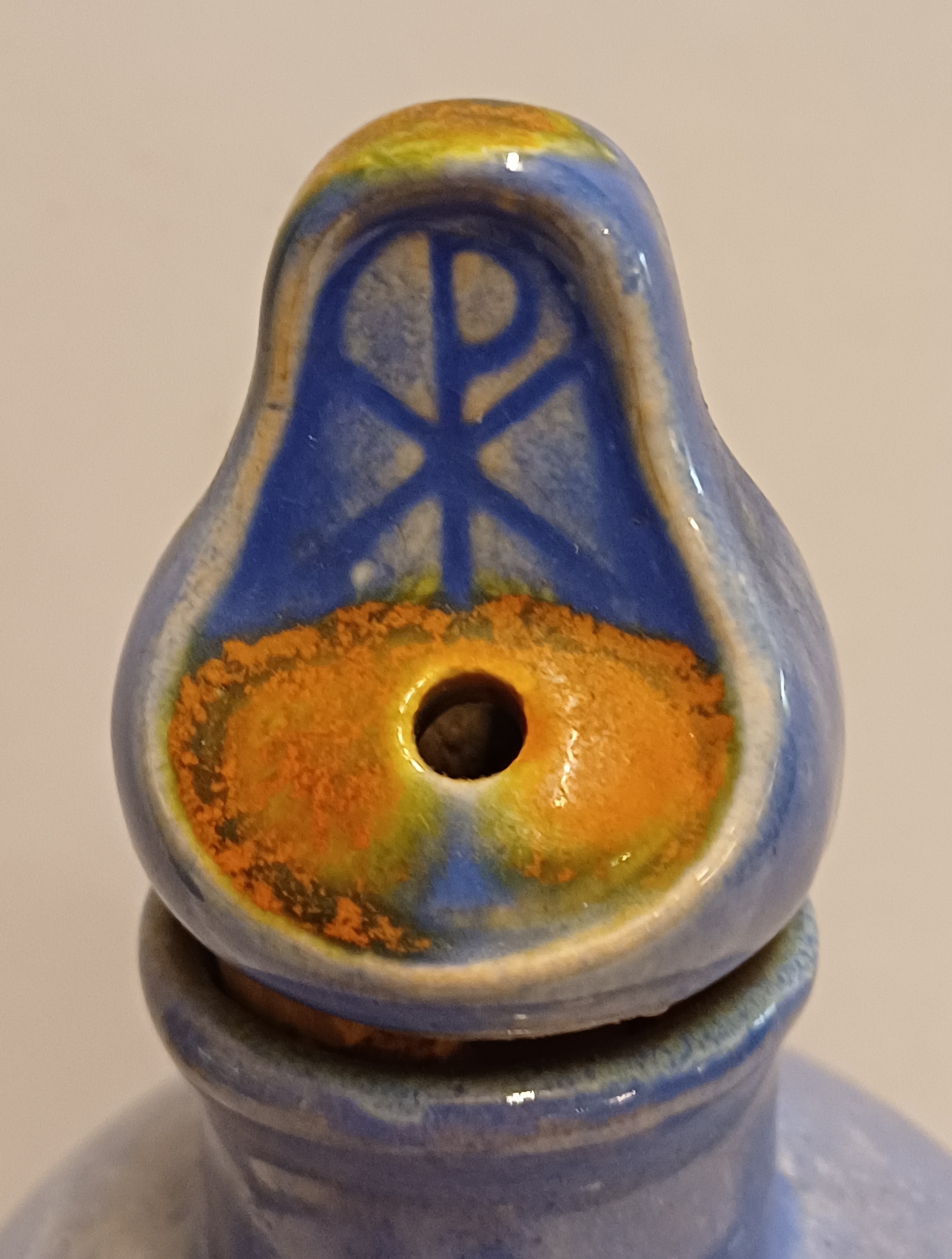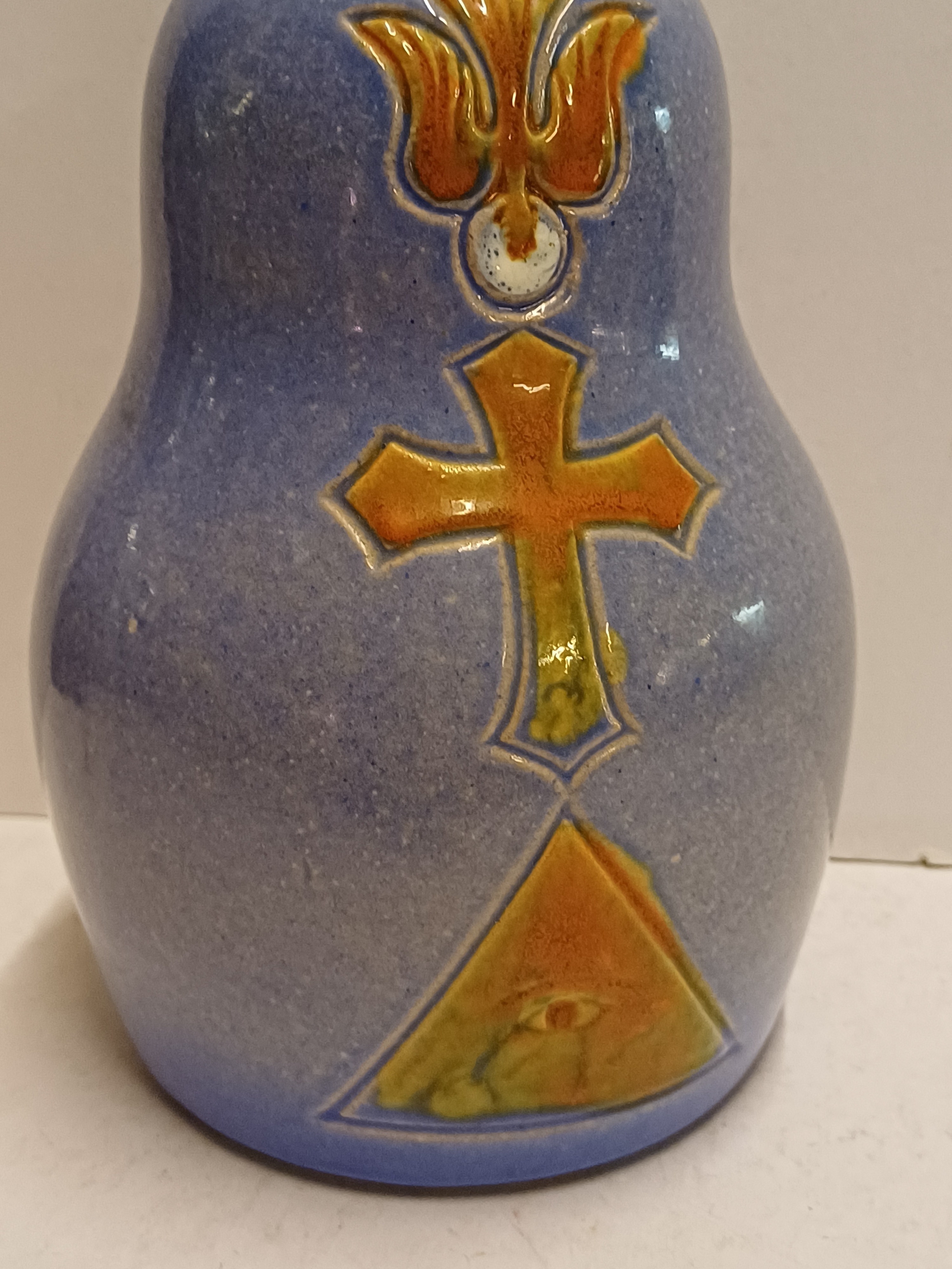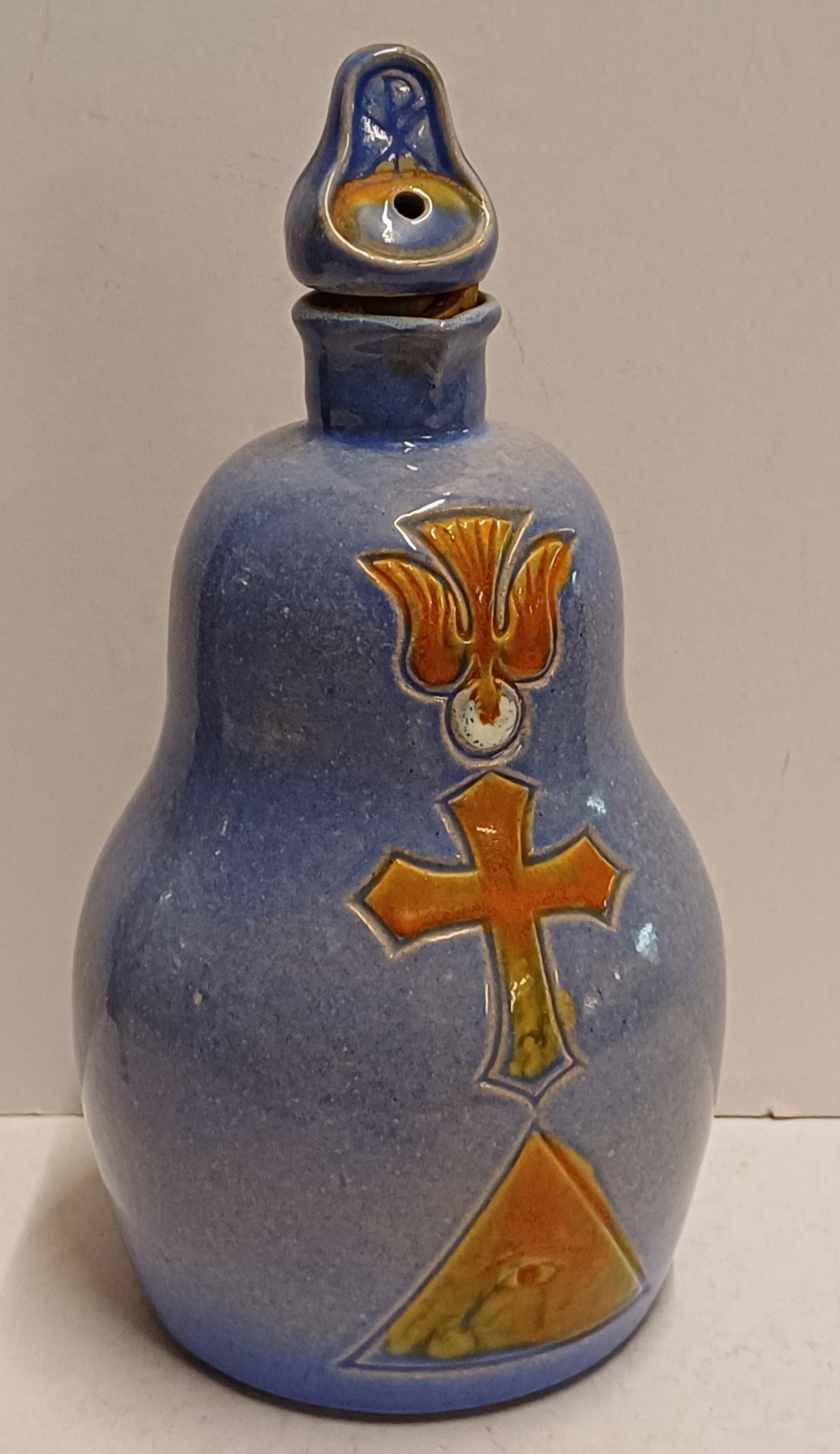 Earthenware purple-glazed jug with stopper, featuring a cross with a dove on the body and PX on the stopper. Marked on the bottom, executed by Rossum Utrecht, design by Joep Felder.