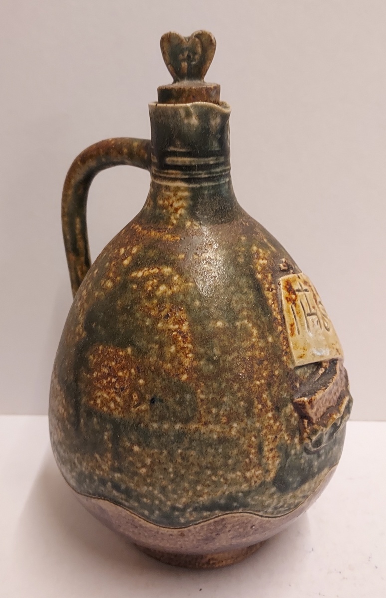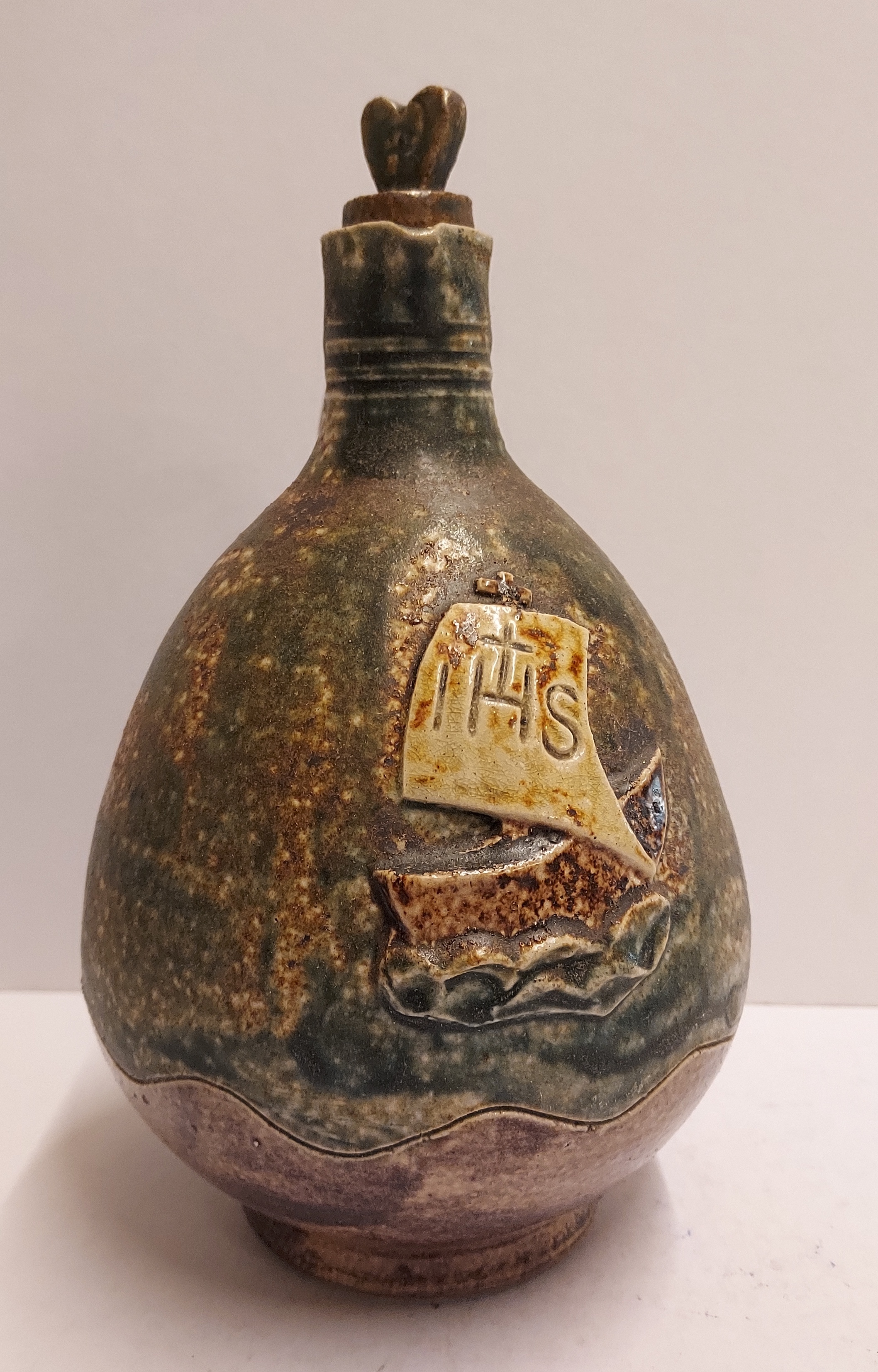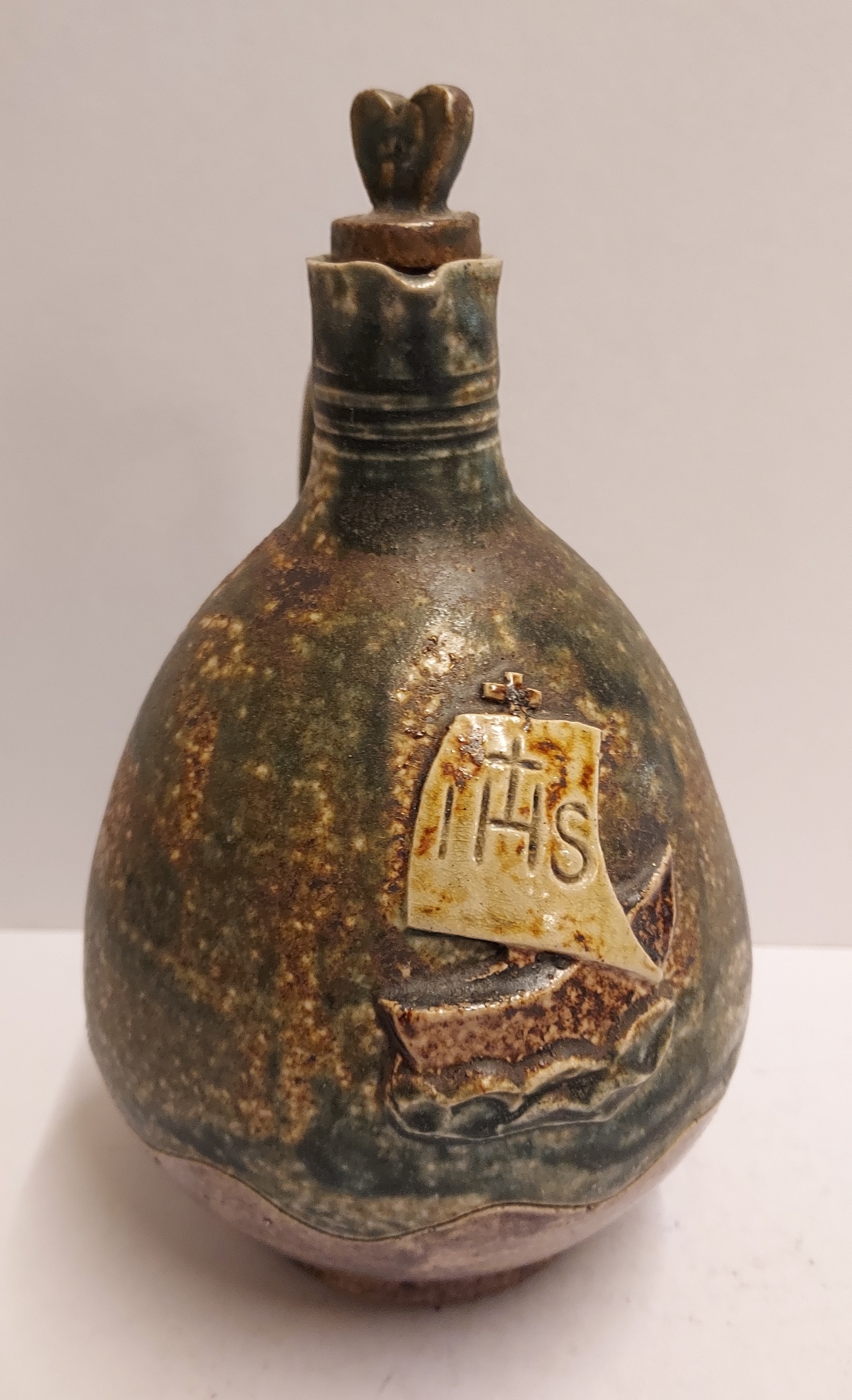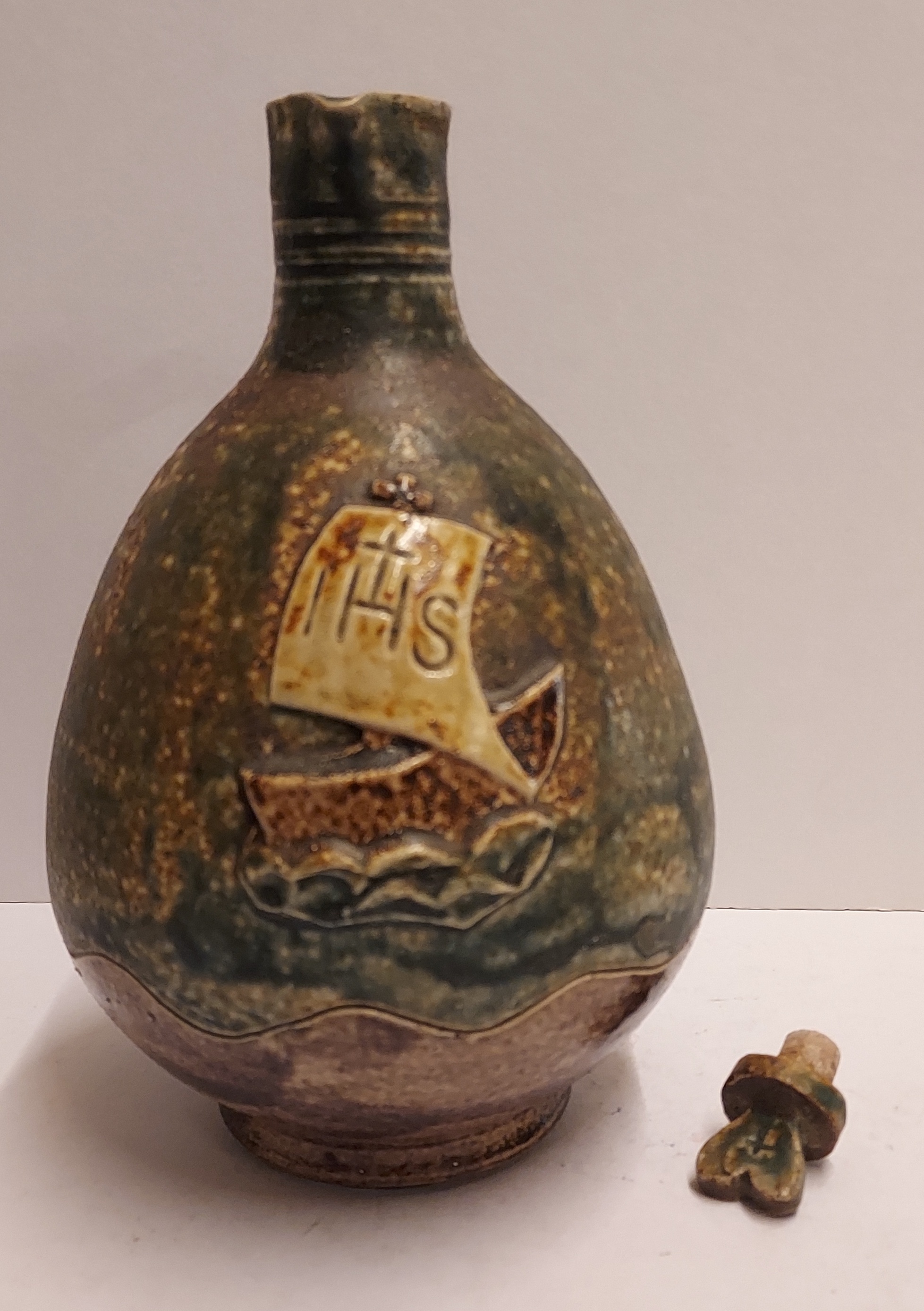 Stoneware glazed holy water jug with stopper. Representation of a ship with the abbreviation IHS in the mast. Bottom with factory mark.