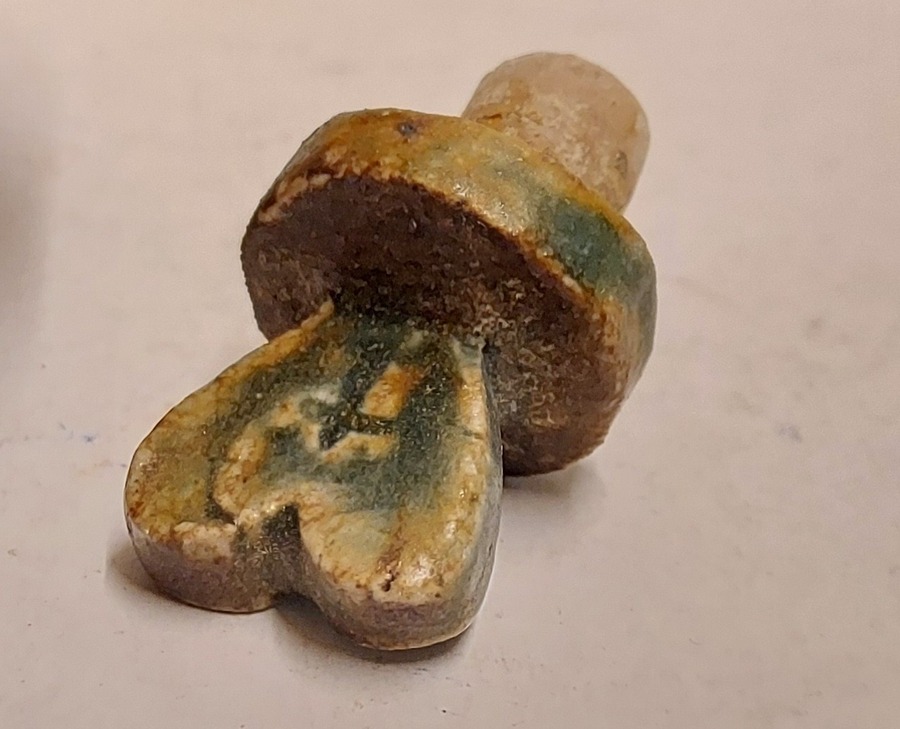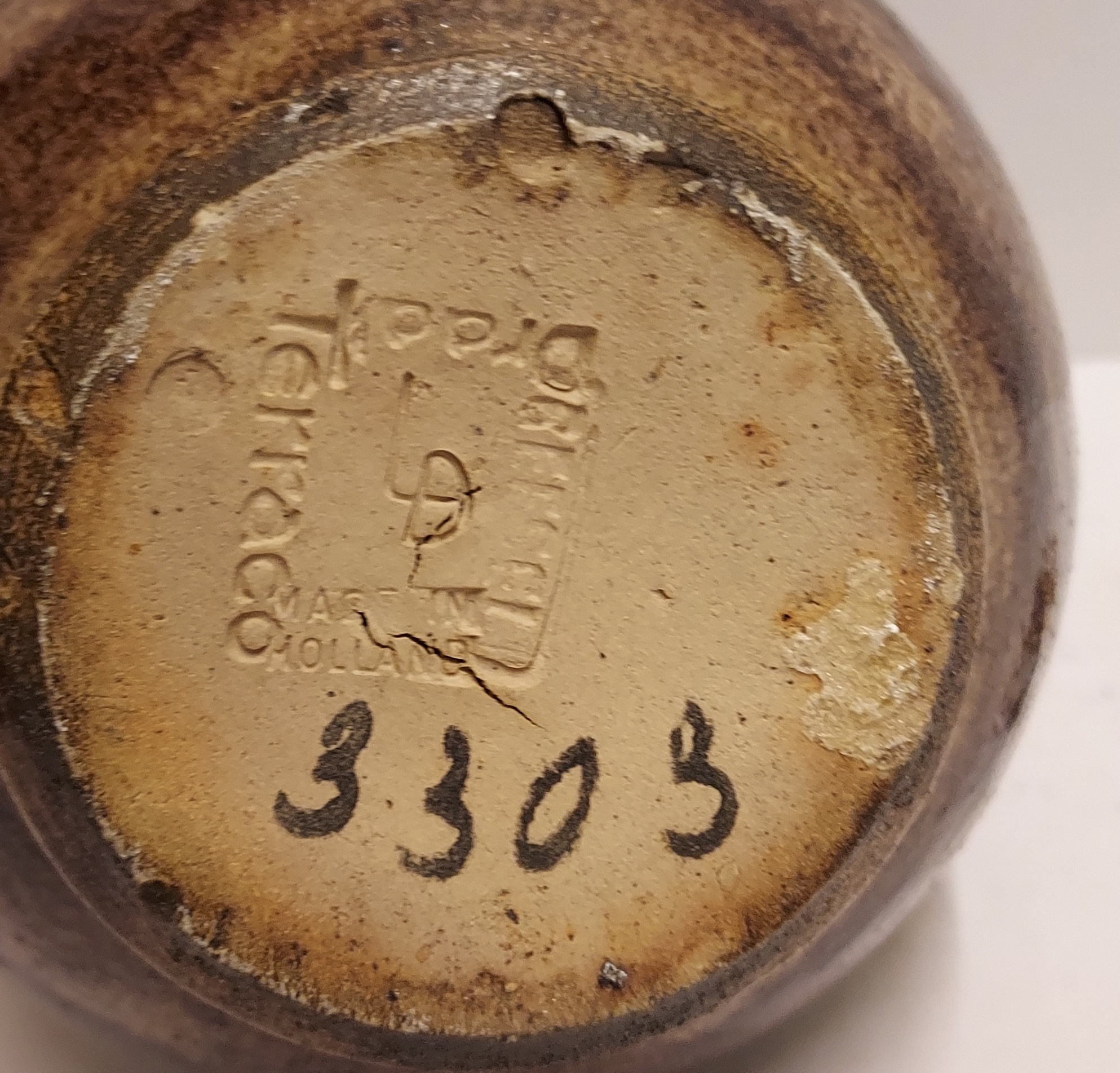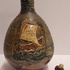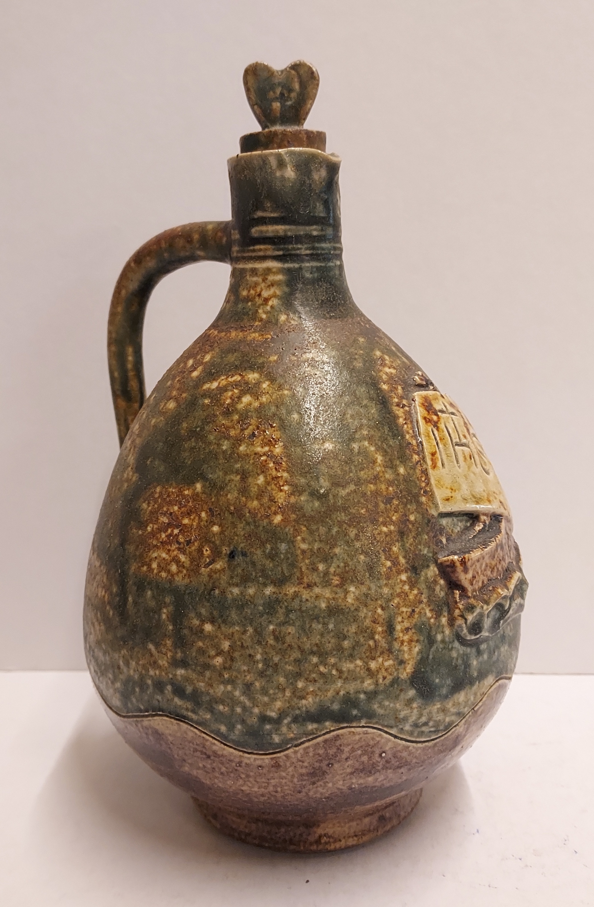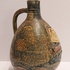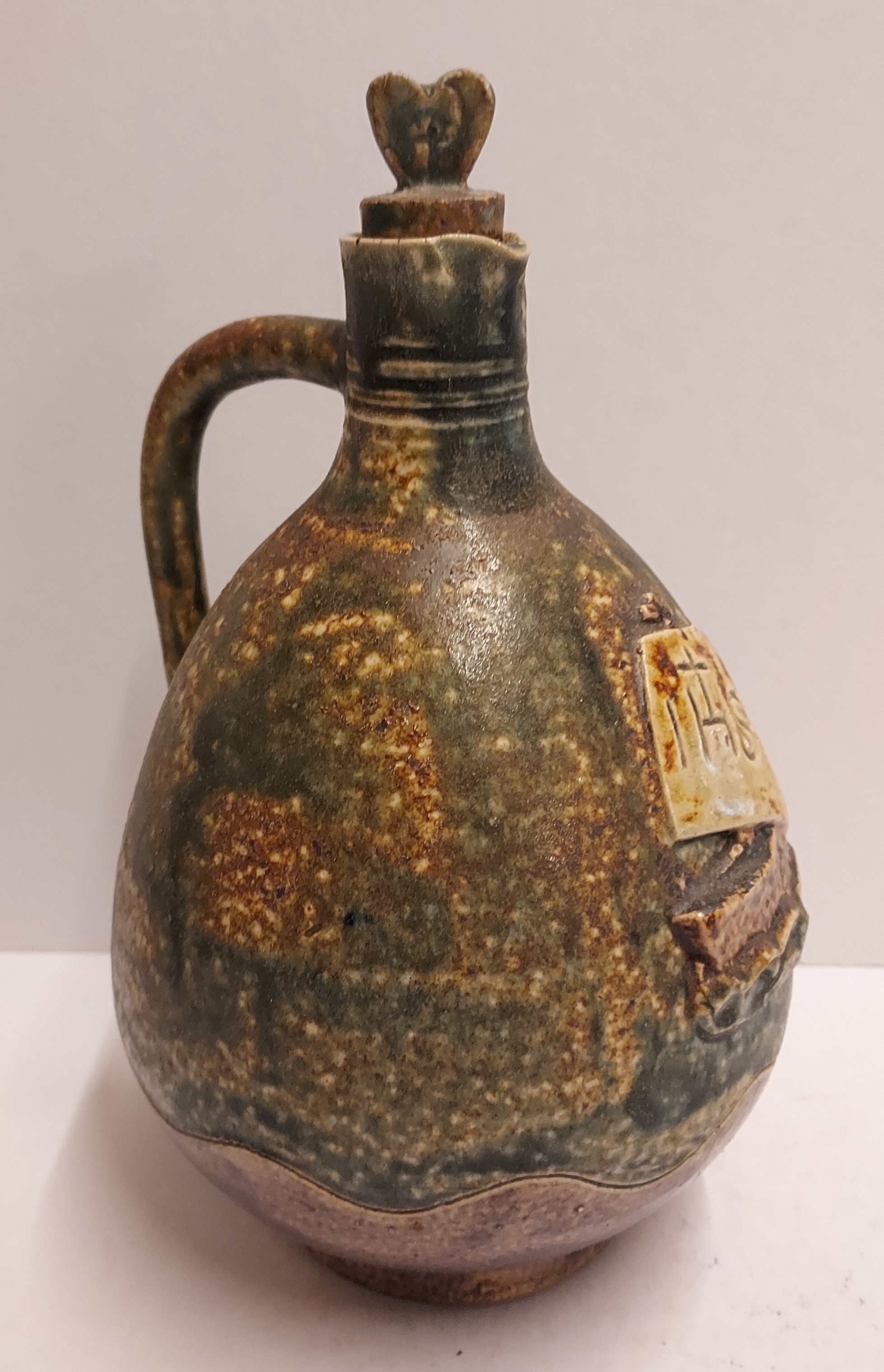Stoneware glazed holy water jug with stopper. Representation of a ship with the abbreviation IHS in the mast. Bottom with factory mark.