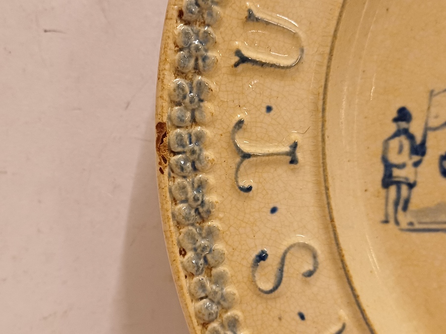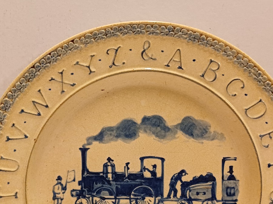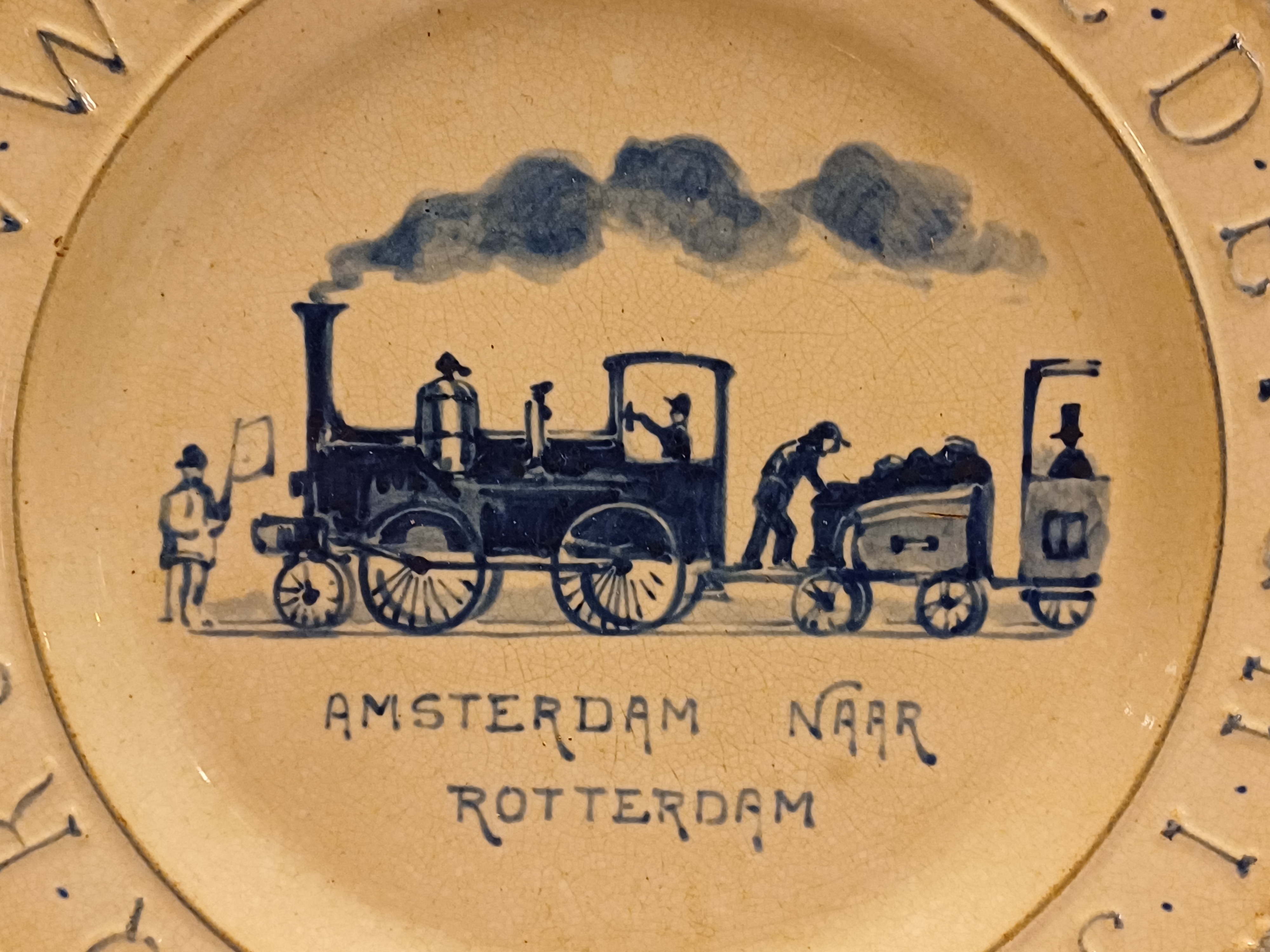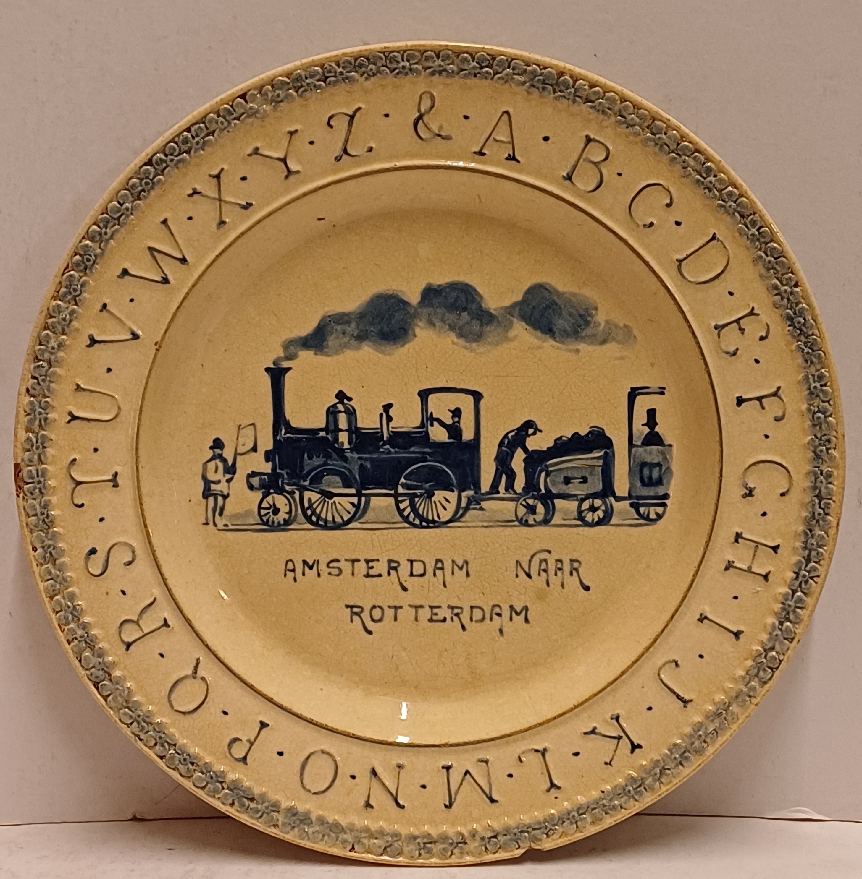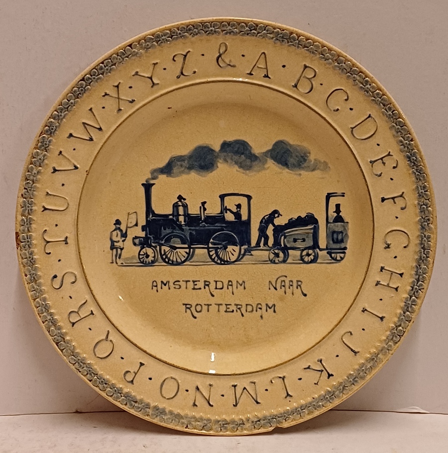 Aardewerken bord met relief decor op de lip van het alfabet, op het plat geschilderd decor van de stoomtrein van Amsterdam naar Rotterdam. Achterzijde met fabrieksmerk en jaarletter L = 1890
