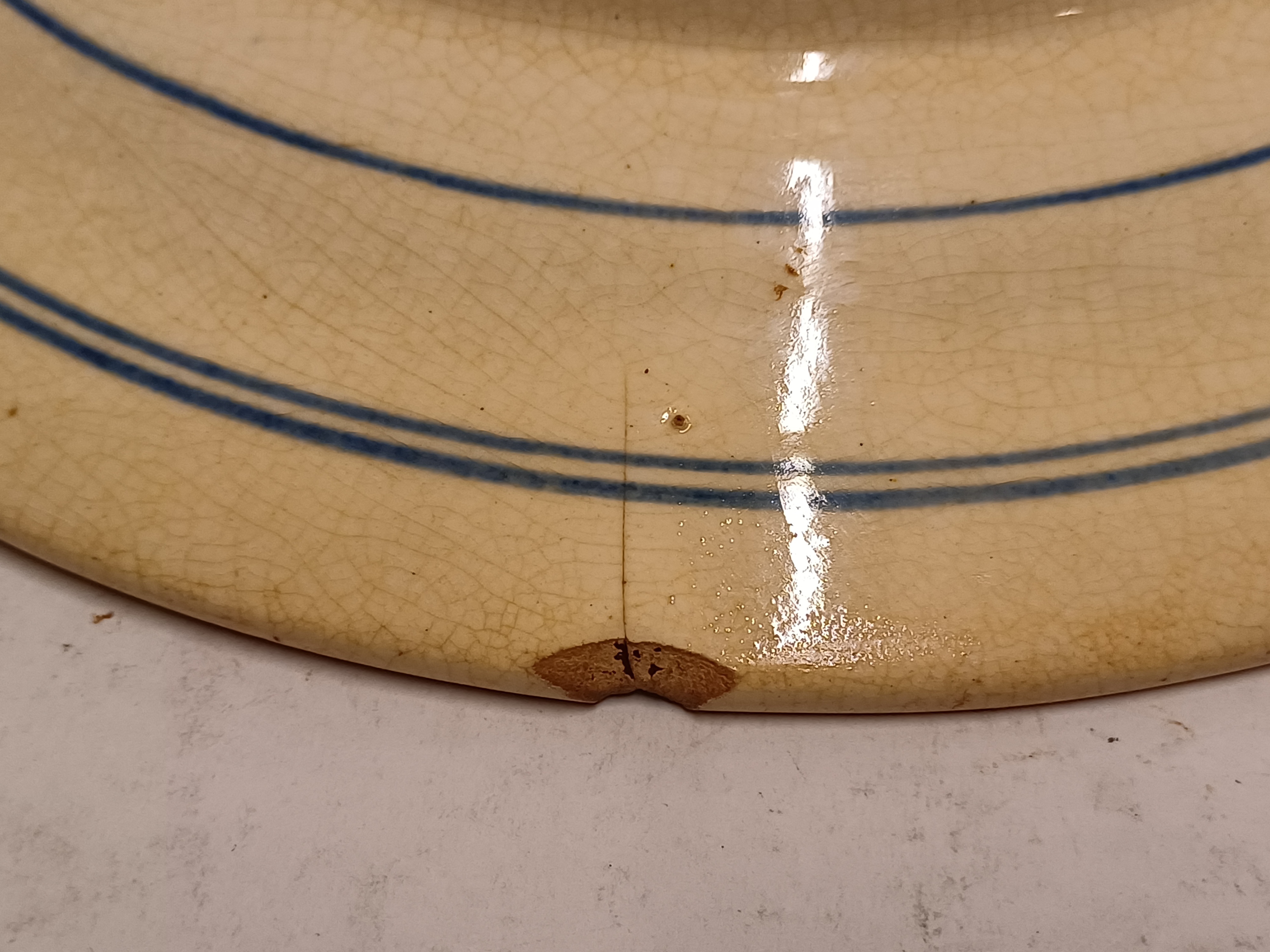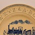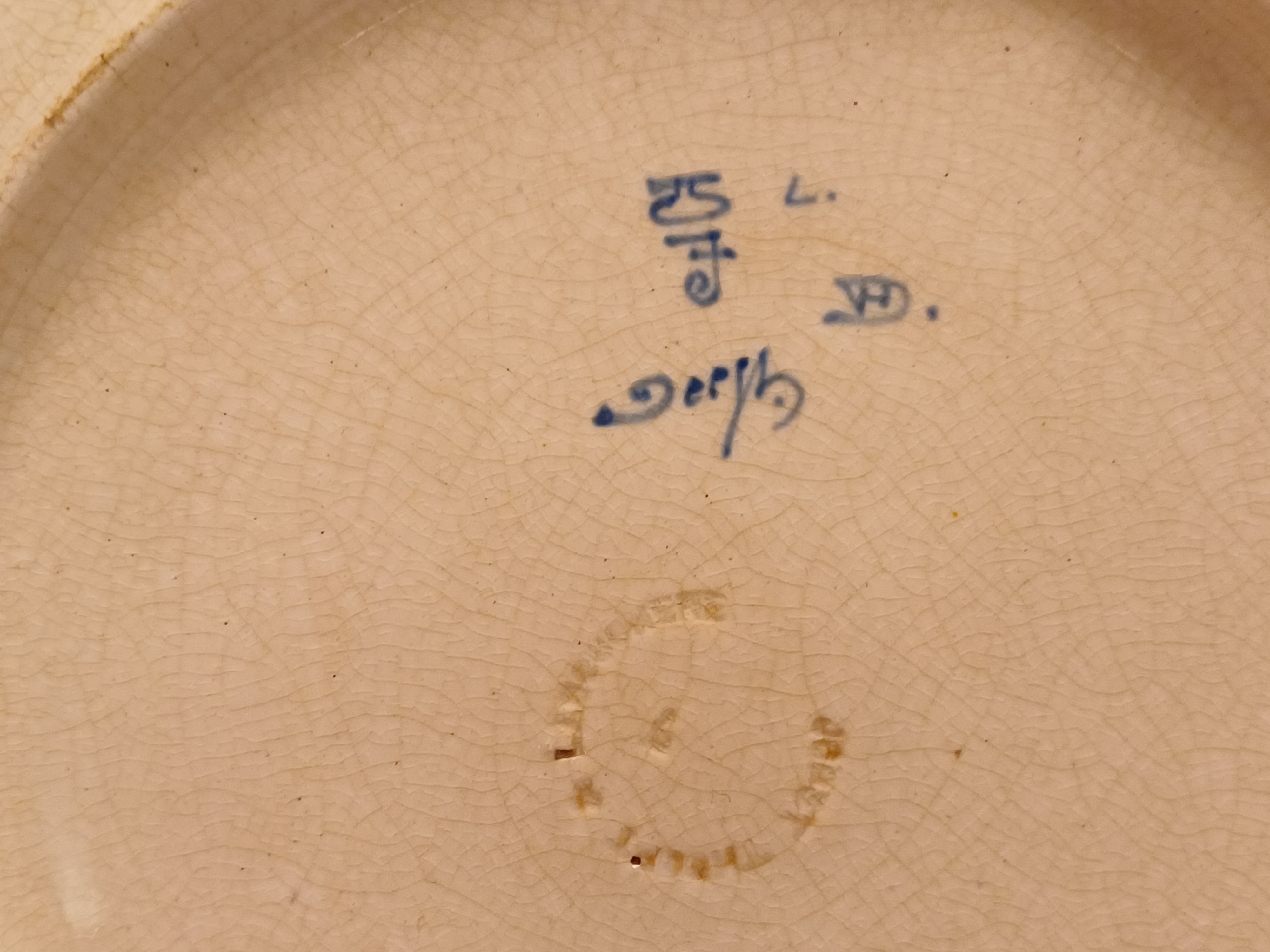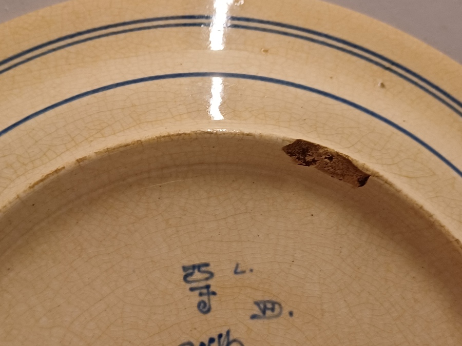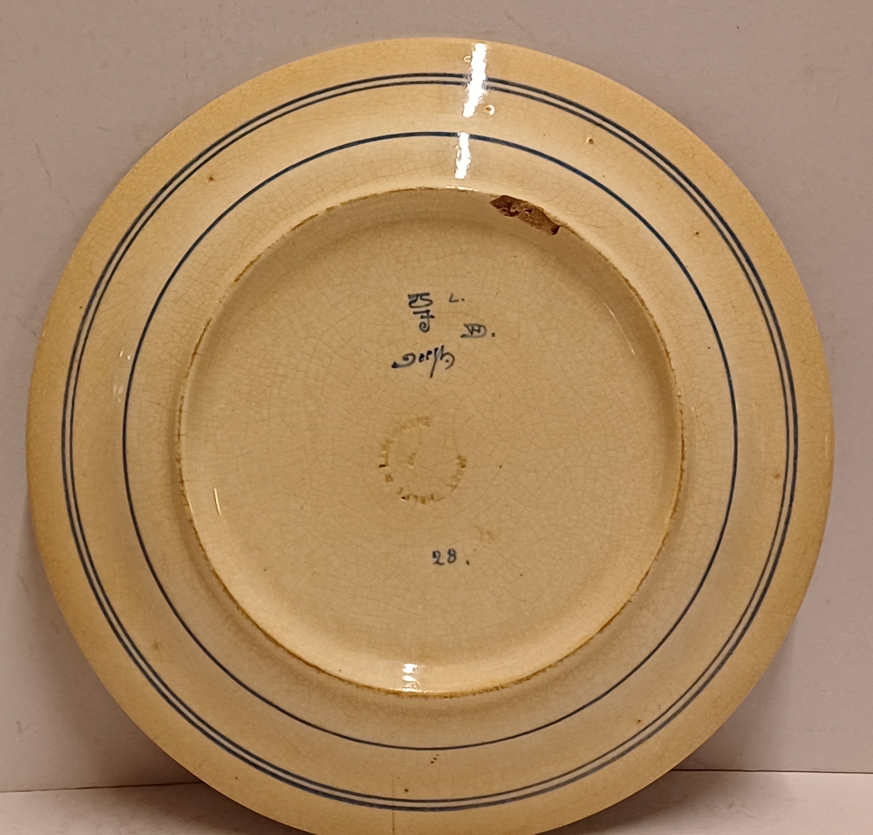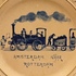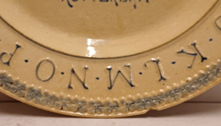 Aardewerken bord met relief decor op de lip van het alfabet, op het plat geschilderd decor van de stoomtrein van Amsterdam naar Rotterdam. Achterzijde met fabrieksmerk en jaarletter L = 1890