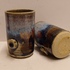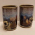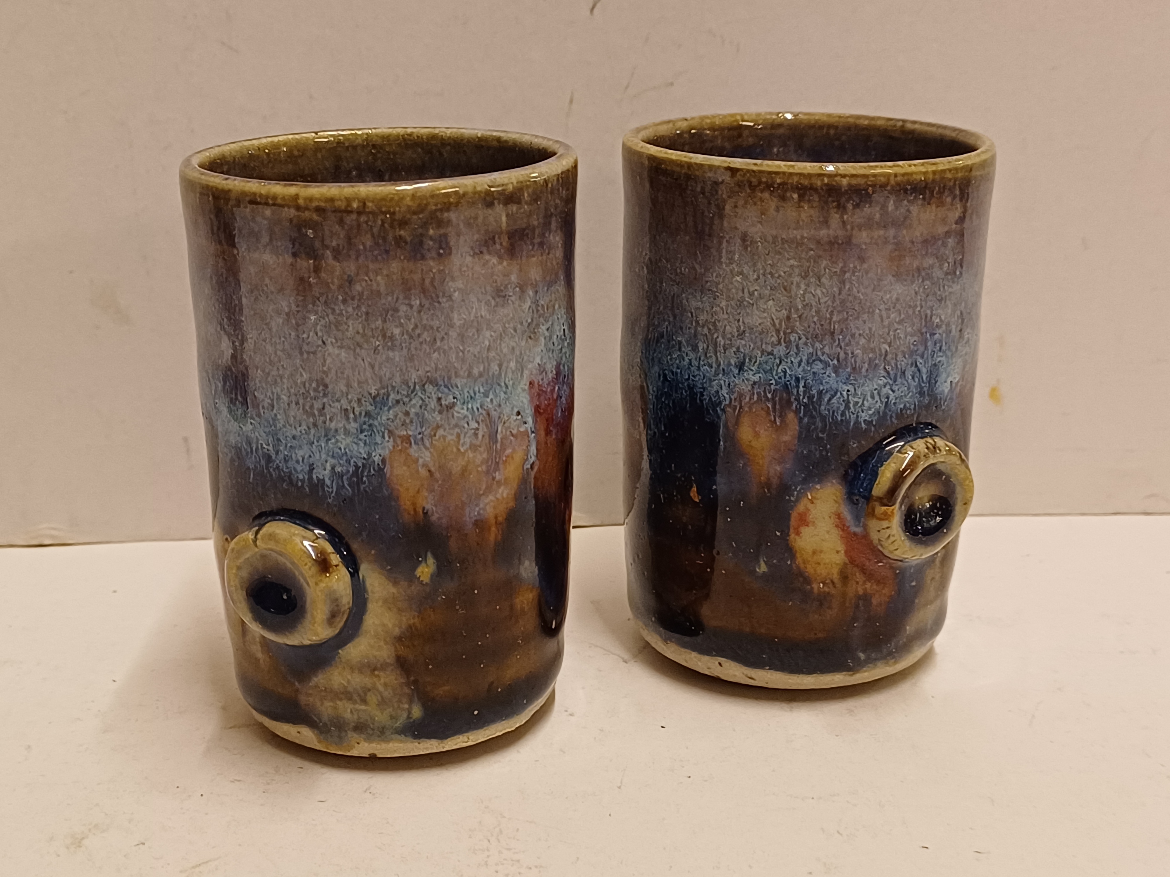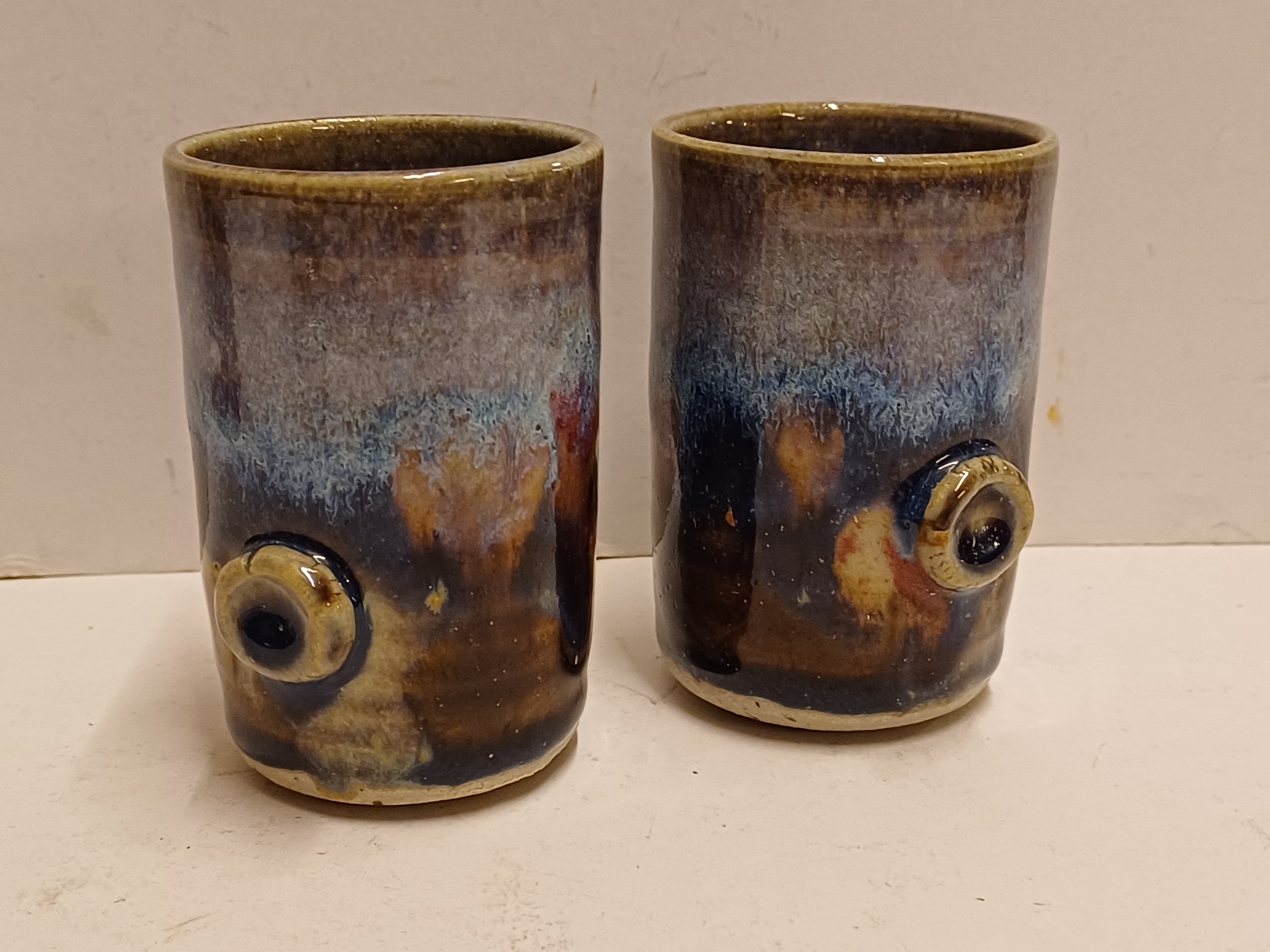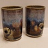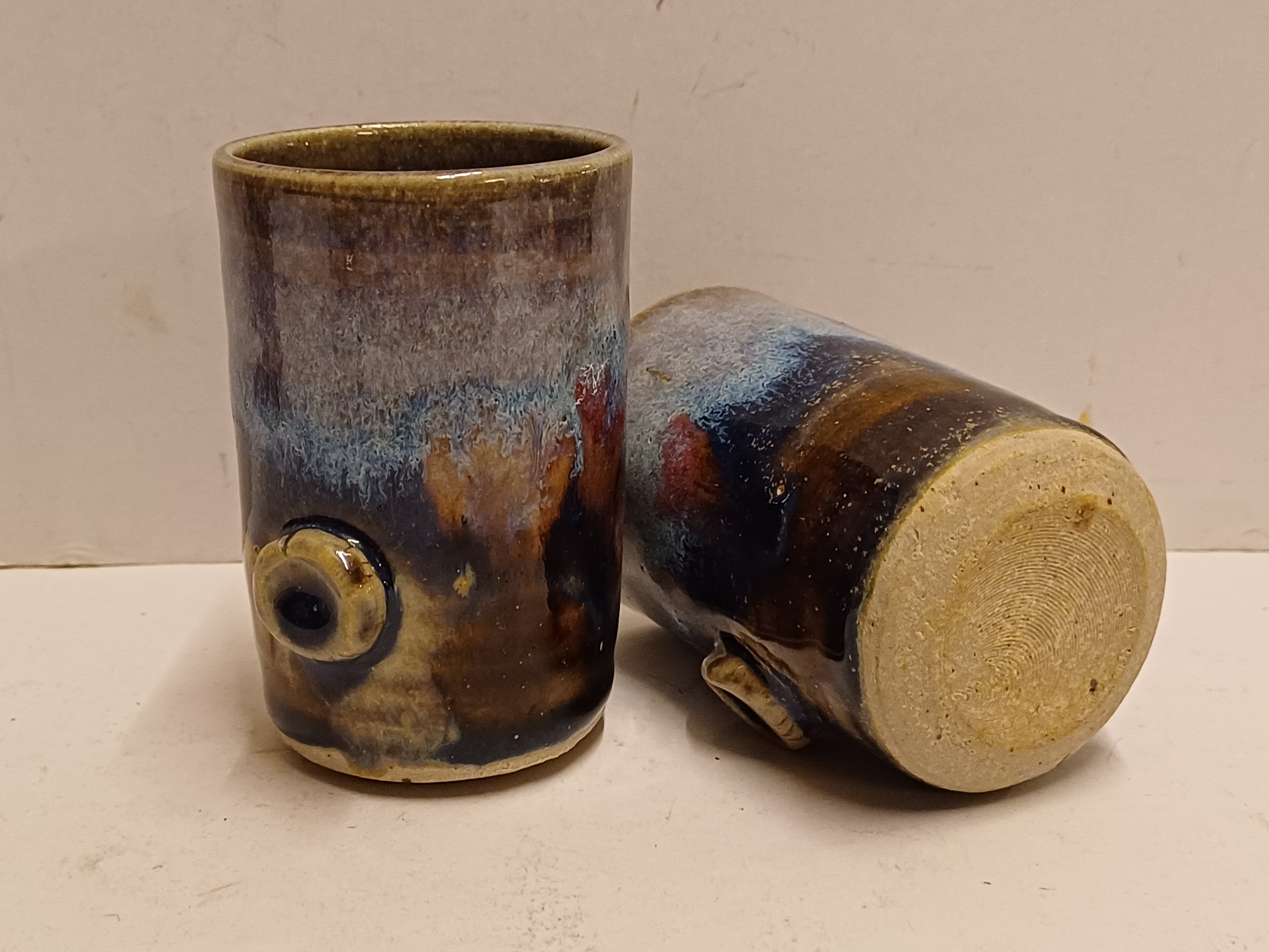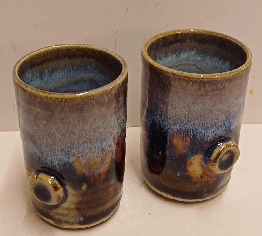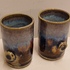 2 tazas cilíndricas con esmalte flameado en tonos púrpura. No están firmadas.