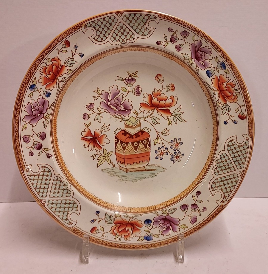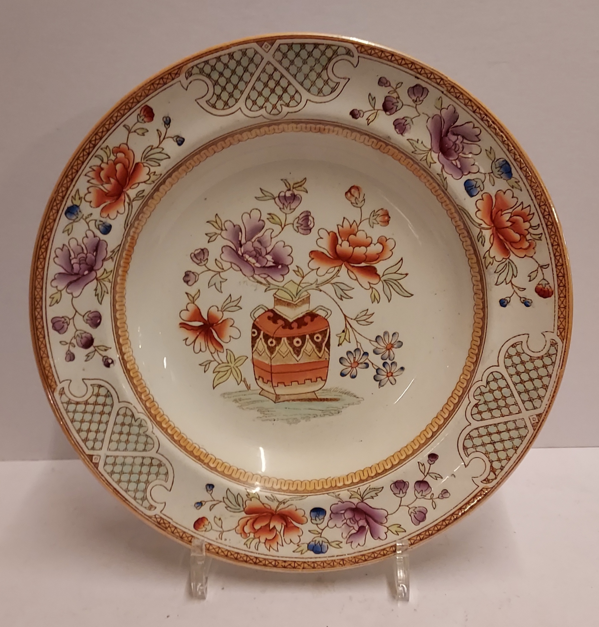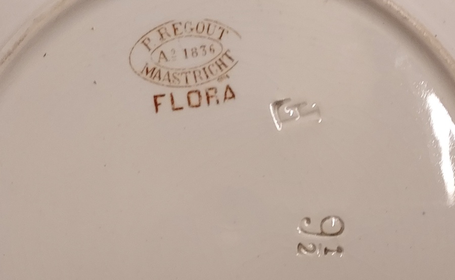 Monocromo marrón con pintura policroma sobre esmalte. Parte trasera con marca ovalada de fábrica y fecha en turba ilegible.